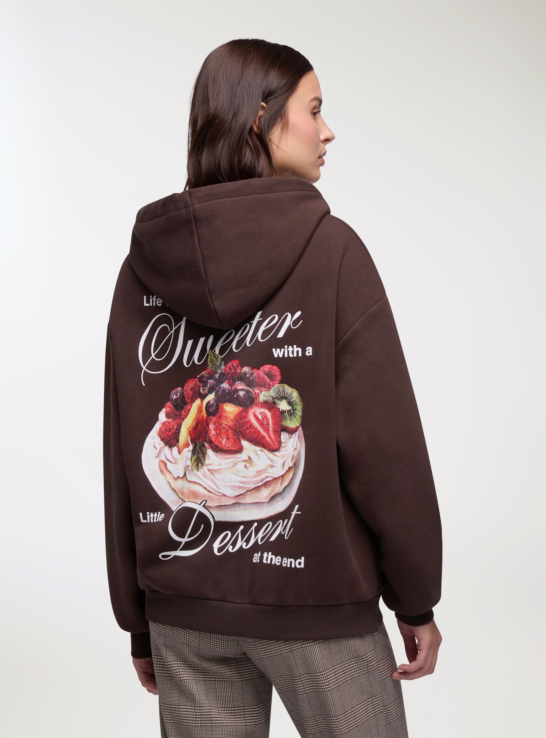 Women's hoodie with adjustable hood and kangaroo pocket, ideal for leisure time and casual looks. Solid colour design with embroidered writing on the chest, print on the back. Comfortable fit, perfect with jeans or leggings and under light jackets. Zip-free, it offers everyday comfort and a versatile style for the city or day-off moments.Details