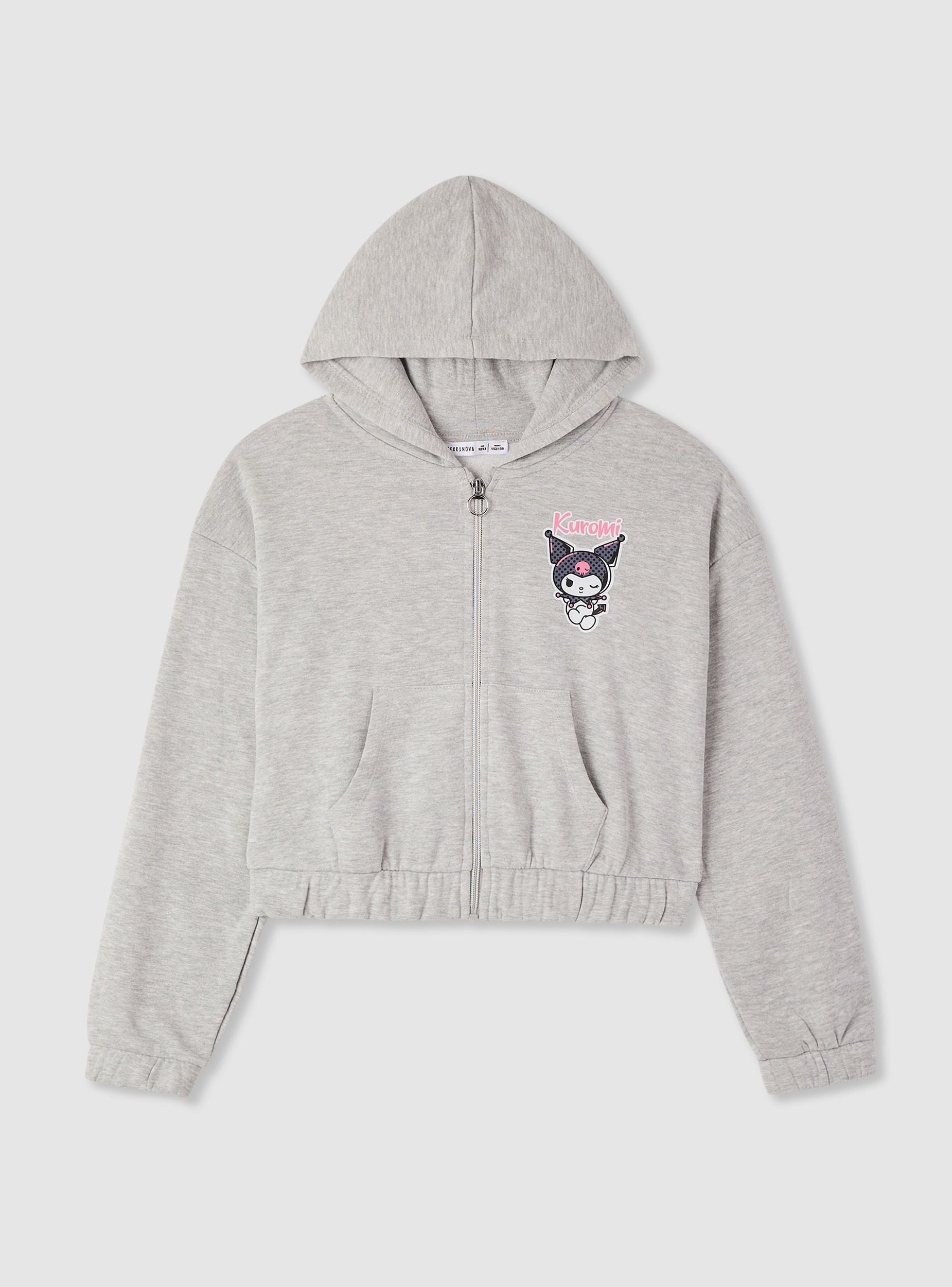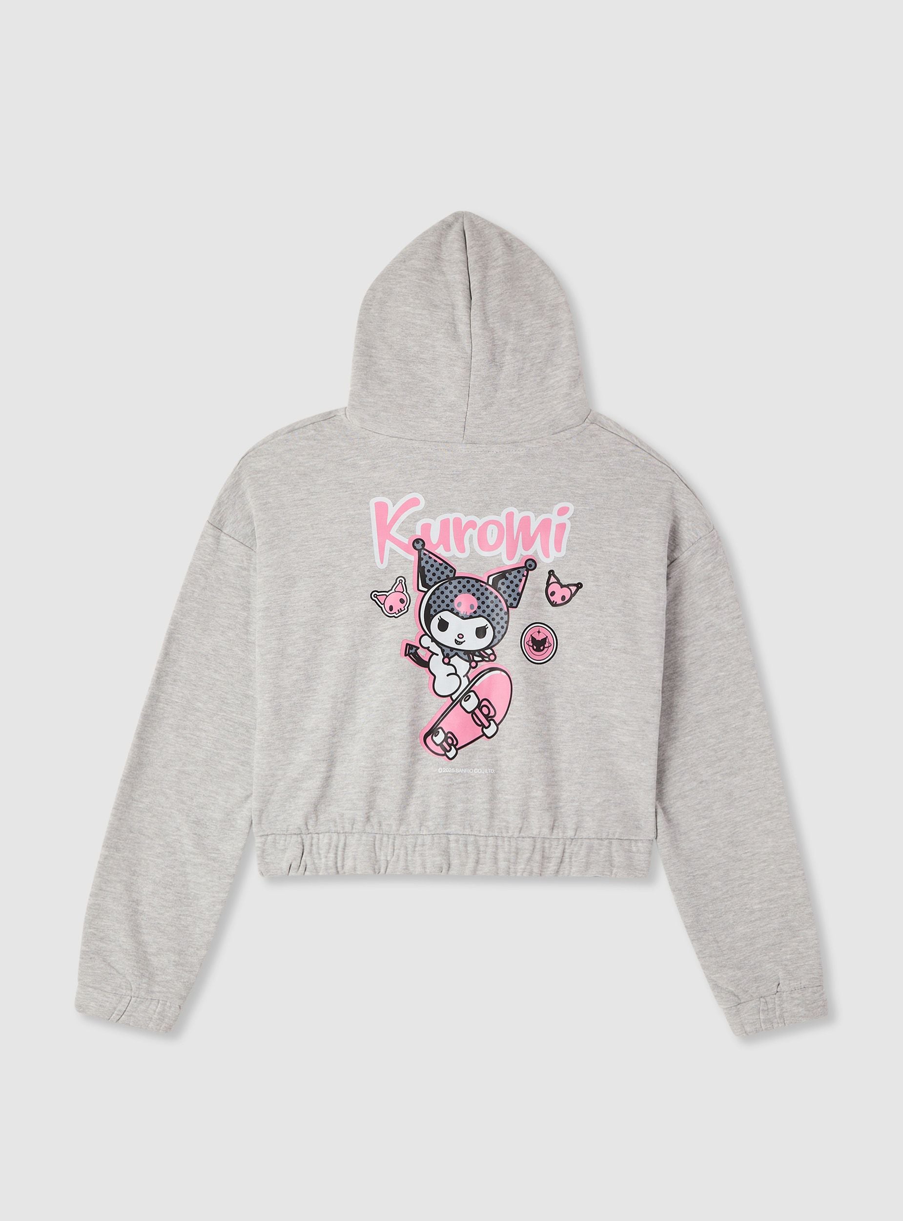 Girls' hoodie with front zip, cropped length, and elasticated gathered hem. Features kangaroo pockets and Kuromi® print on the chest and back, ideal for casual and urban looks. Perfect over a t-shirt and jeans or with joggers for leisure time. Long sleeves with elasticated cuffs and a comfortable fit that ensures freedom of movement.Details