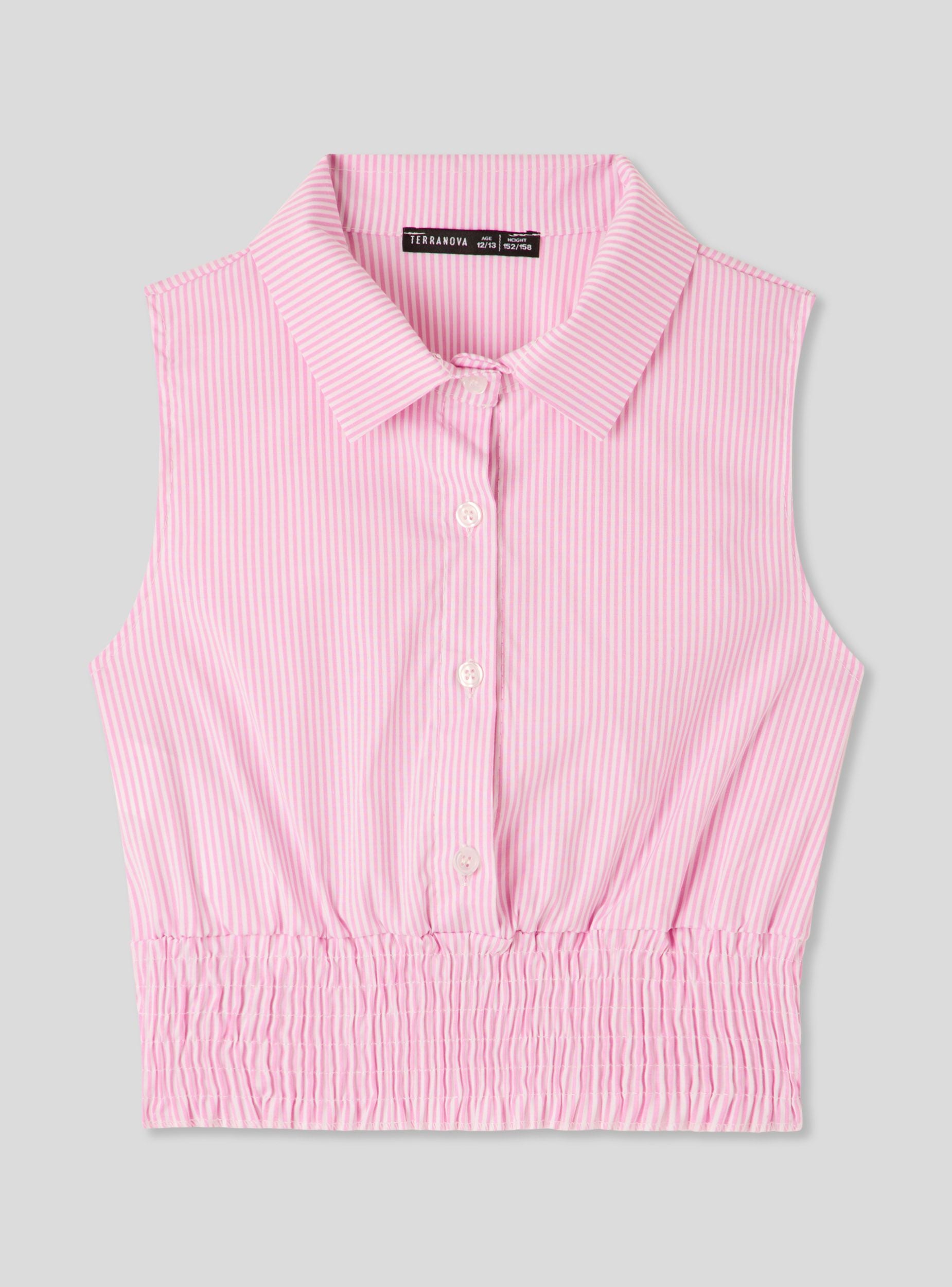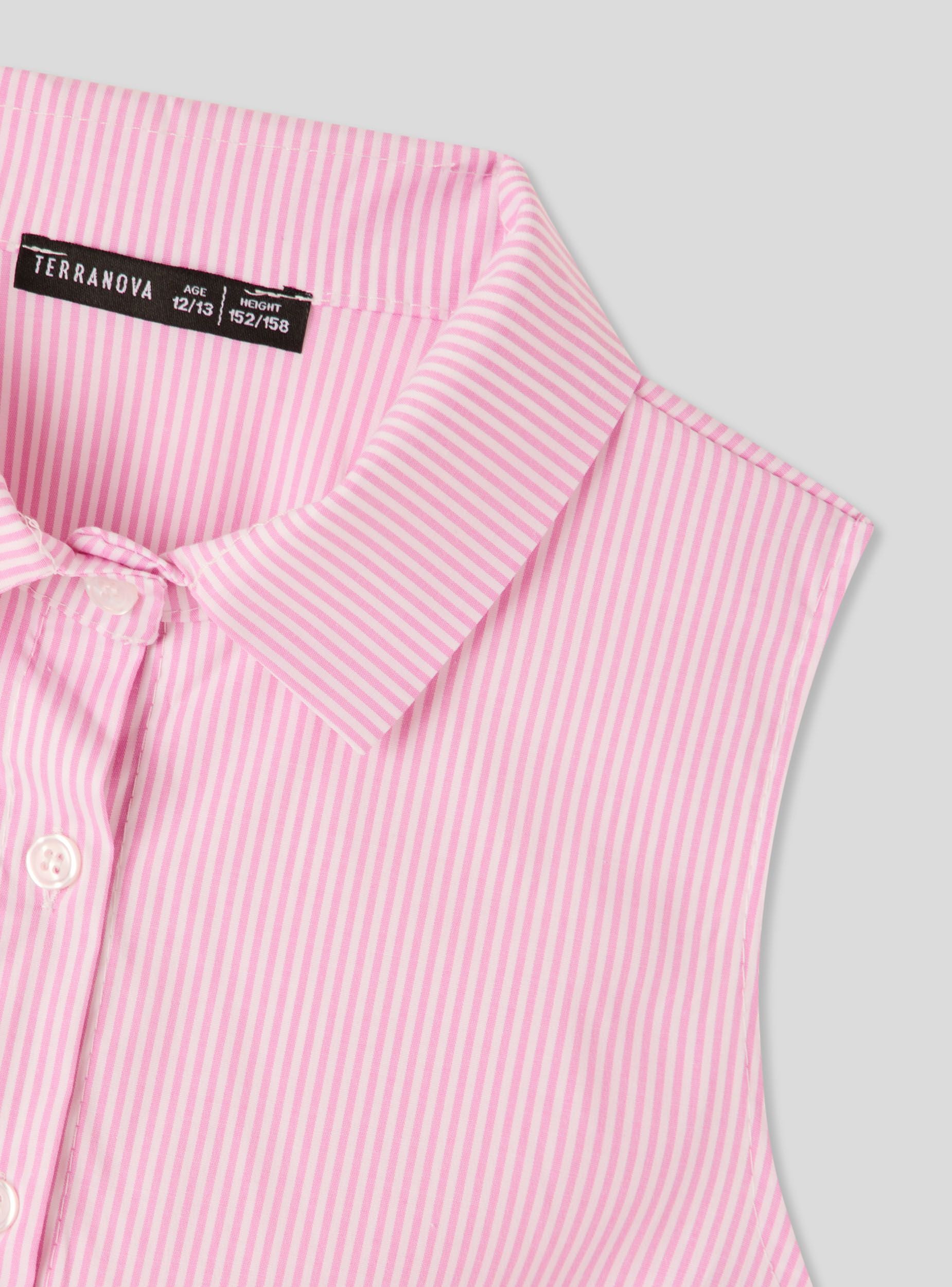 Sleeveless striped shirt for girls, ideal for fresh and versatile looks on warmer days. The model features a classic collar, front buttoning, and an elasticated hem that enhances the silhouette. Perfect for pairing with shorts or skirts for a casual yet polished style, it stands out for its comfortable fit and sleeveless design, suitable for multiple occasions.Details