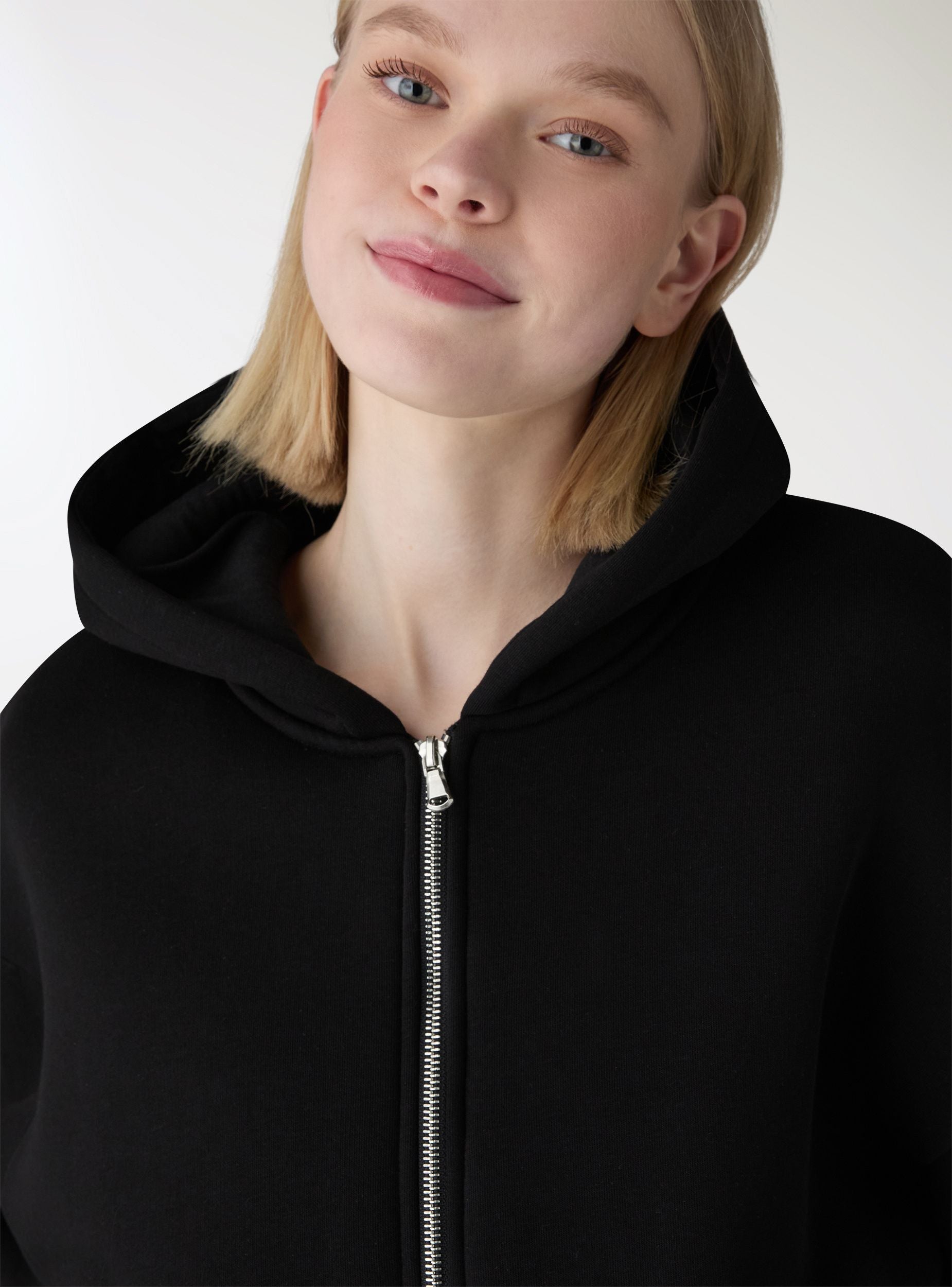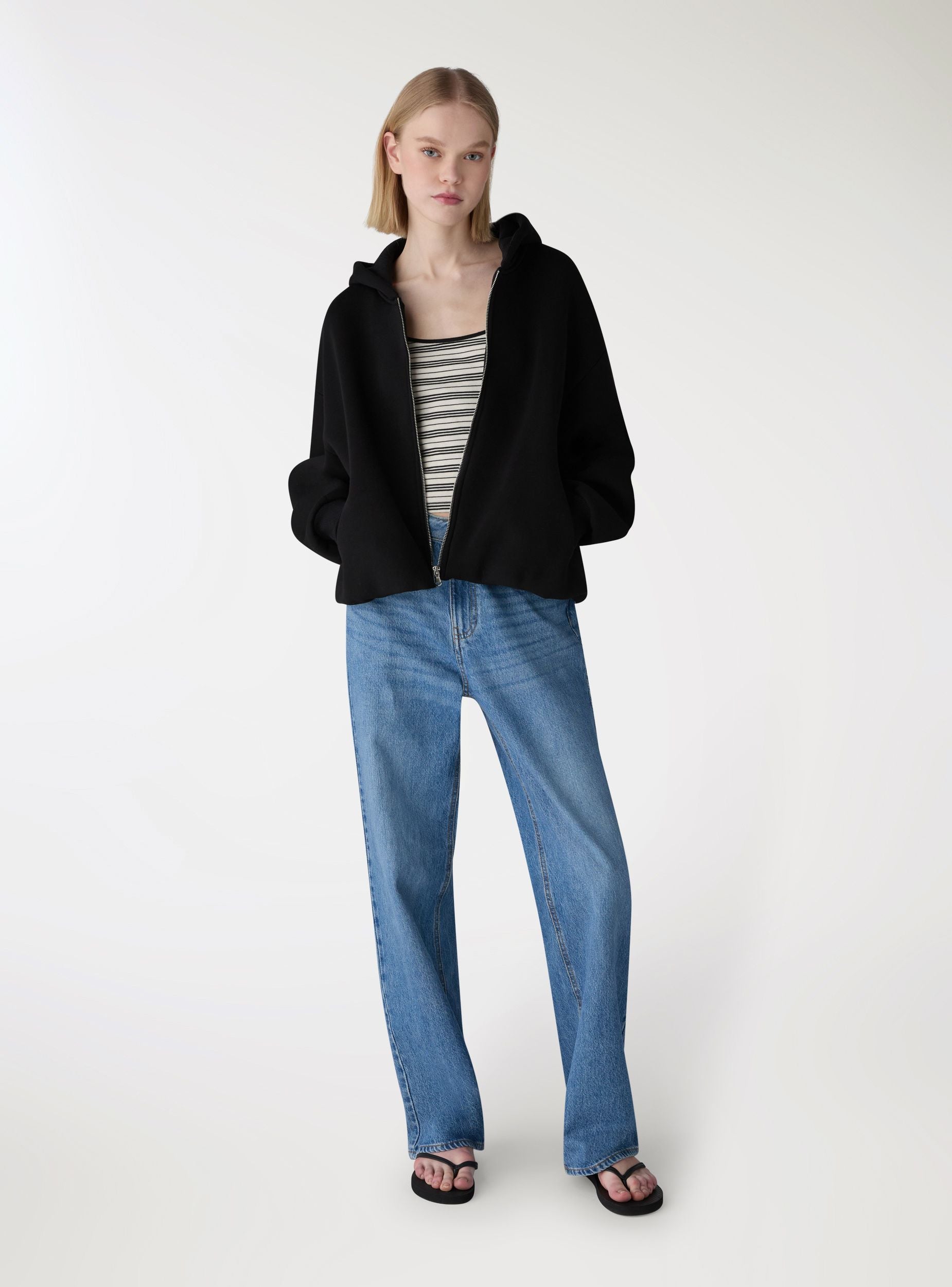 Women's hoodie with zip, lightweight and featuring a wide balloon silhouette that offers an oversized aesthetic with refined comfort. In a solid colour, it stands out for its long sleeves with ribbed cuffs and welt side pockets for a look attentive to detail. The front zip allows it to be worn open as layering or closed for a complete outfit. Ideal for leisure time, it pairs easily with wide-leg jeans or sporty trousers for a casual and modern result.Details