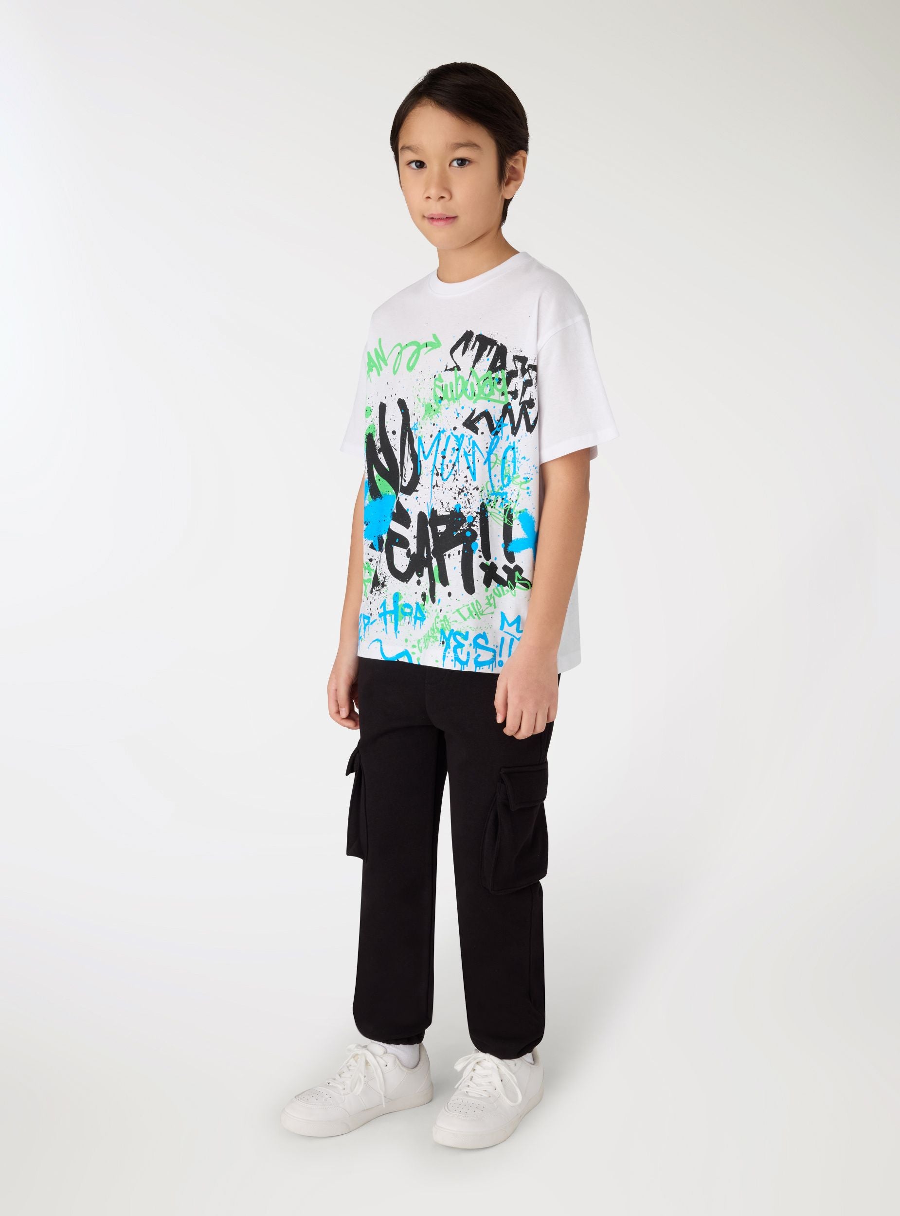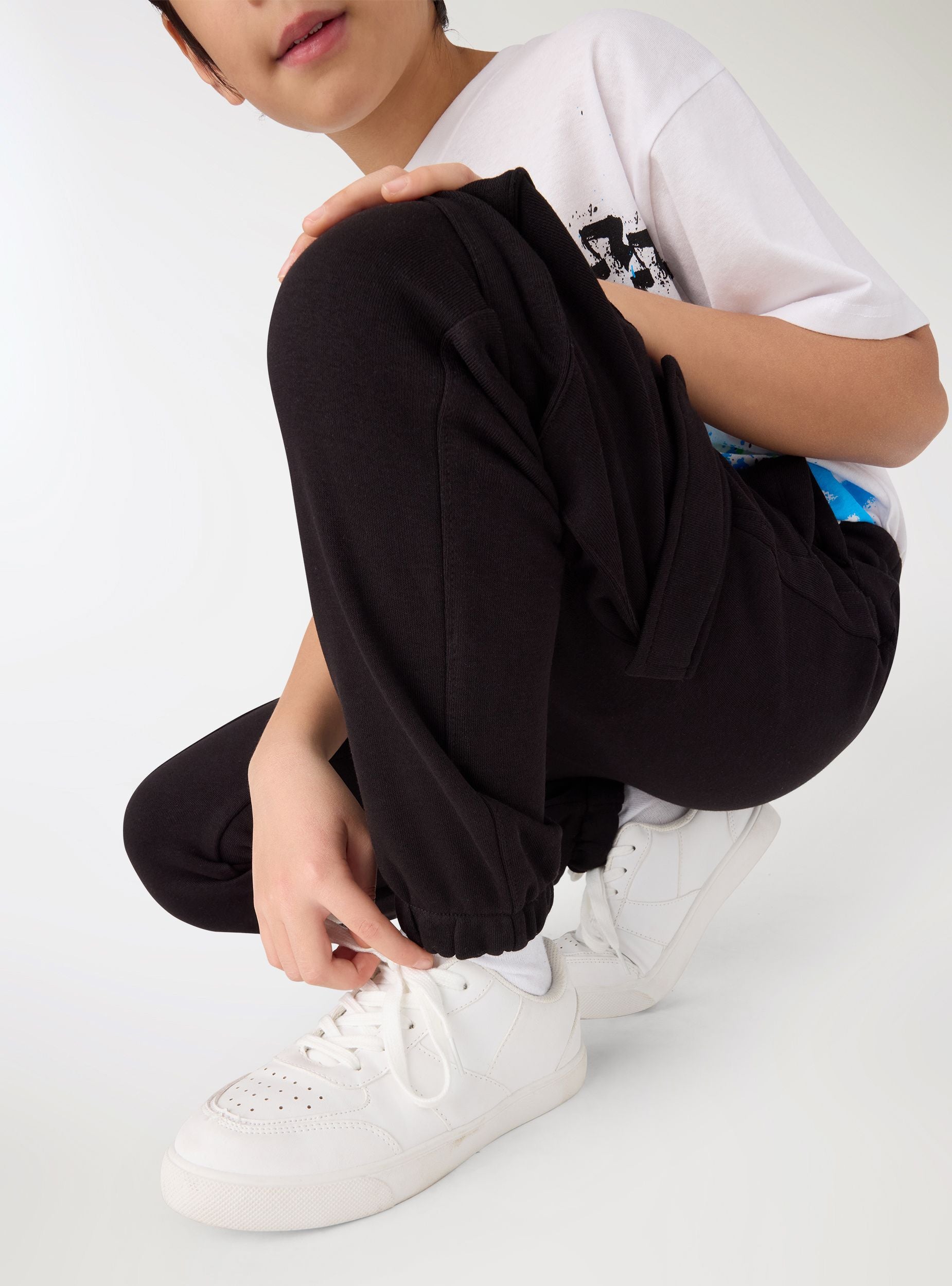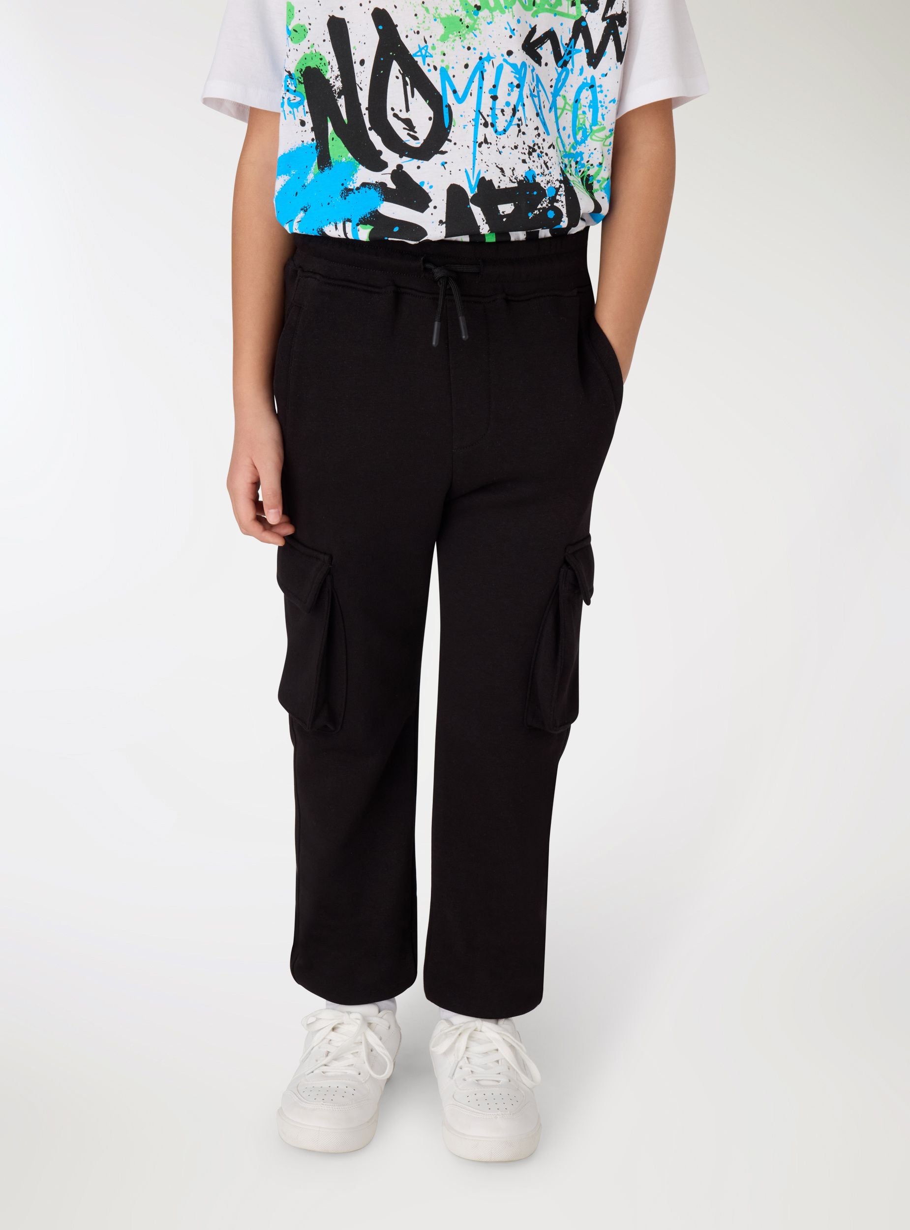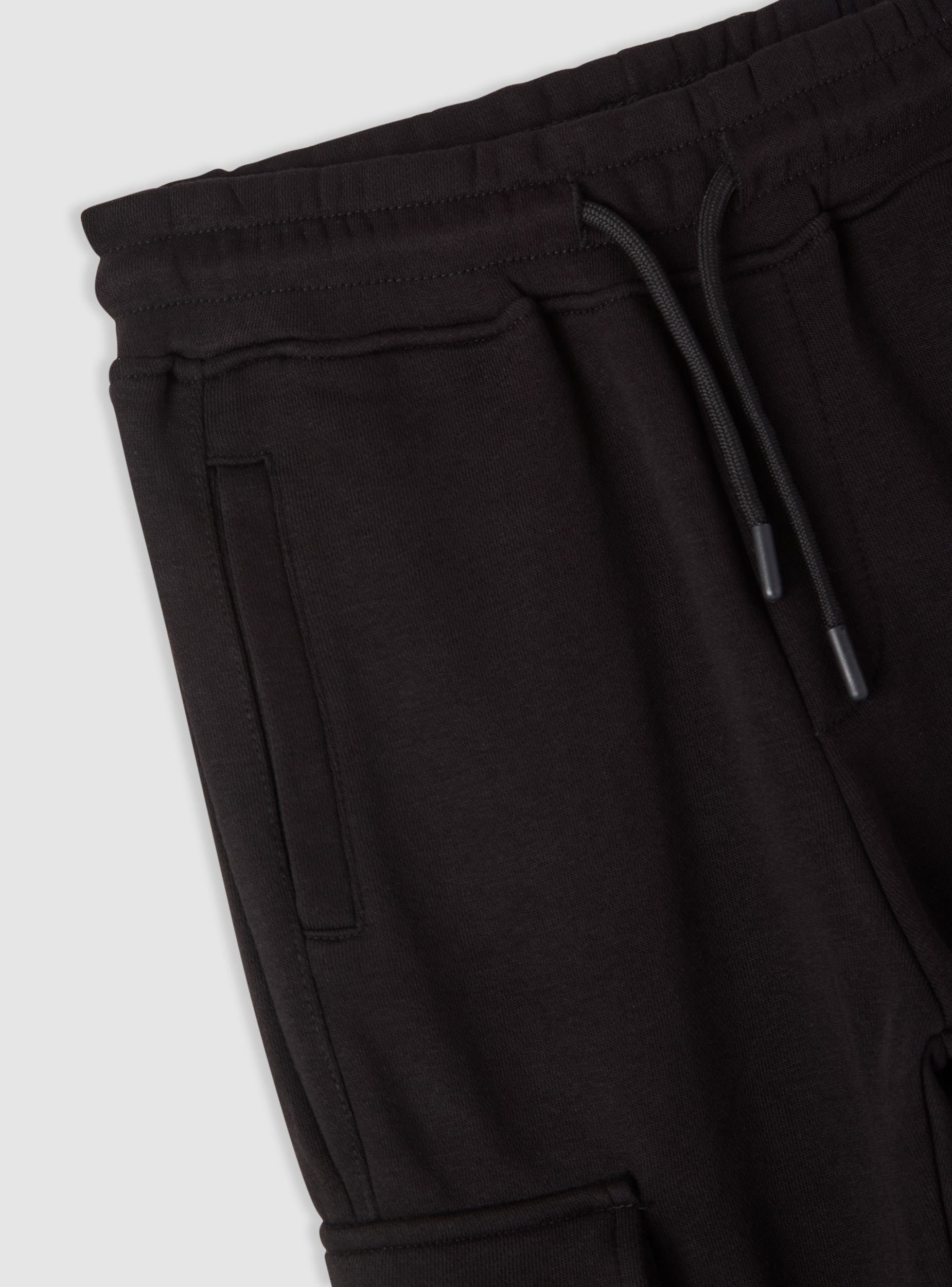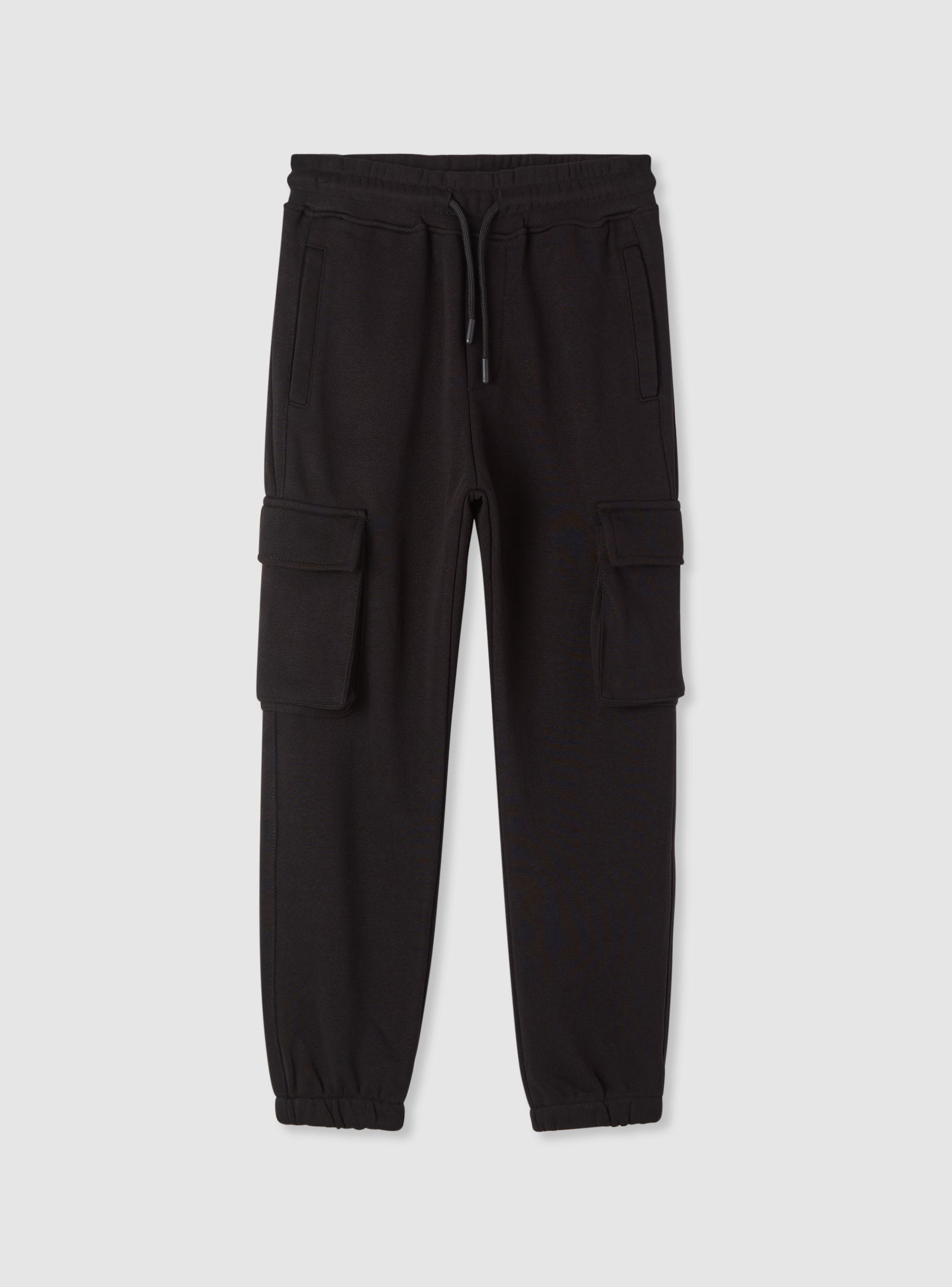Plain-coloured children's joggers with a regular fit, ideal for school, leisure, and sports. Elasticated waistband with adjustable drawstring and elasticated cuffs for added comfort. Side welt pockets for essentials and roomy cargo pockets. Easy to pair with sweatshirts or T-shirts for practical and dynamic outfits with a long cut. Lightweight fabric.Details