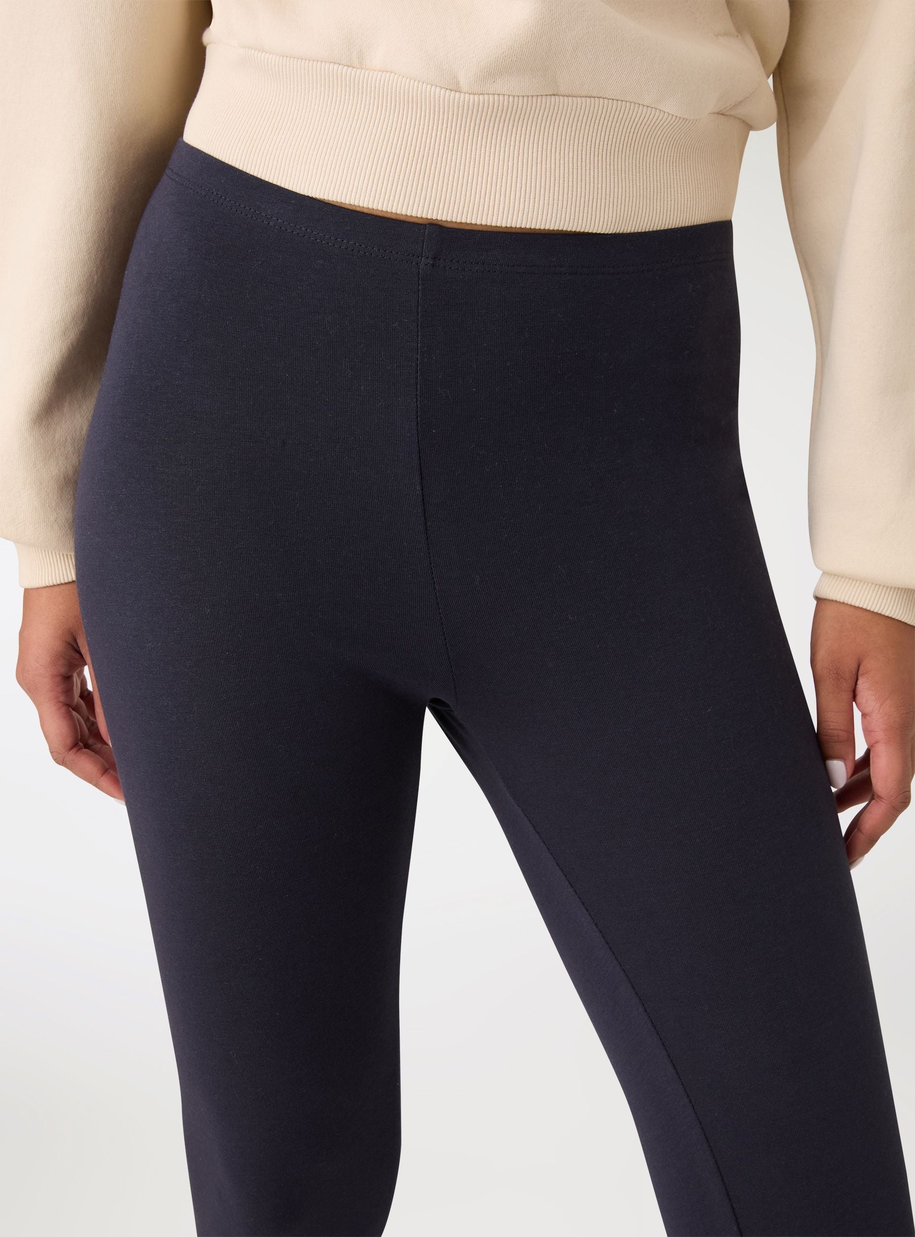 Women's long solid-colour leggings. Elasticated waistband for everyday comfort, ideal for leisure time or to complete casual looks with sweatshirts, oversized t-shirts, or cardigans. Essential design without pockets, a slim fit that follows the leg, and clean finishes. Perfect under long shirts or with trainers for a practical and versatile outfit.Details