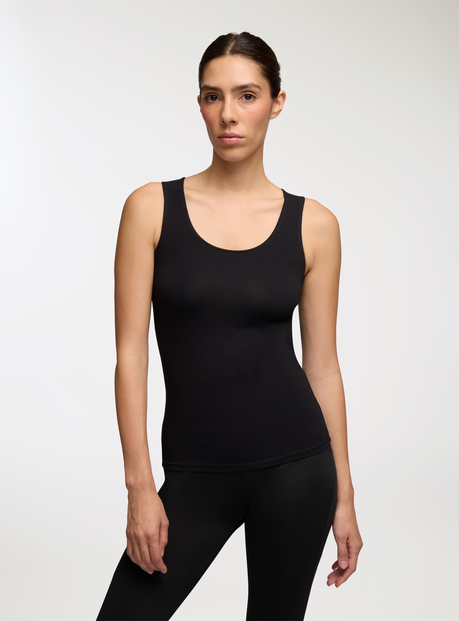 Pack of three women's vests, made from soft, stretchy plain cotton fabric. Each vest offers exceptional comfort thanks to the breathability and softness of cotton, ideal for everyday wear. The sleeveless design and fitted cut enhance the silhouette, making them perfect to wear alone or under other garments. Add versatility to your wardrobe with this practical pack of three basic vests.Details