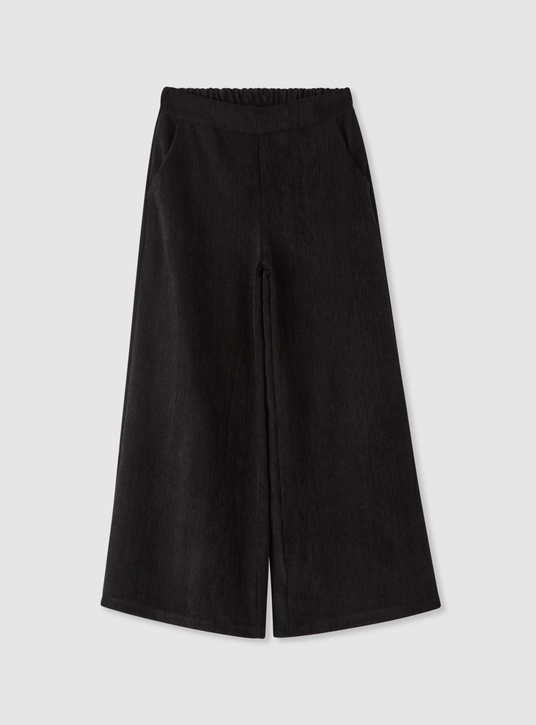 Girls' plain-coloured trousers with a wide-leg cut and ankle-length. Elasticated waistband at the back for greater comfort and easy fit, with no fastenings. Side pockets to hold small items. Perfect for school and leisure, they pair well with a T-shirt and trainers or a jumper and ankle boots for a polished look. Heavy fabric.Details