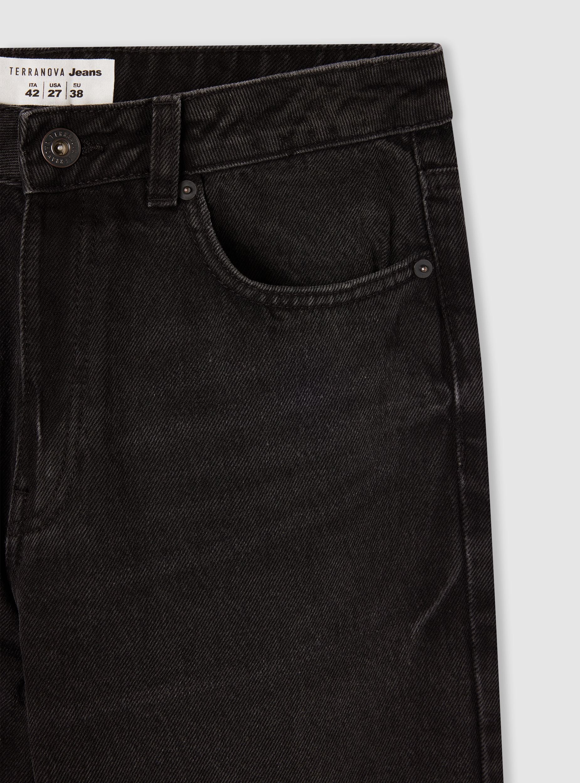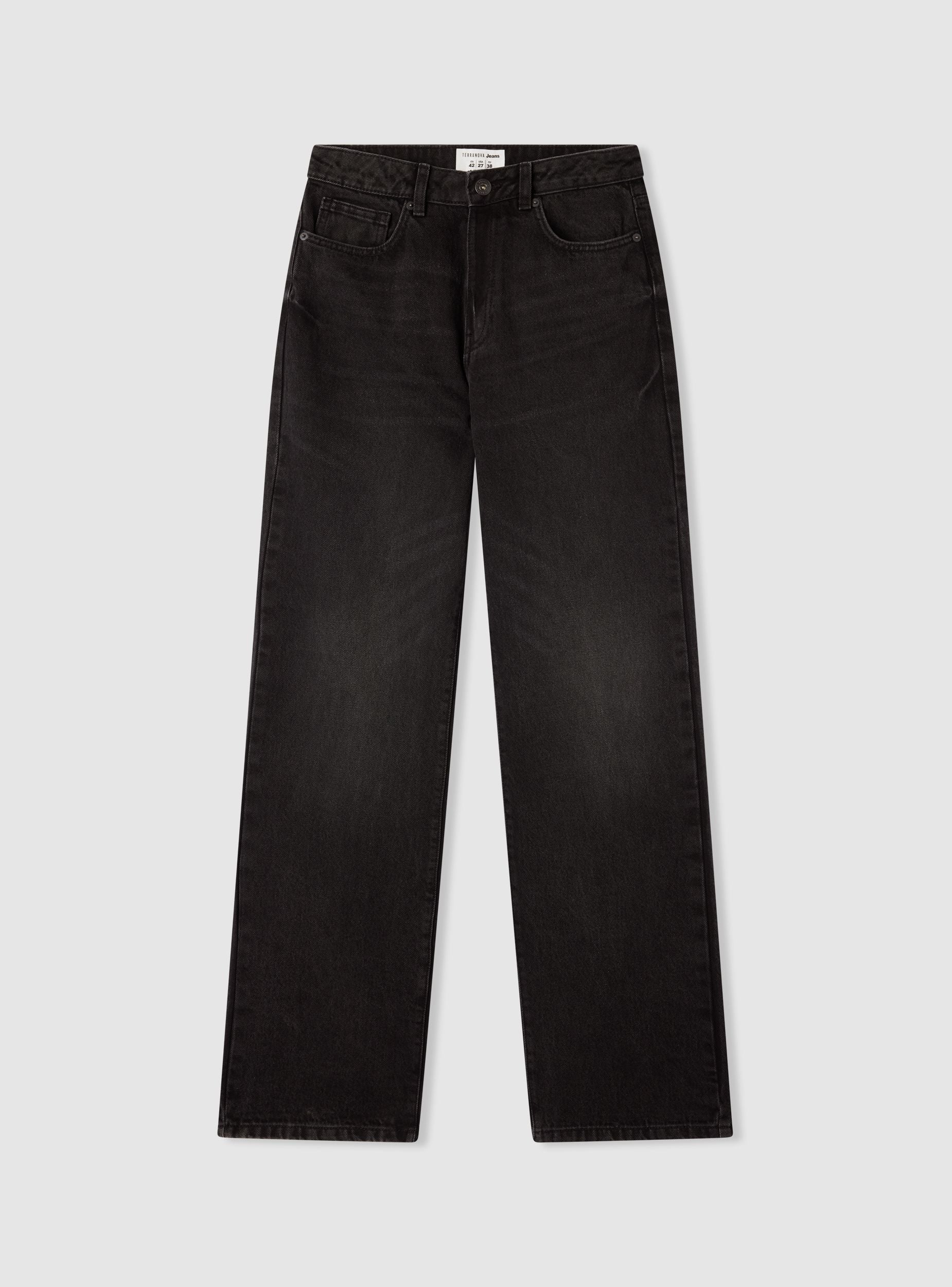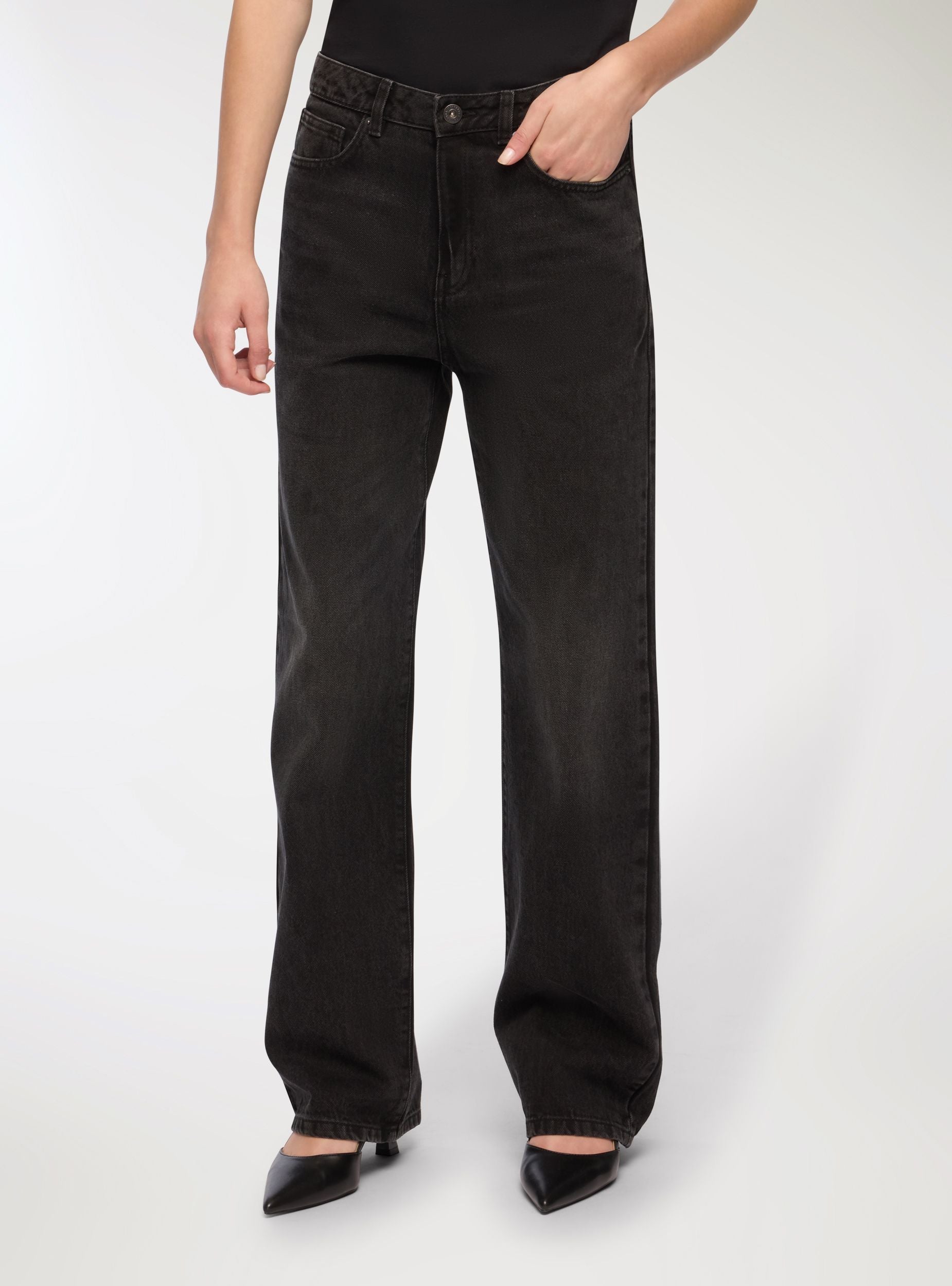 Women's straight leg jeans, ideal for a casual and versatile look. They feature a five-pocket design and a button and zip closure. Perfect to pair with t-shirts or shirts for an everyday outfit. Their long, straight cut ensures comfort and style, making them suitable for various occasions.