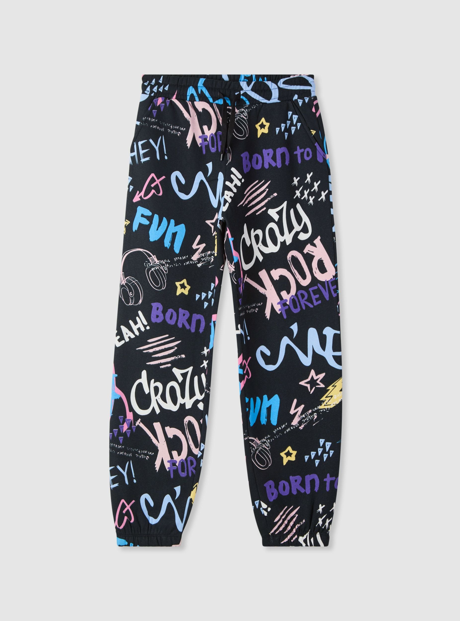 Heavy children's tracksuit pants with graffiti print. Ideal for a casual and sporty look, these pants offer comfort and style for play or relaxing days. The elastic waistband with drawstring ensures a perfect fit, while the design with side pockets and vibrant graffiti-style print makes them a unique and original piece. Perfect to pair with t-shirts and sweatshirts for a dynamic outfit.Details
