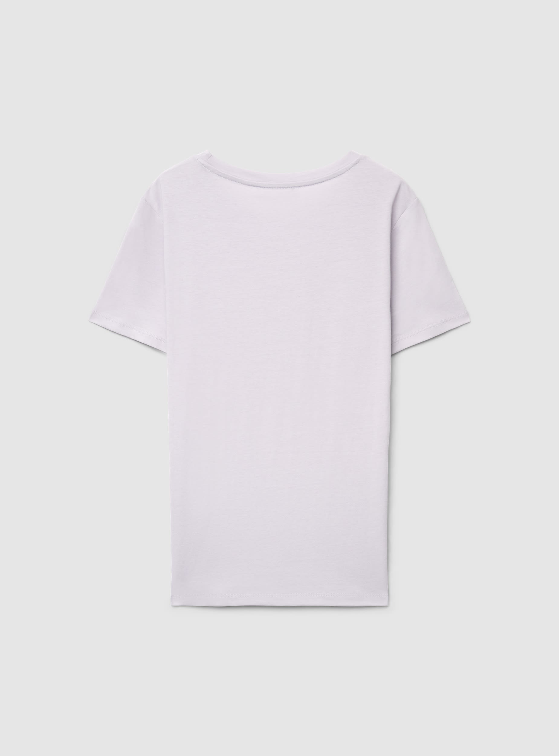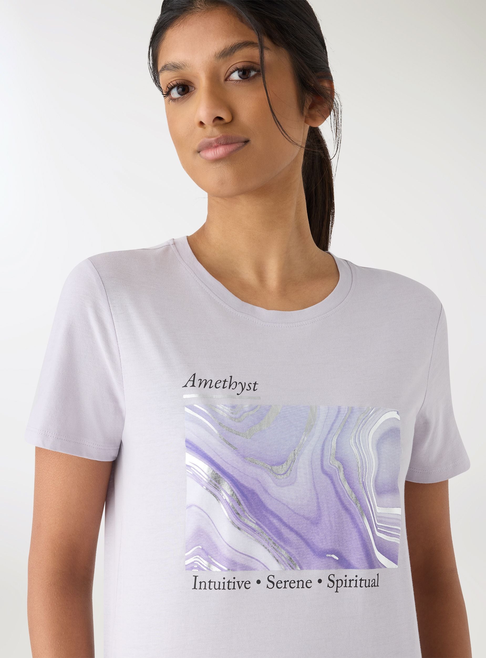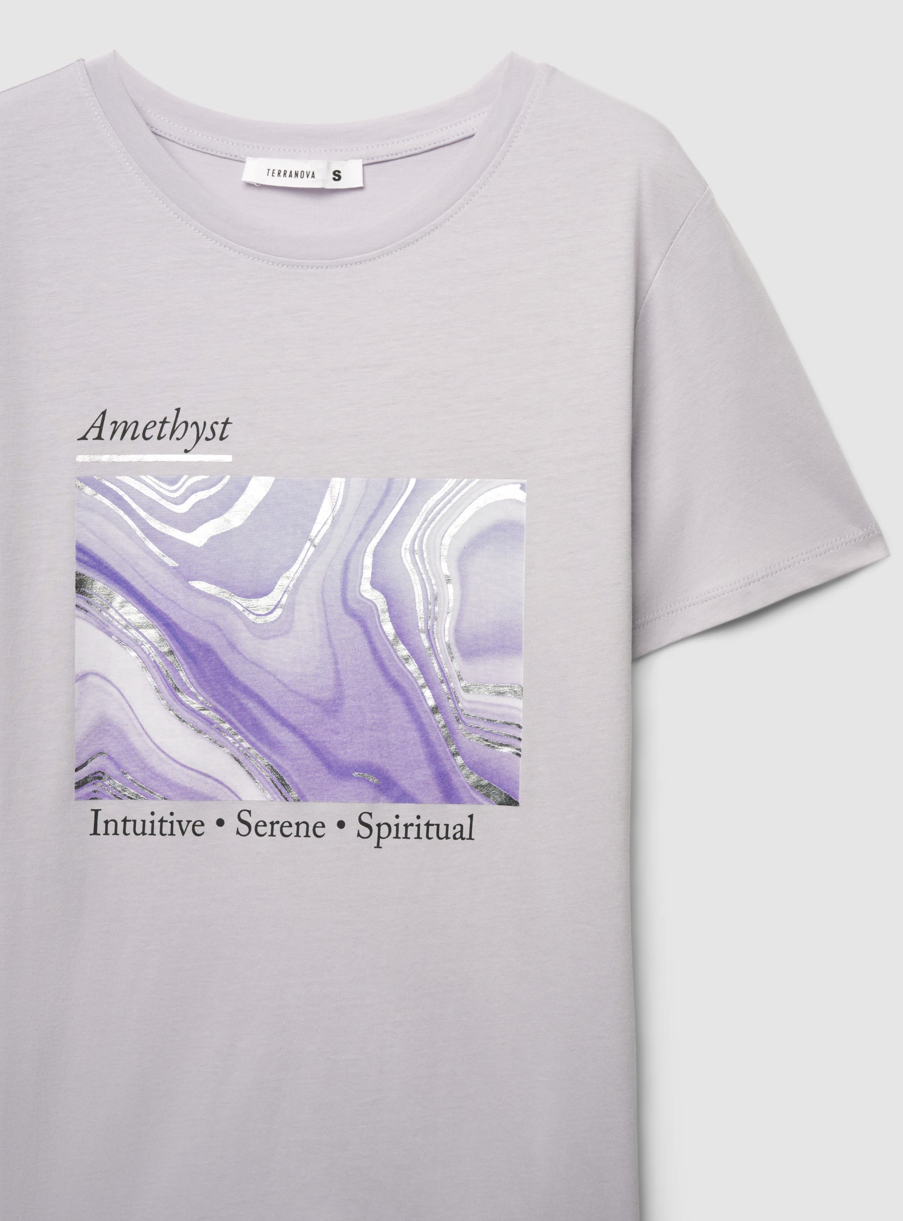 Women's t-shirt with a front mineral-themed print and sparkling effect details. Crew neck, short sleeves, and a regular fit perfect for leisure time. Easy to pair with jeans or skirts for a casual look, it can be worn under light jackets or zipless sweatshirts. The clean design highlights the graphic with lettering, making it ideal for everyday outfits.Details