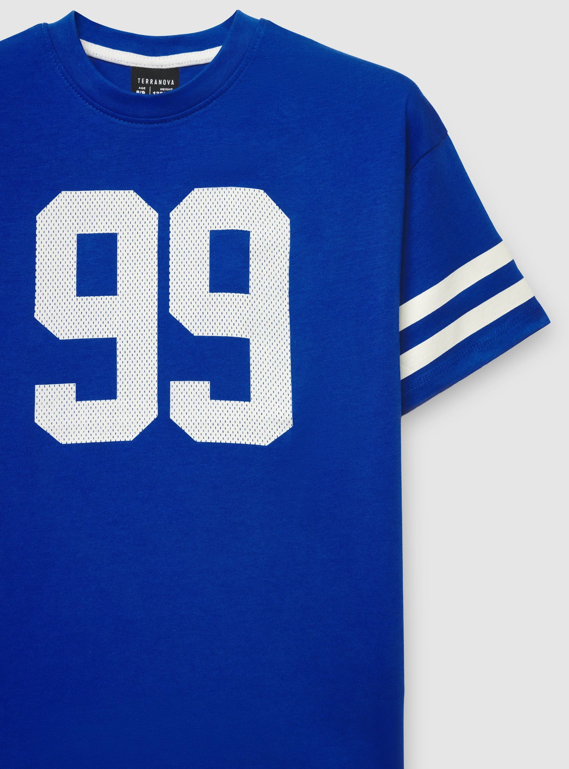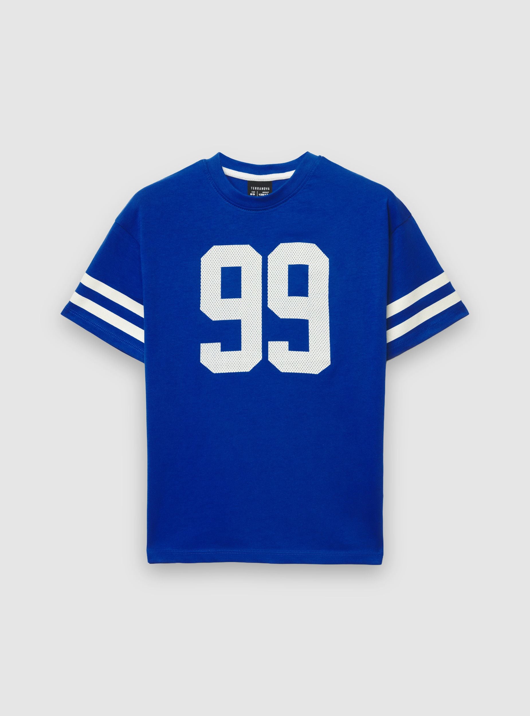 Children's t-shirt with a numeric print on the front and short sleeves decorated with double stripes, perfect for a sporty look. Round neck and regular fit, ideal for school or leisure time. Easily pairs with jeans, shorts, or joggers for dynamic outfits.Details
