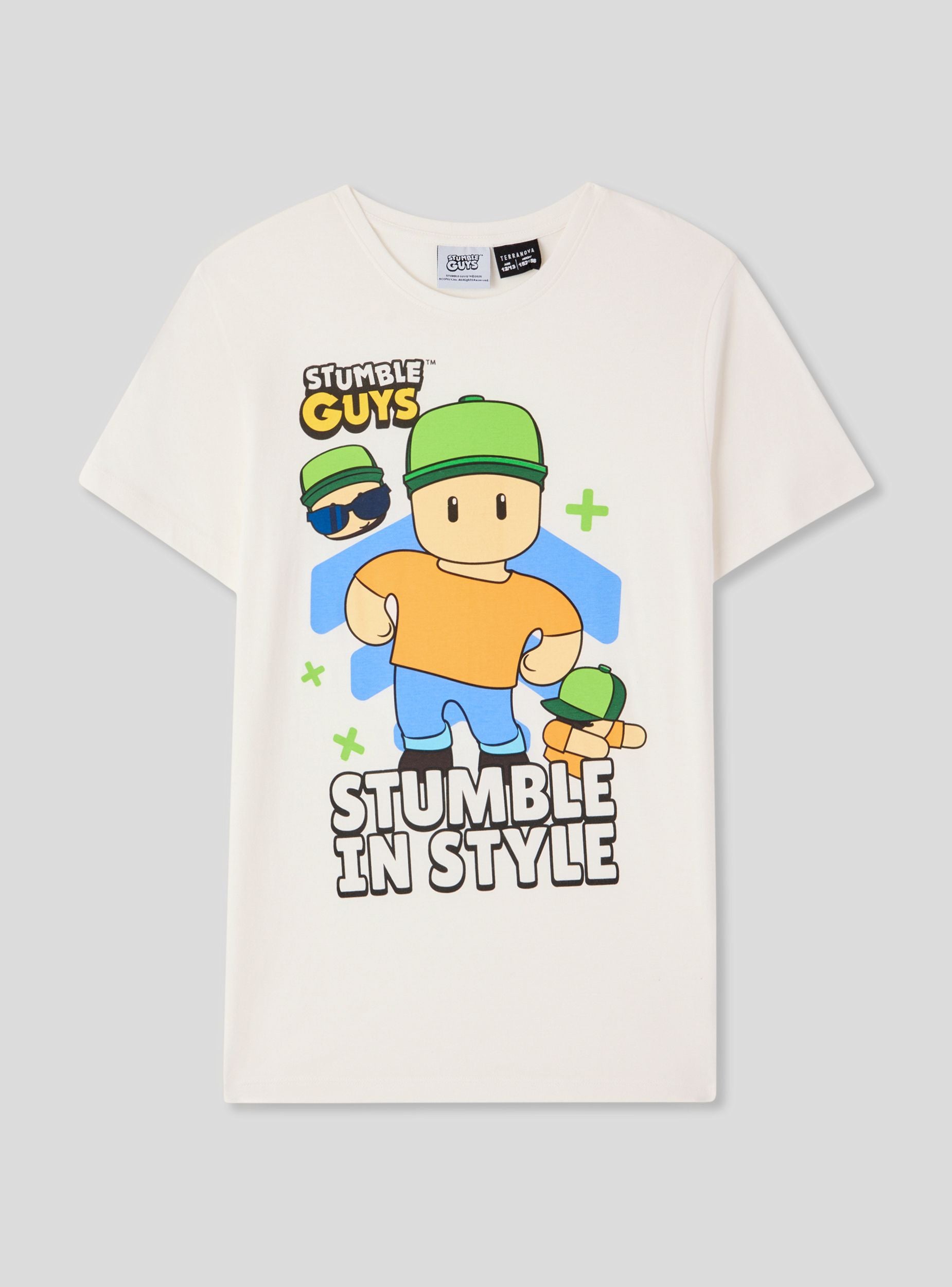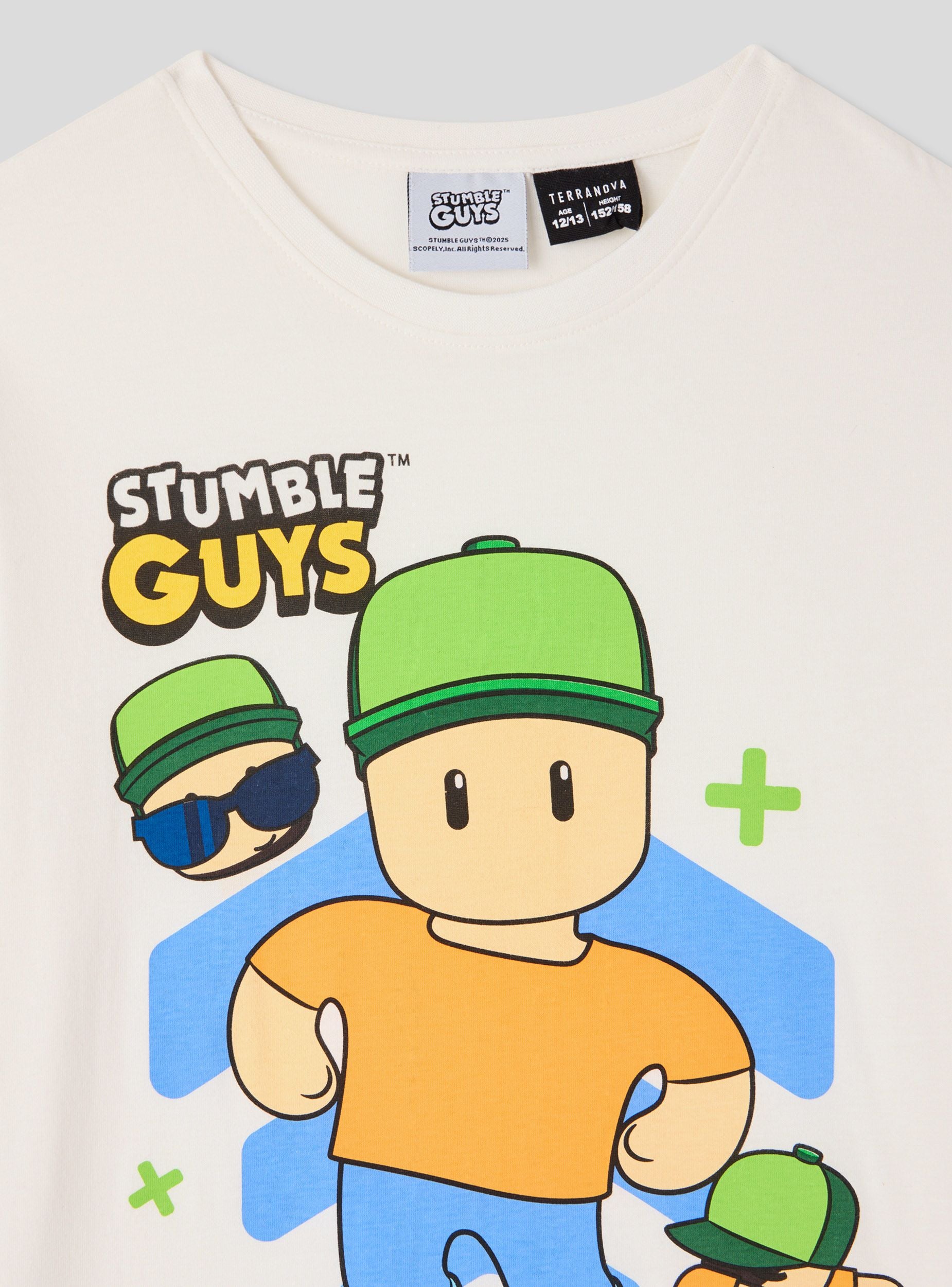 Children's t-shirt with a front print inspired by the popular video game Stumble Guys®. The model features short sleeves, a crew neck, and a regular fit, making it ideal for everyday wear and leisure time. Perfect to pair with jeans or shorts for a playful and casual look, it is designed to accompany little ones on their adventures in style and comfort.Details