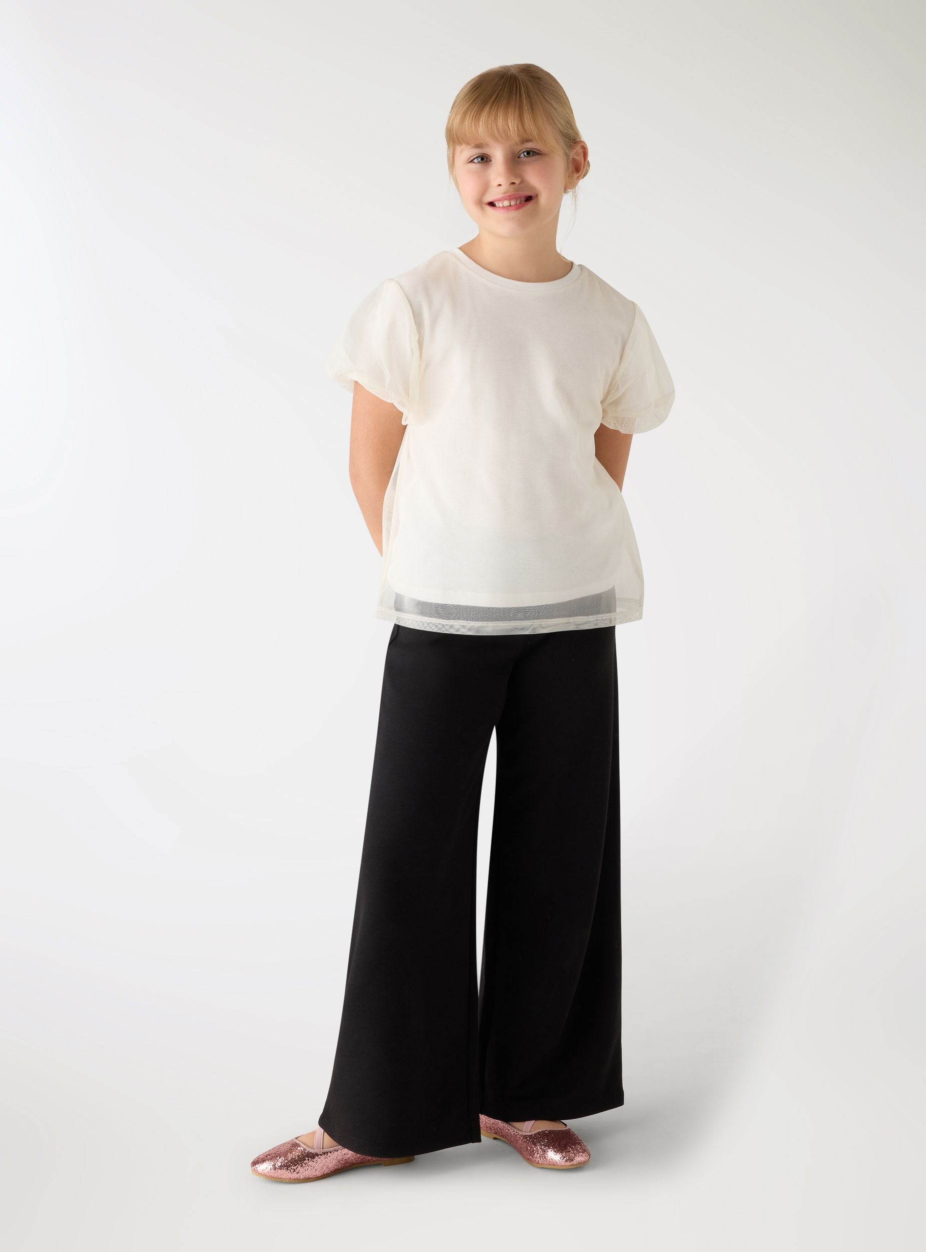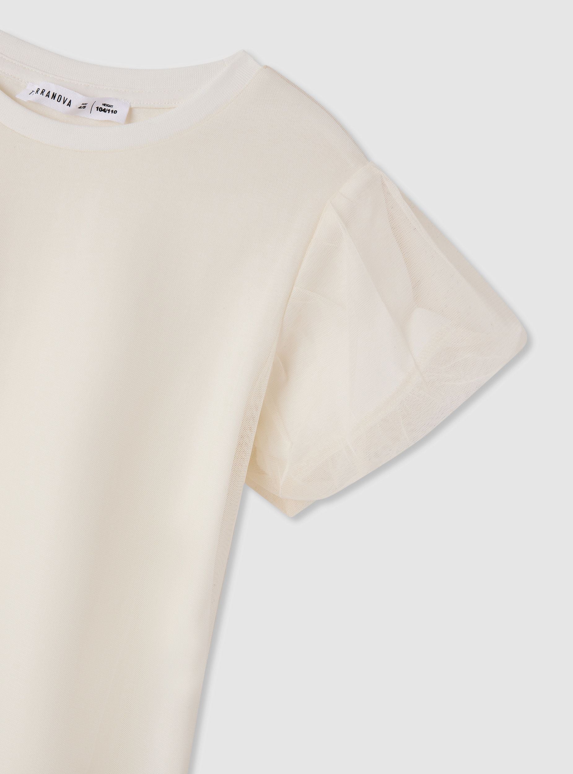 Girls' T-shirt with a crew neck and short sleeves, the tulle adds a romantic touch. Regular fit and straight cut, ideal for school or leisure time. Easy to pair with denim skirts, shorts, or leggings for versatile looks. Plain design, perfect for completing everyday outfits with a special detail.Details