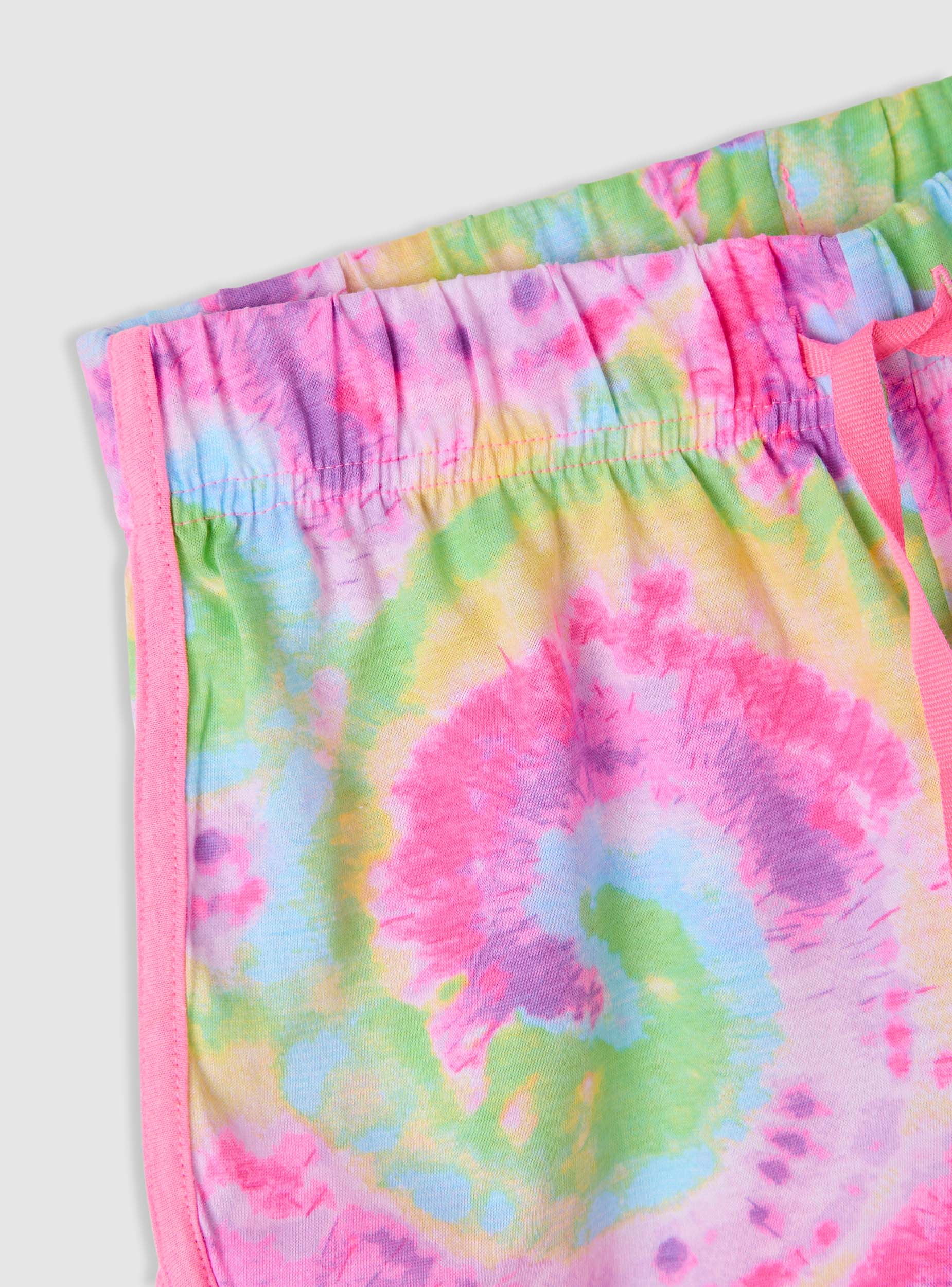 Girls' tie-dye print shorts, perfect for leisure time and holidays. Features an elasticated waistband with adjustable drawstring, contrasting trims, and a rounded hem for a sporty and dynamic look. Made from lightweight fabric. Regular fit and designed for comfort to play and move freely, ideal to pair with t-shirts and sweatshirts.Details
