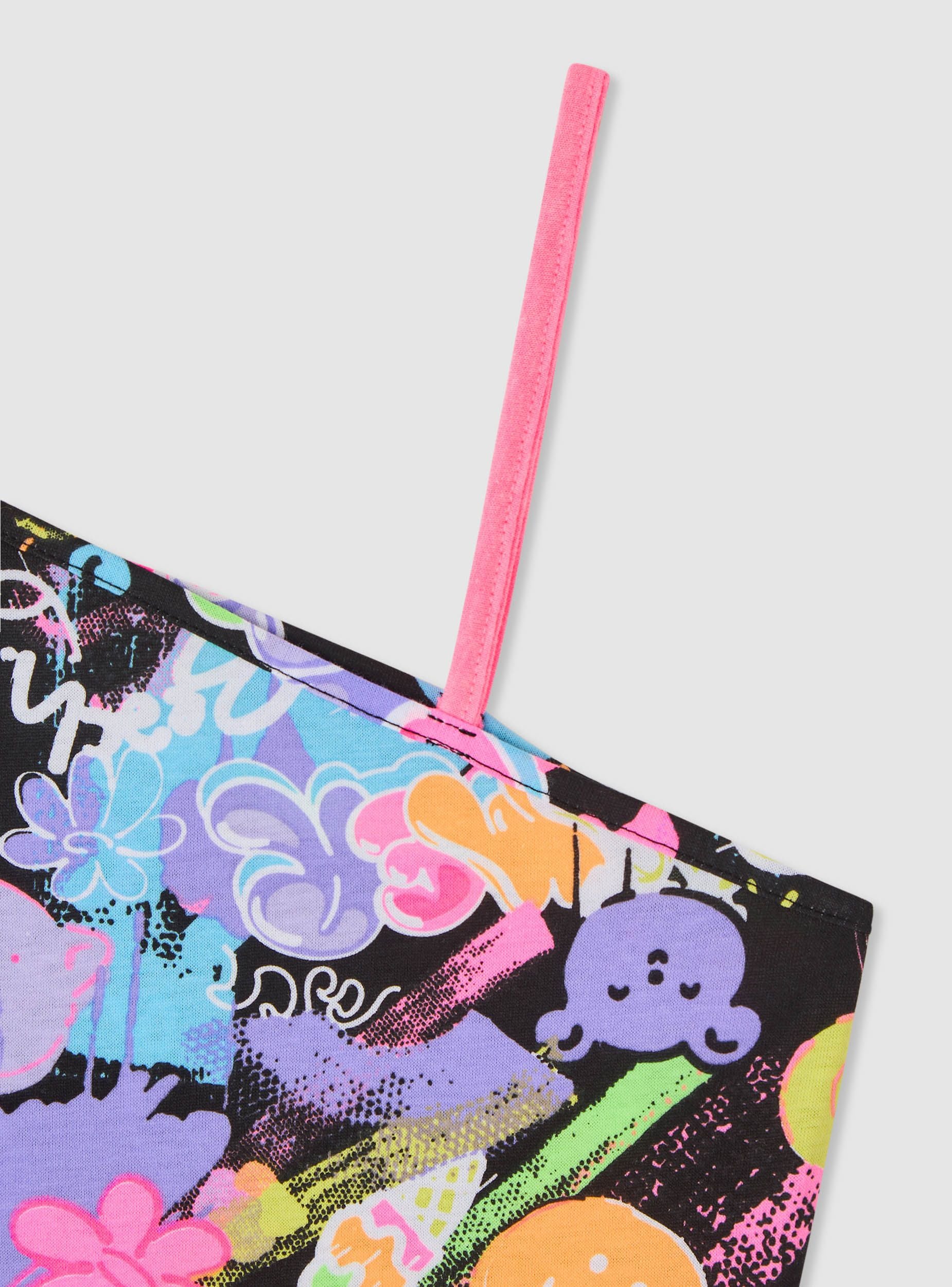 Girls' t-shirt in a one-shoulder crop top style, perfect for summer and playful looks. The thin strap on one side creates an asymmetrical design that is easy to pair with shorts, skirts, or jeans. Patterned with a print full of fun elements. Crop fit that enhances the silhouette and makes the garment ideal for leisure time and days at the beach.Details