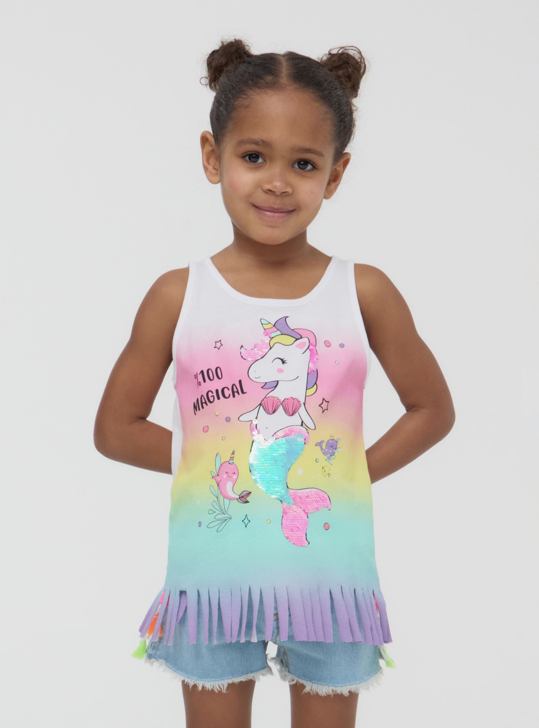 Top for girls with a cheerful design, embellished with vibrant fringes along the edge for a dynamic and fun look. The print of a sweet unicorn with a mermaid tail adds a fairy-tale touch, while the glittery details and sequins provide brightness and magic, perfect for those who love to daydream. An irresistible piece to live each day with style and a touch of imagination.