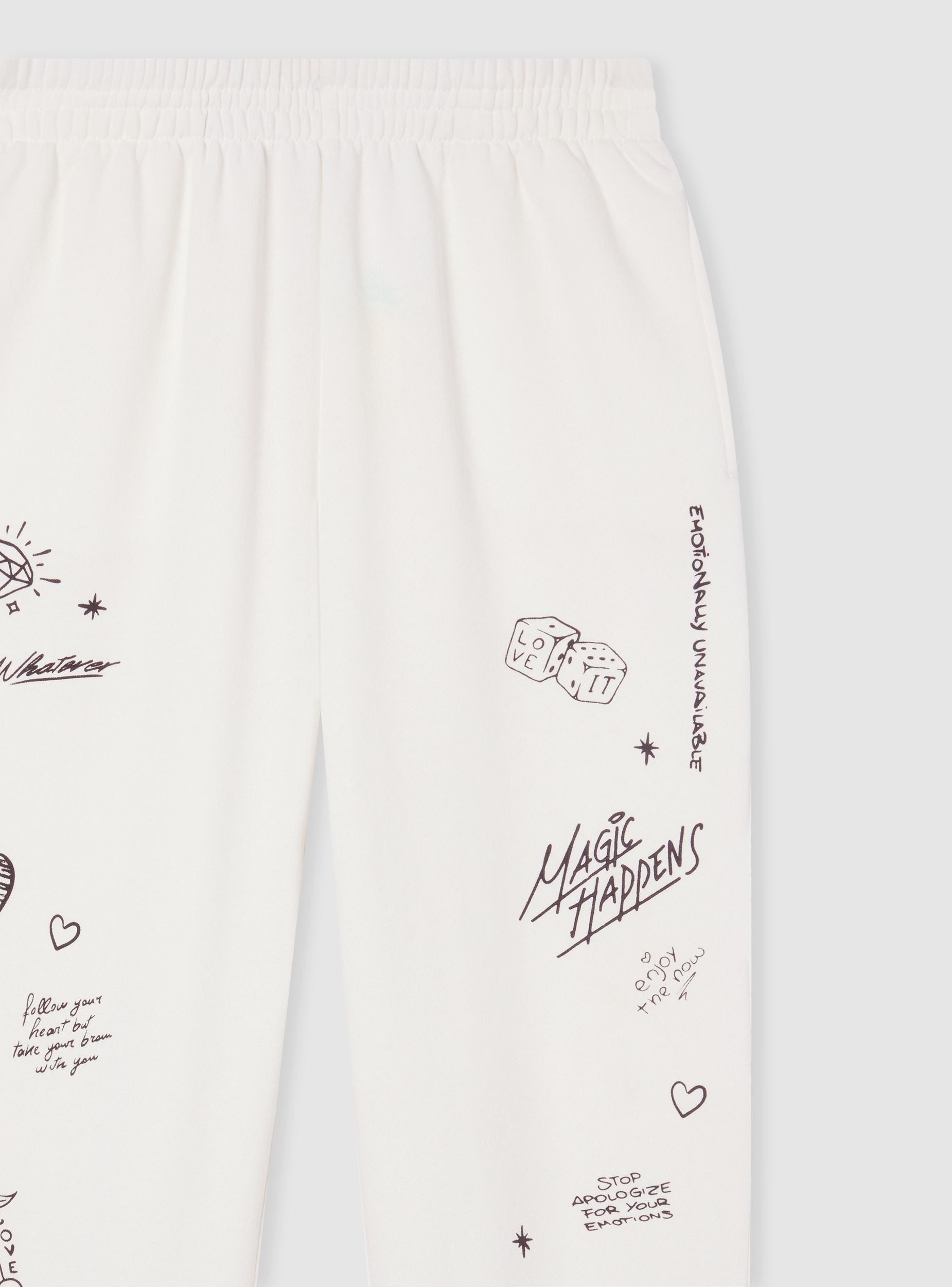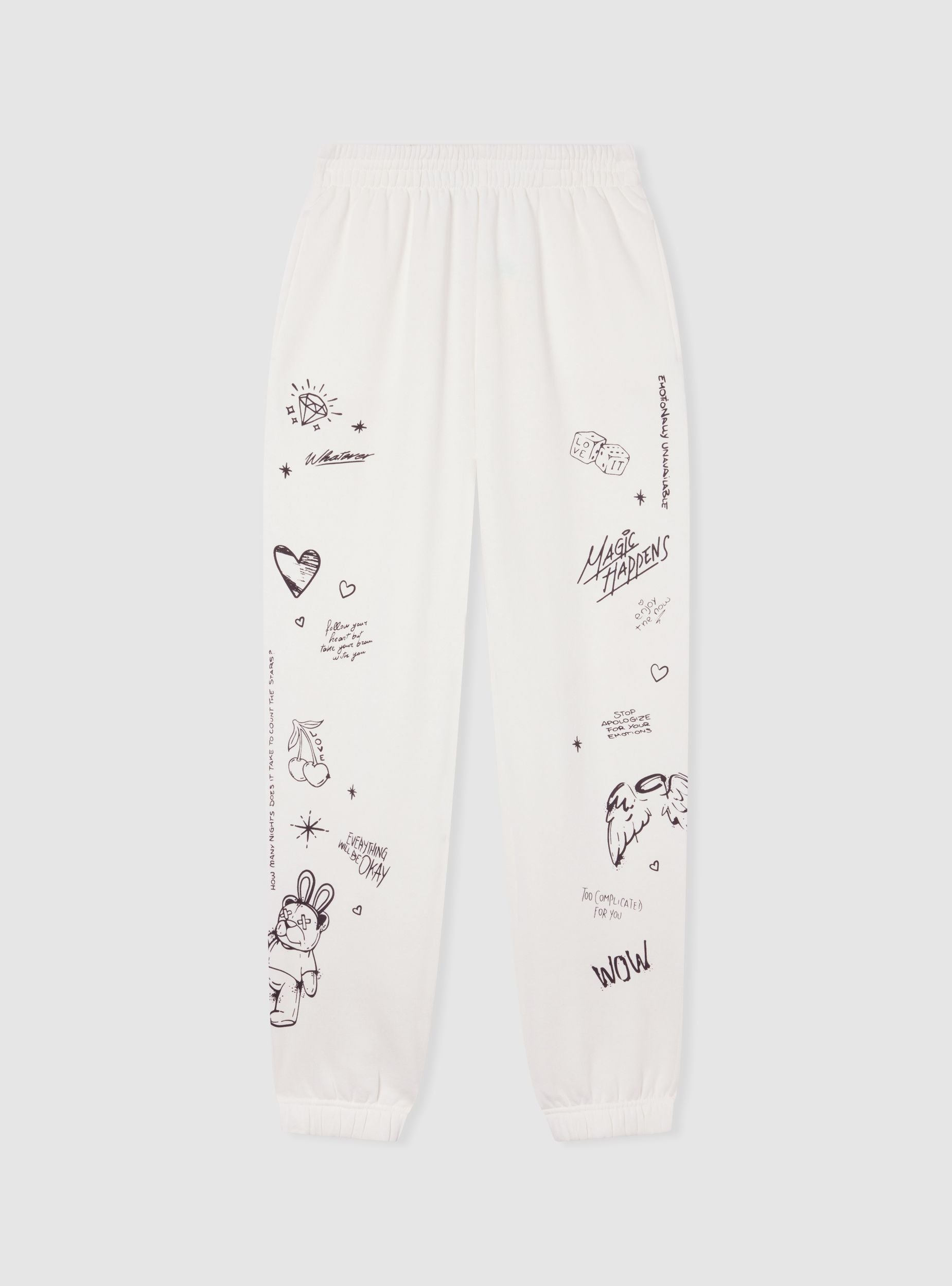 Women's jogger trousers with graffiti prints. Ideal for a casual and relaxed look, these trousers feature a comfortable fit and a modern design. Perfect for leisure time or a sporty outfit, they easily match with t-shirts and sneakers. The elasticated waistband with drawstring ensures comfort and practicality, while the ankle cuffs add a touch of style.Details