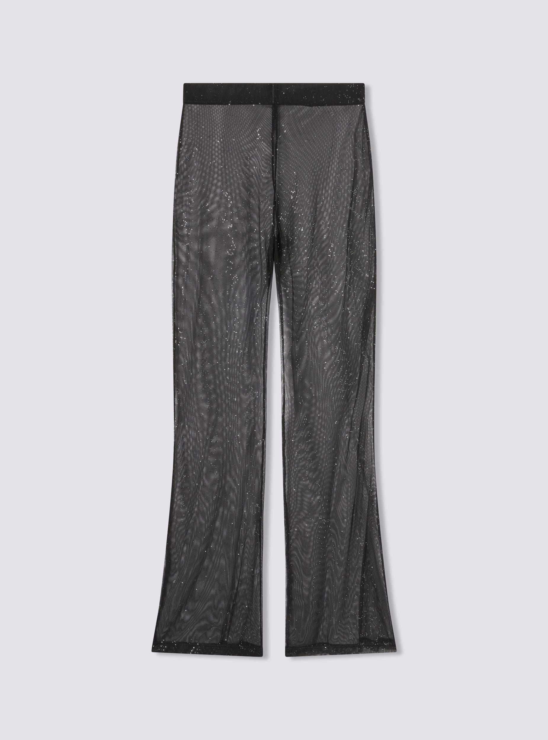 Long flared women's trousers with an irresistible shimmering and transparent effect, perfect for those who love a bold and glamorous style. Ideal for special evenings or summer events, they pair well with fitted tops or bodysuits for a sensual and sophisticated look. The fitted waist enhances the silhouette, while the flare at the bottom adds movement. Perfect with heels or jewel sandals.Details
