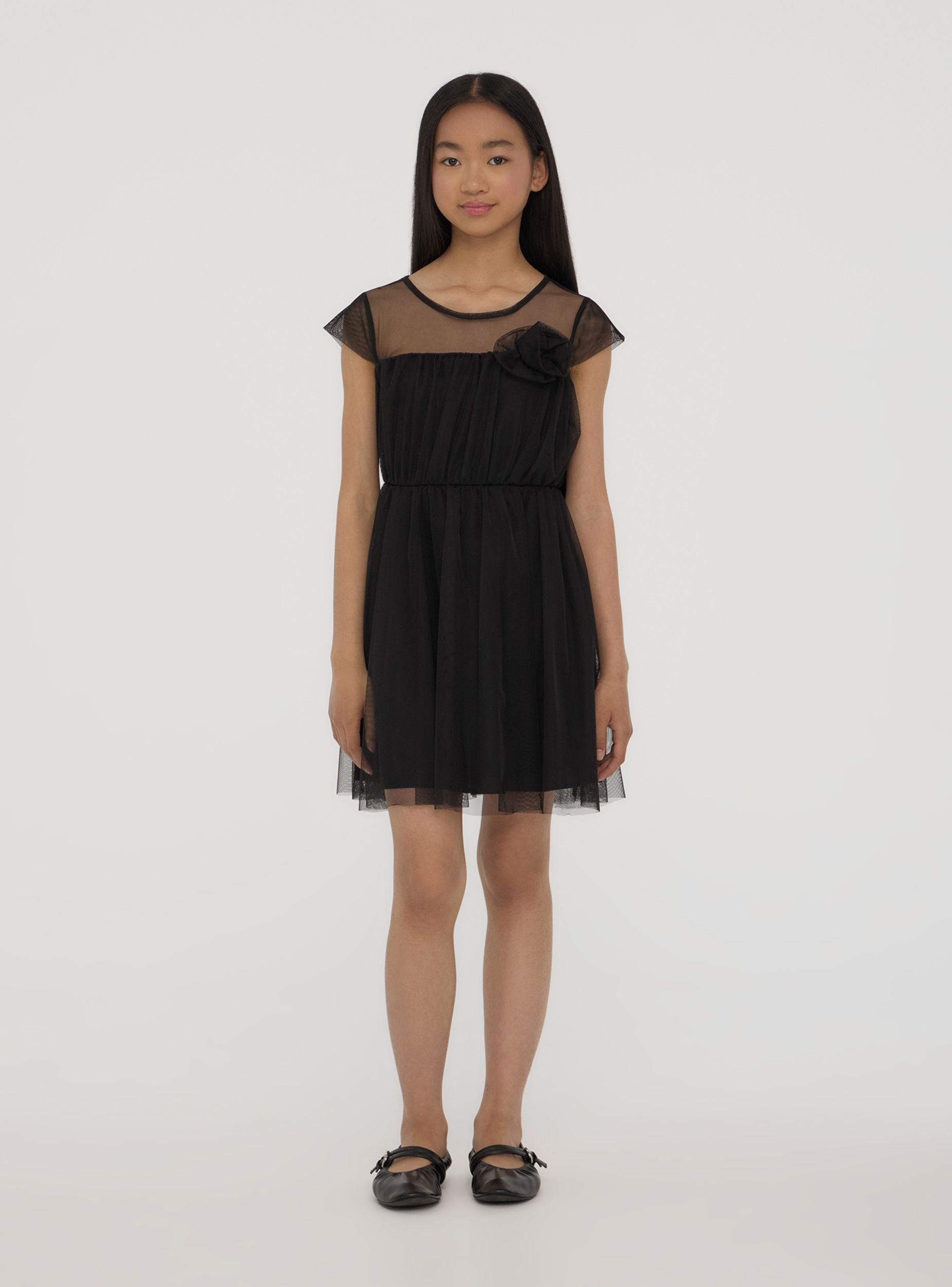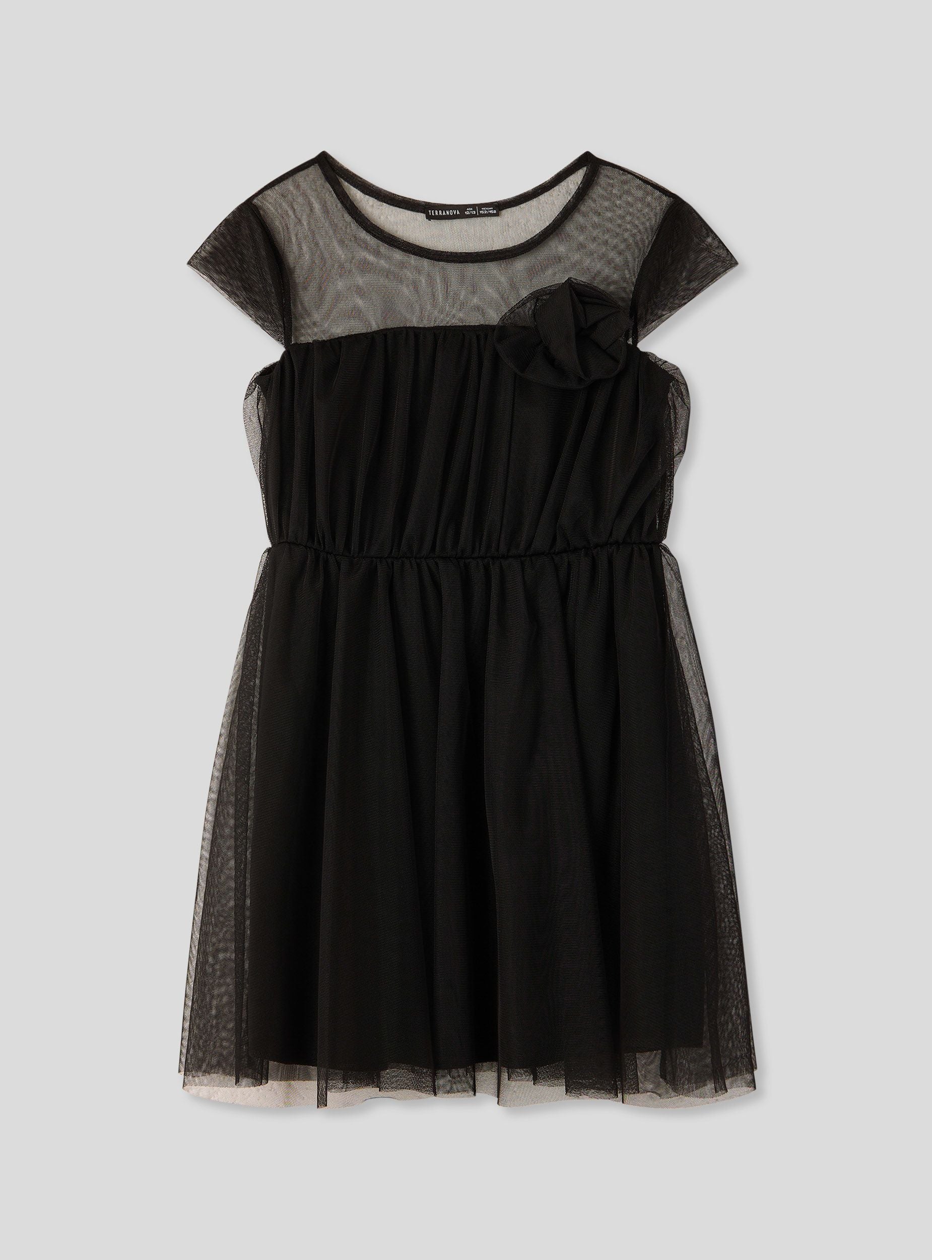 Ideal dress for girls for ceremonies and special occasions, featuring an elegant design with a double layer of tulle and floral appliqué on the chest. The regular fit and tulle skirt provide movement and lightness. The round neckline, short sleeves, and solid colour make it perfect to pair with ballet flats or sandals for a refined look.Details