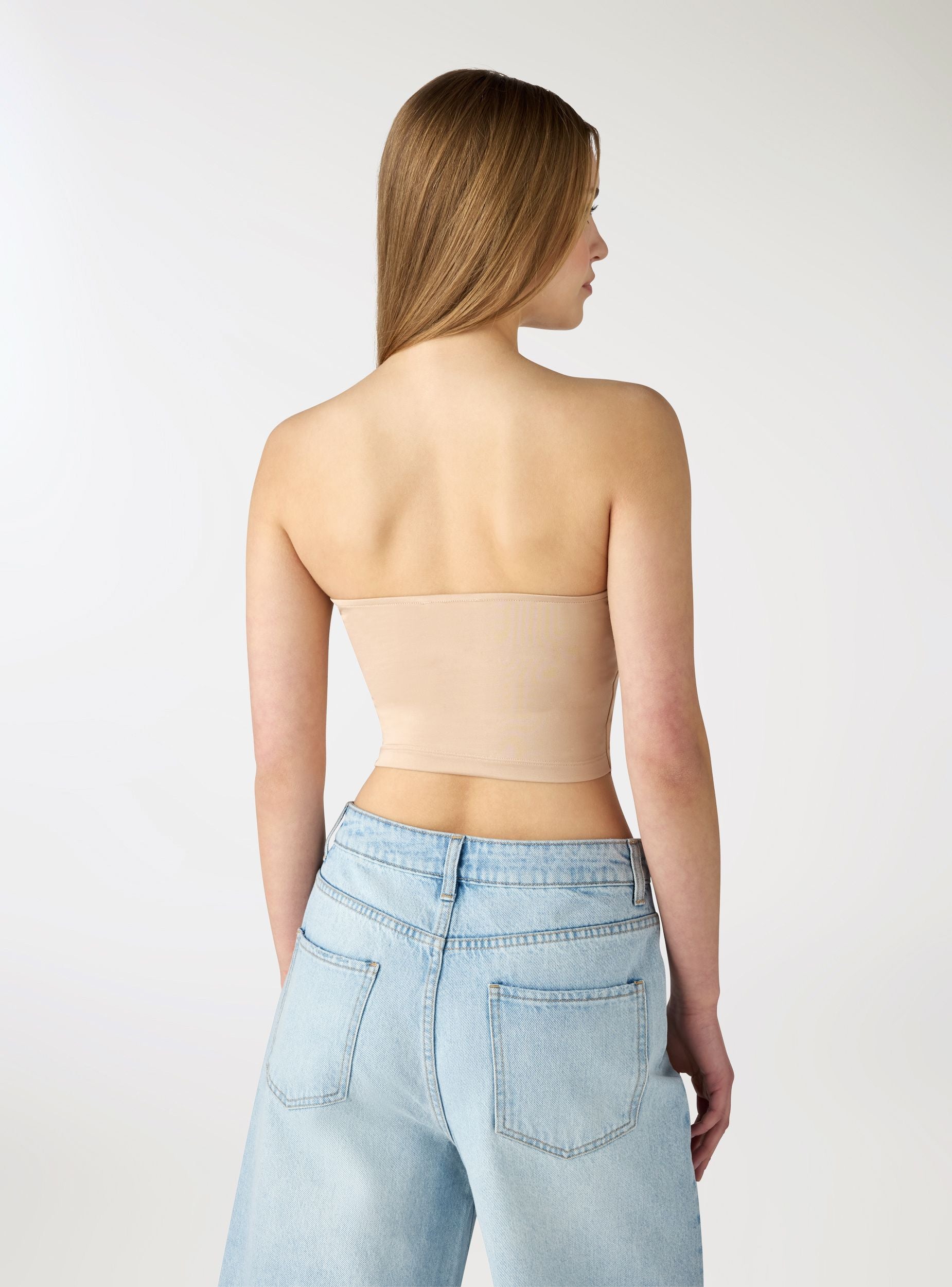 Solid-colour women's bandeau top with an ultrashort design, ideal for summer looks and casual evenings. Fitted cut that enhances the bust and a straight neckline without straps for a minimal effect. Easily pairs with jeans, high-waisted trousers, or skirts to create trendy and versatile outfits.Details