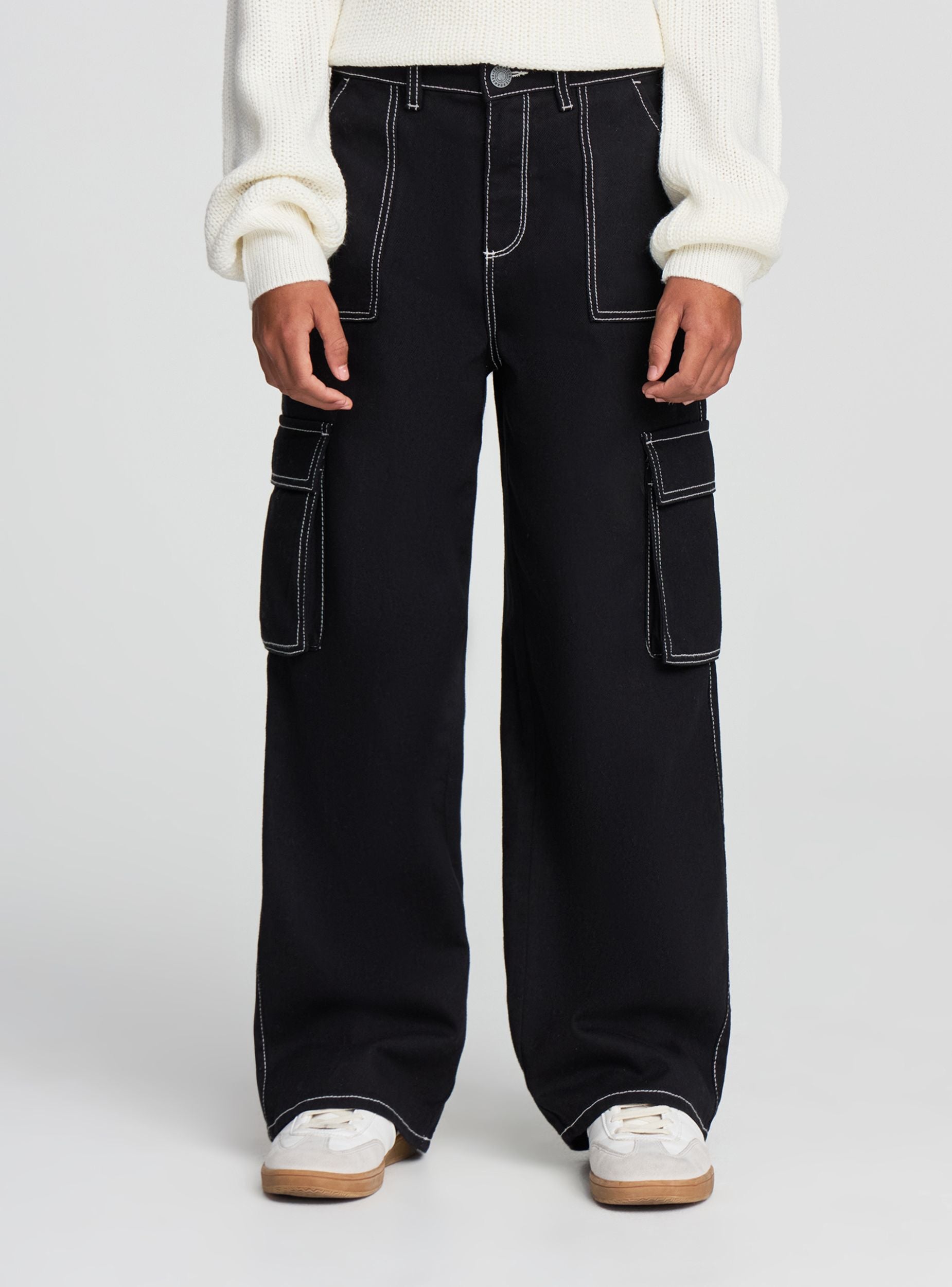Girls' long pants with a cargo design and a loose fit. Equipped with side and back pockets, they offer practicality and style for a casual and modern look. Ideal to pair with t-shirts or sweatshirts, they are perfect for a comfortable and fashionable outfit. The closure features a button and zipper. Belt loops add a functional and versatile touch.Details