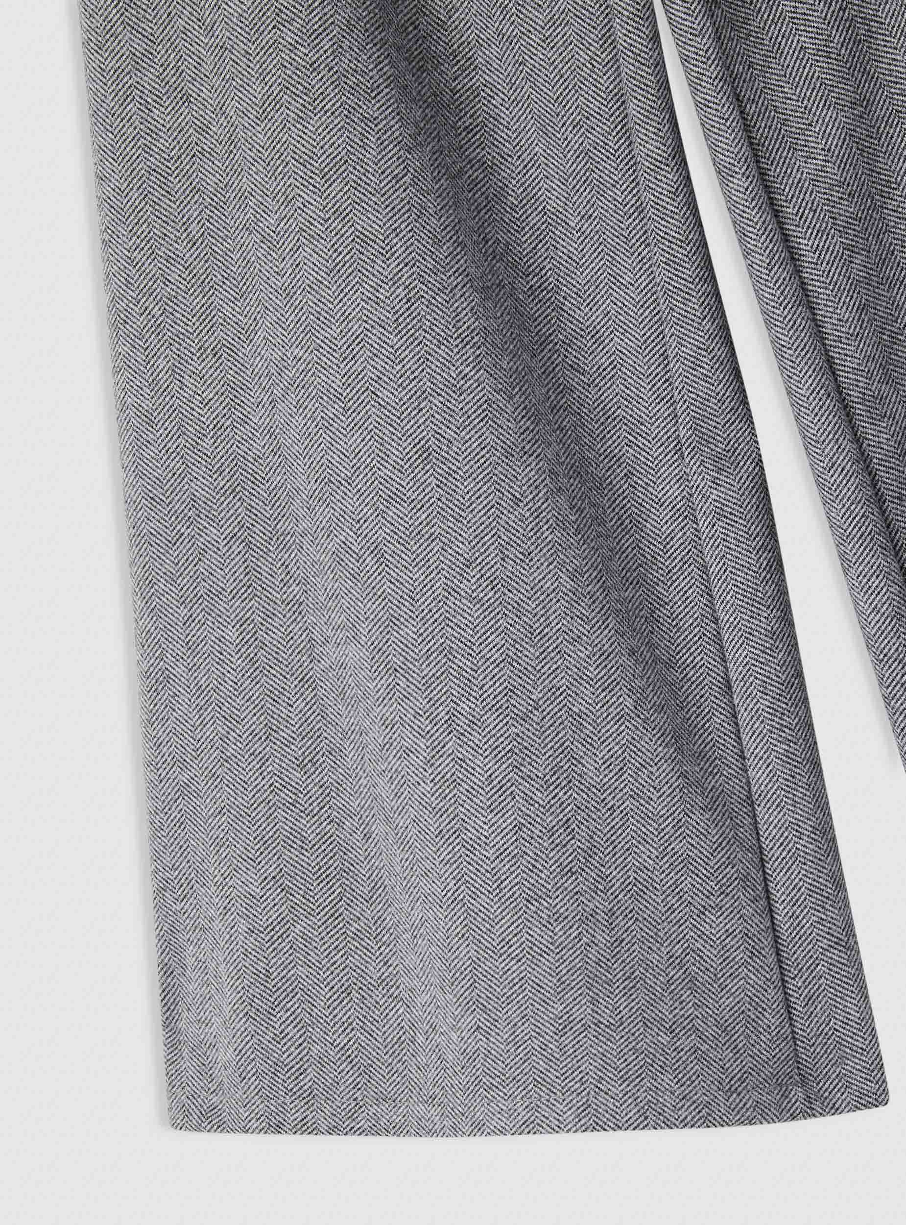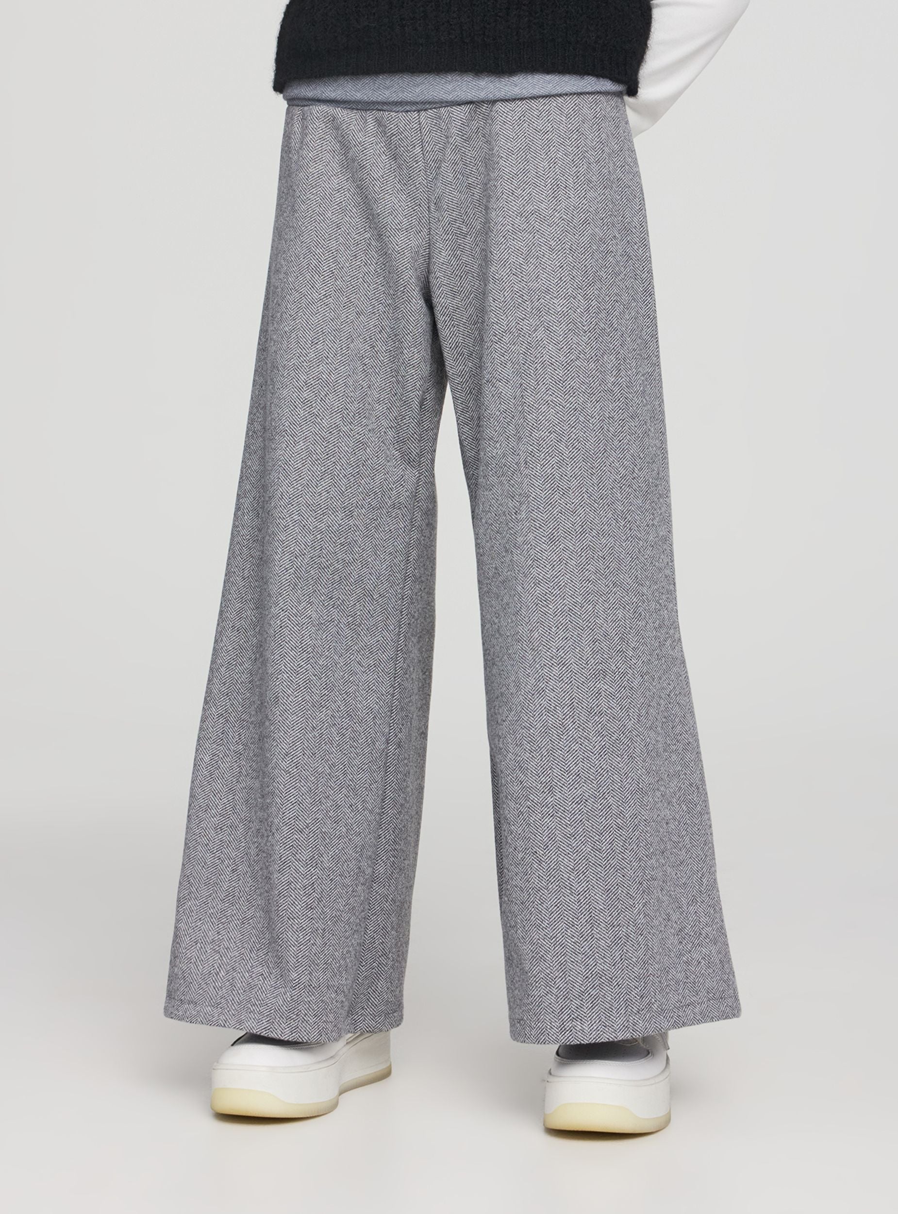Girls' patterned trousers with a herringbone design. Long style with a loose fit and wide-leg cut, comfortable for school and leisure. Elasticated waistband for easy wearing. Without pockets, they feature a flowing silhouette that pairs well with a T-shirt and cardigan for everyday looks or with a shirt for special occasions.