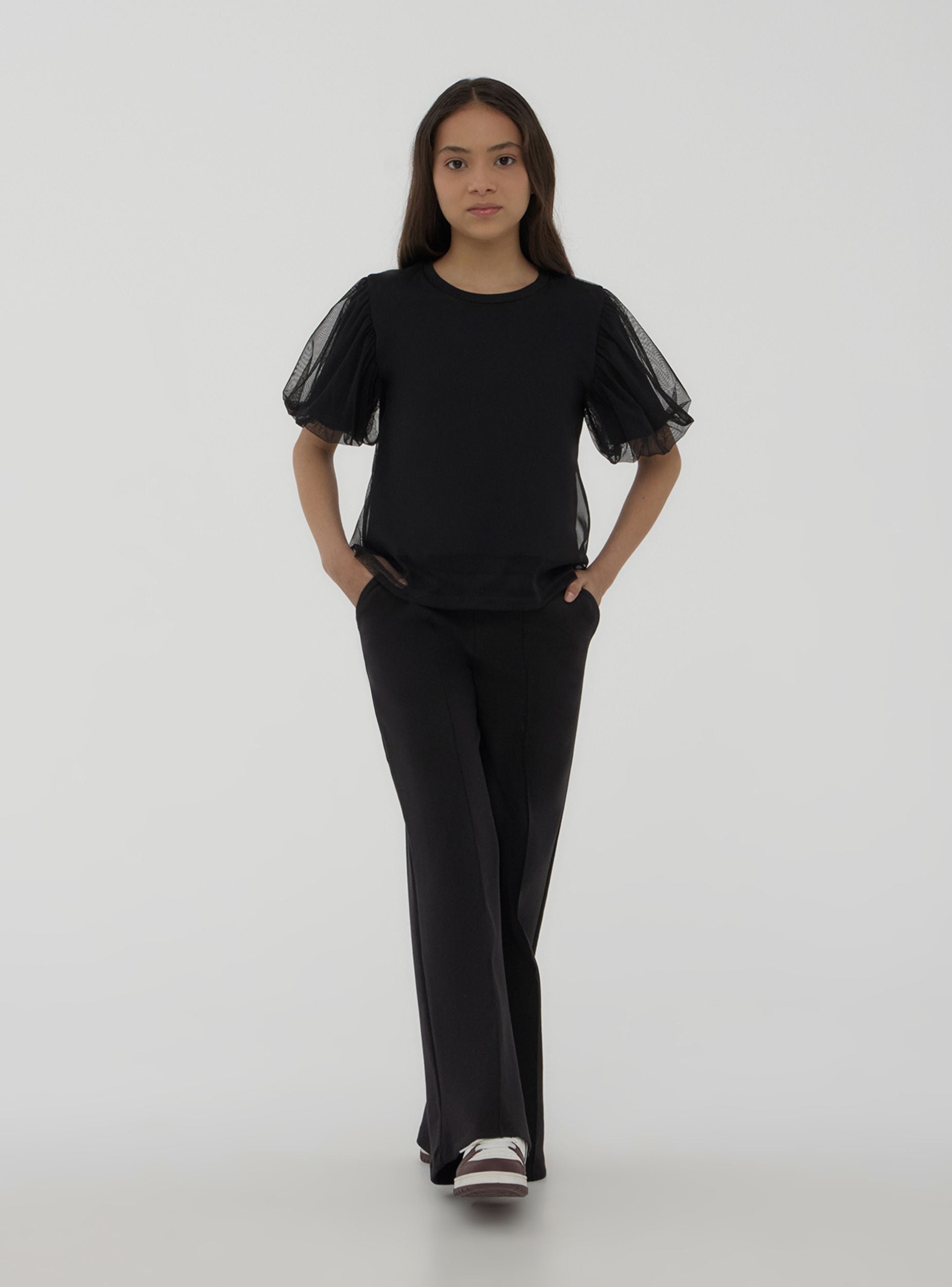 Girls' jogger trousers with a contemporary style and wide fit, ideal for a comfortable yet polished look. The elasticated waistband ensures an easy and practical fit, while the stitched central crease adds an elegant touch. Perfect with a t-shirt and sneakers for everyday wear.Details