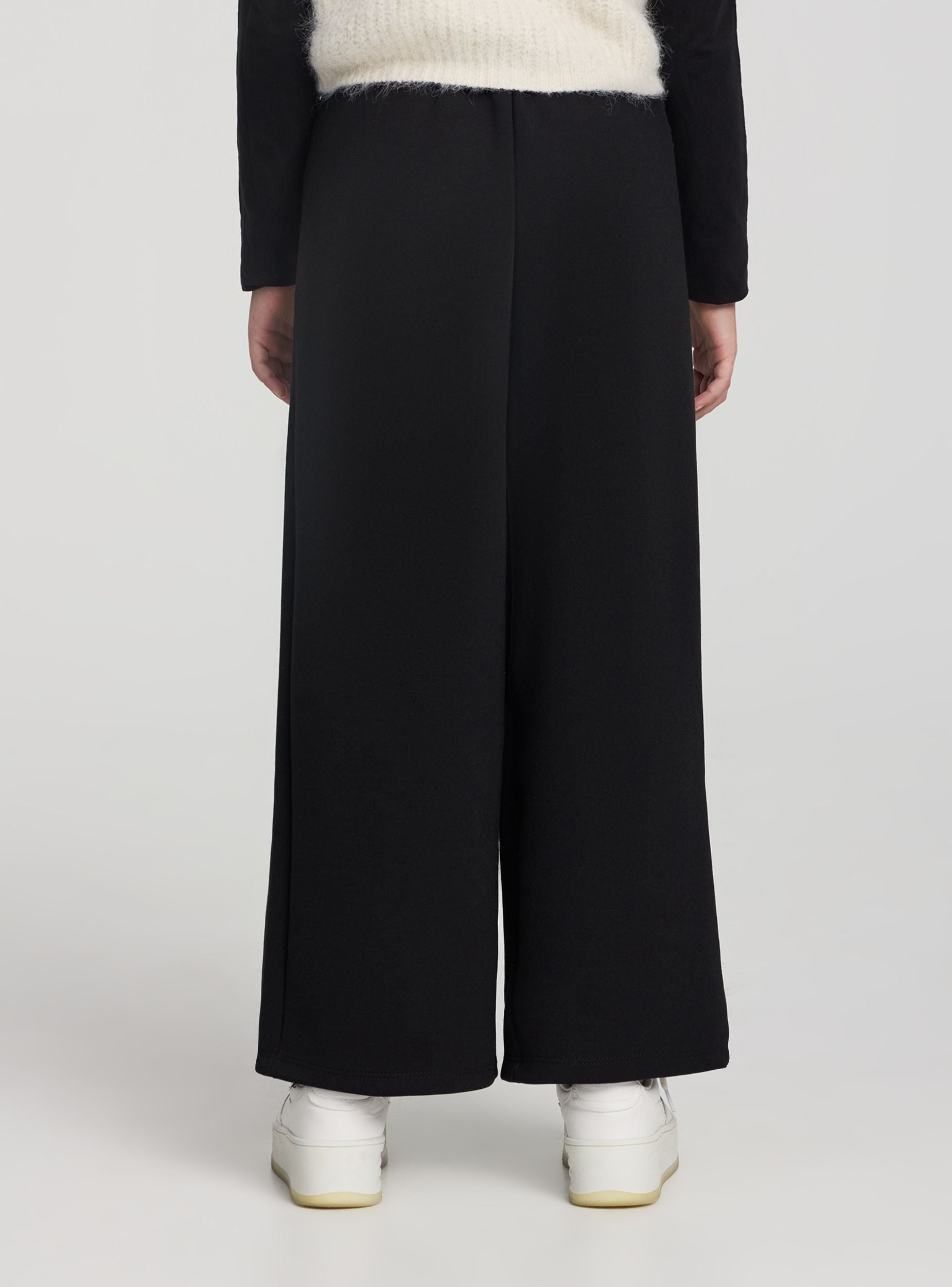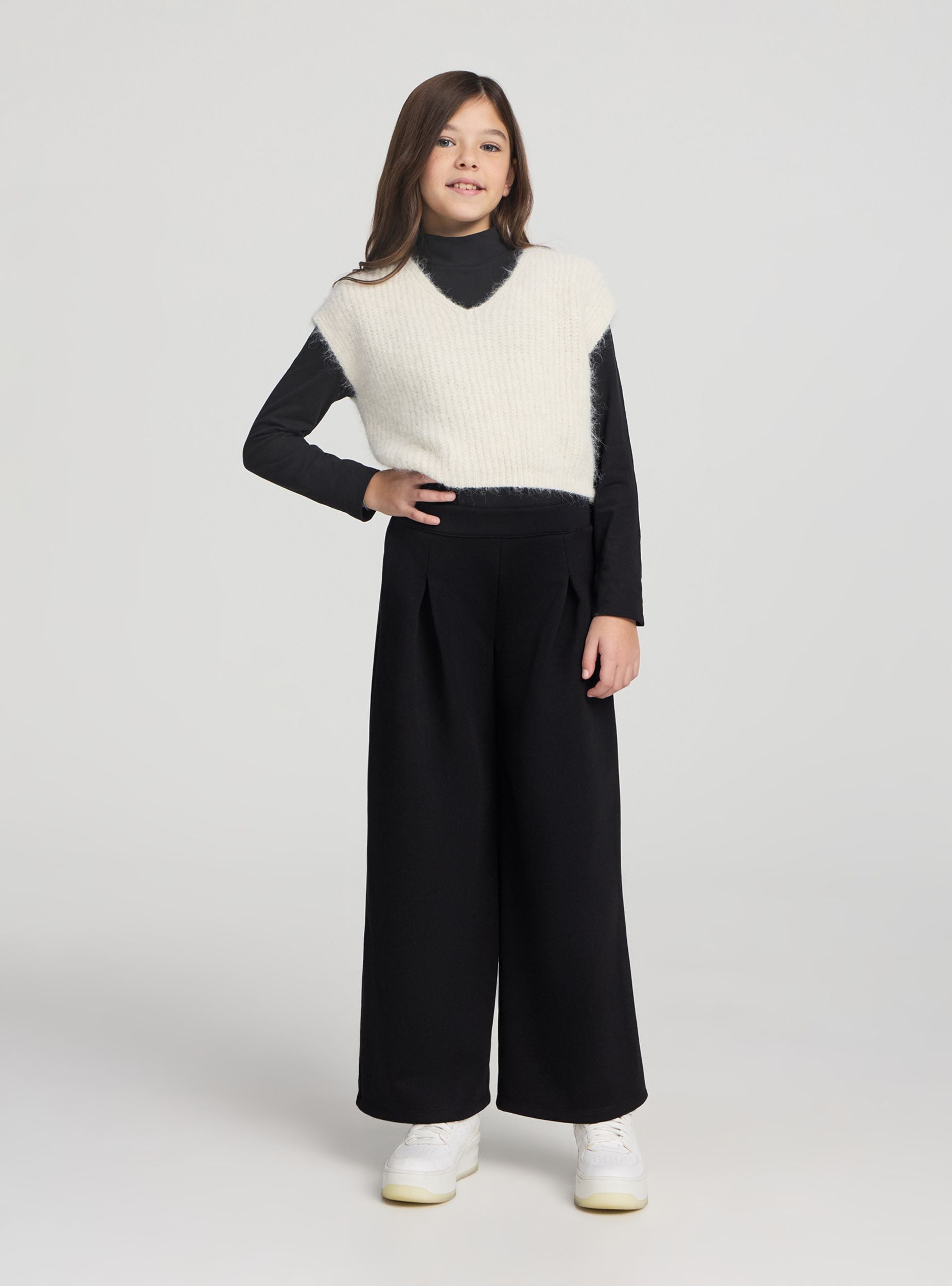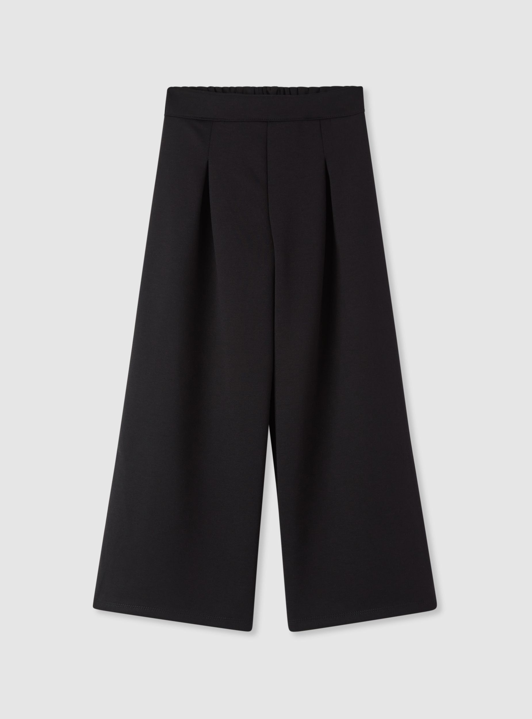 Plain-coloured girls' trousers, perfect for everyday looks and casual occasions. Elasticated waistband at the back for comfort. The wide leg with front pleats adds movement and a comfortable fit. Easy to pair with a t-shirt and trainers or with a shirt for a polished outfit.Details