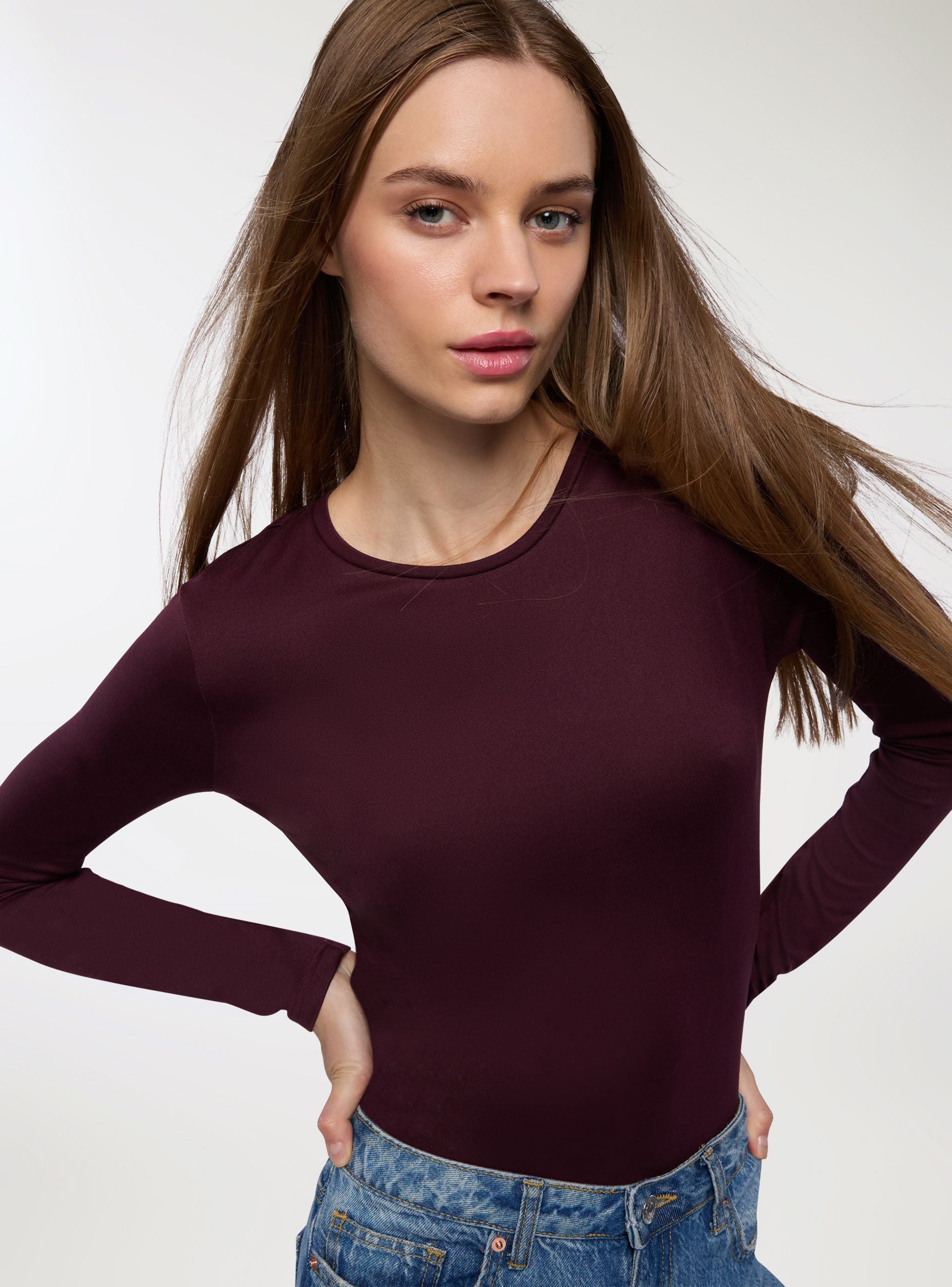 Women's basic long-sleeve top in stretchy fabric. Perfect for any season, this top is a wardrobe essential. Characterised by a minimalist design and solid colour, it features long sleeves and a comfortable crew neck. The stretchy fabric ensures a snug and comfortable fit, naturally following the body's lines. Ideal for wearing alone in casual looks or as a layer under jackets, blazers, or cardigans during the colder months, it easily adapts to any occasion, from the office to leisure time. A versatile piece that combines simplicity and practicality for a consistently polished style.Details