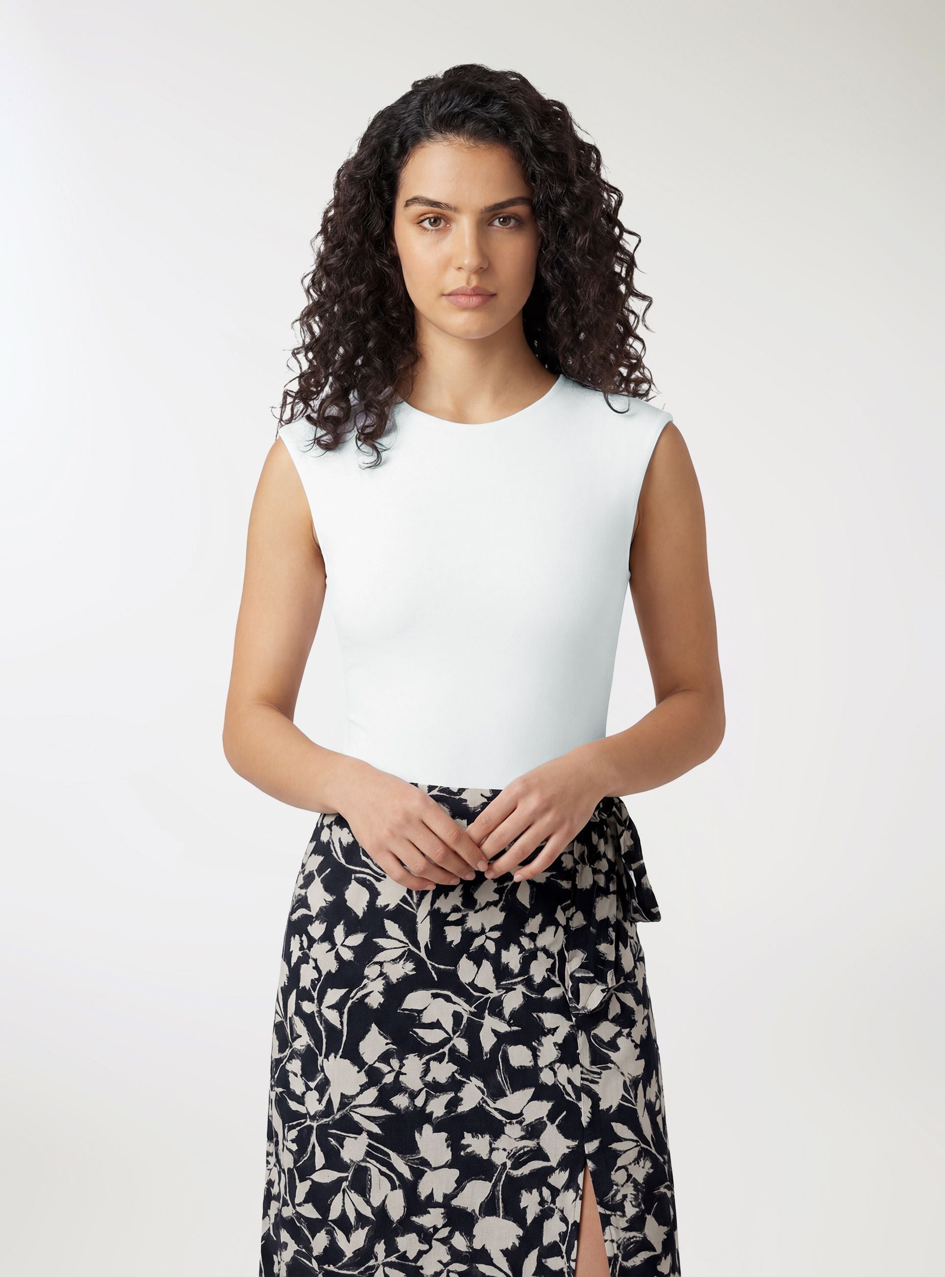 Solid-colour women's bodysuit with a crew neck and cap sleeves. Clean, fitted silhouette that flatters the figure, ideal under blazers, midi skirts or jeans for polished looks from day to night. Convenient snap buttons at the crotch for a comfortable fit. Perfect for creating layered or minimalist outfits thanks to its essential design.Details