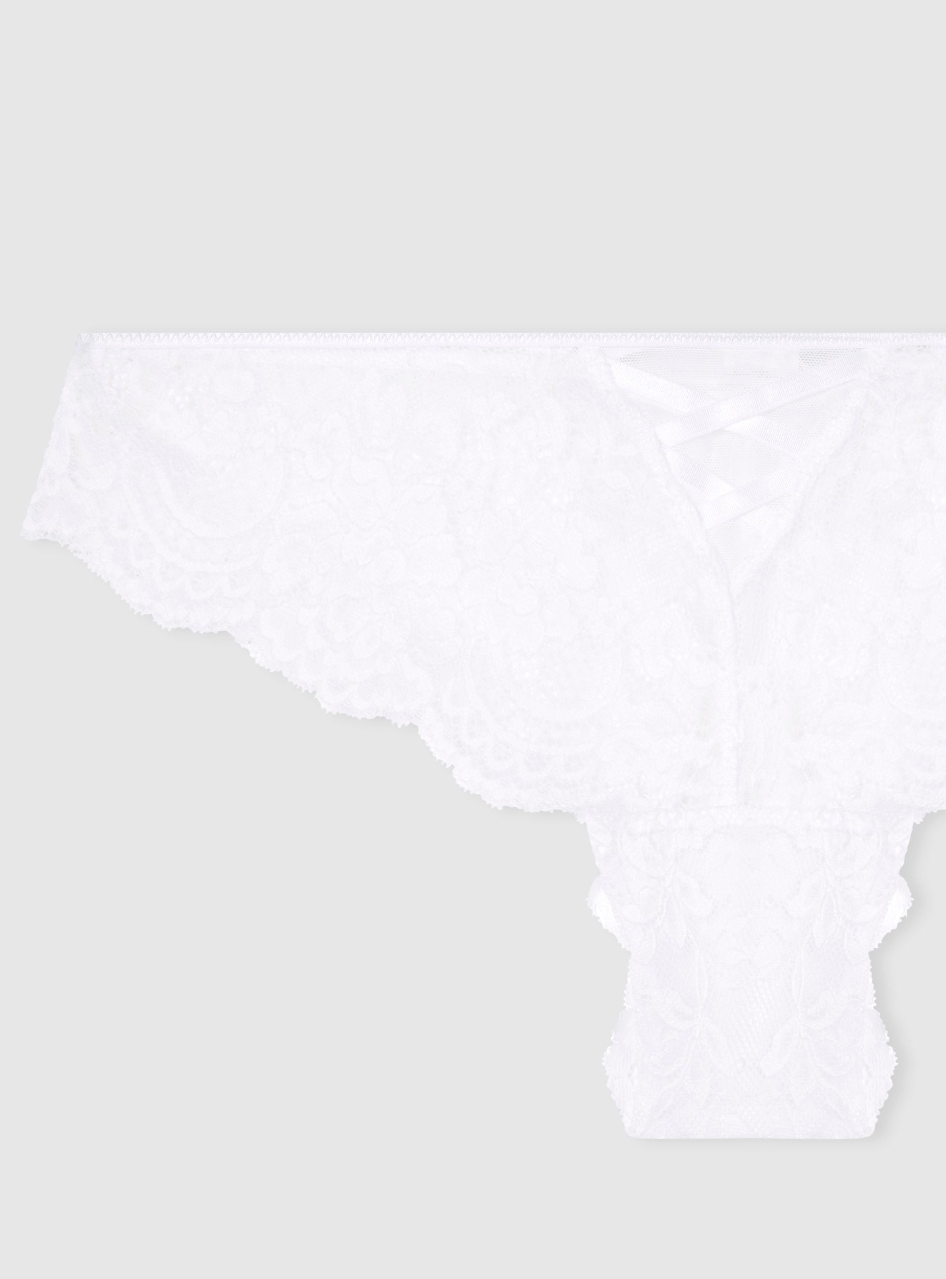 An intimate garment with a delicate and feminine charm, perfect for completing any look with a seductive touch. This lace Brazilian brief combines sensuality and comfort, thanks to its high-cut design that enhances the shape without constriction. The lace pattern adds elegance and lightness. Ideal under dresses and tight trousers. A must-have for everyday lingerie, with a refined twist. Features crossed straps at the back.Details