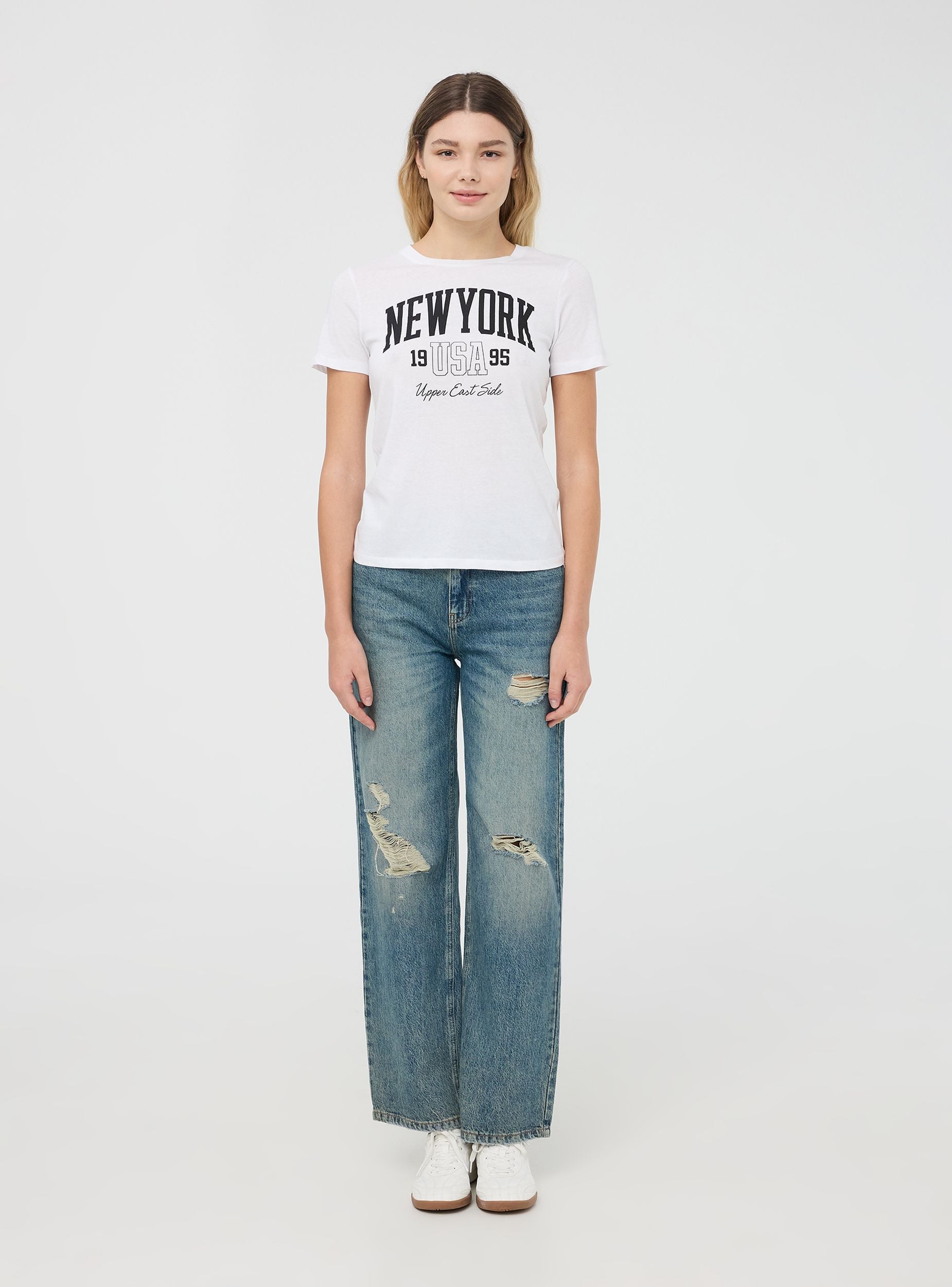 Women's t-shirt with a casual and sporty design, featuring a round neck and short sleeves that provide comfort and freshness. The garment showcases a college print with the word "New York" and other graphic details inspired by university style, making it perfect for an urban and youthful look. Ideal for leisure time, it is a versatile piece that can be easily matched with different outfits for a dynamic and modern appearance.Details