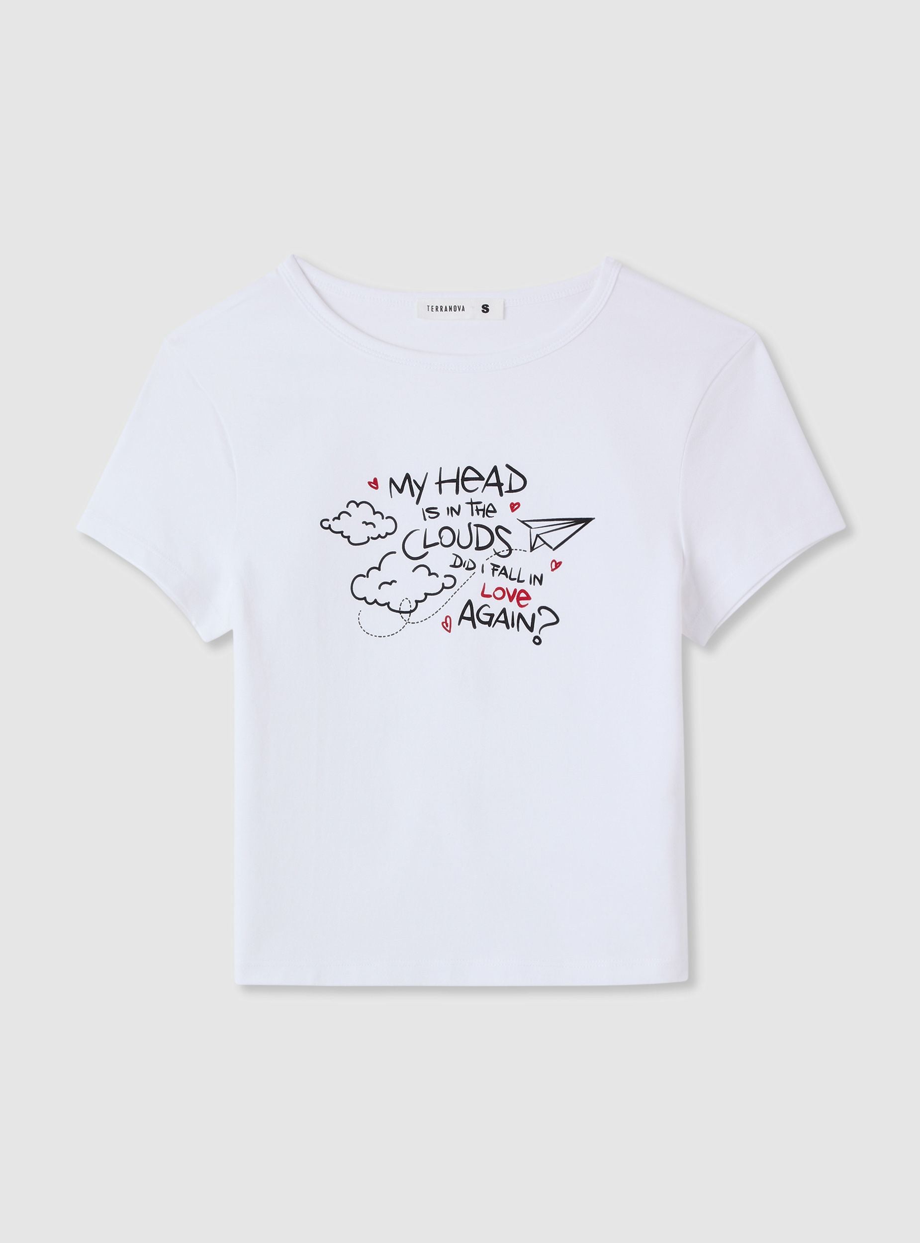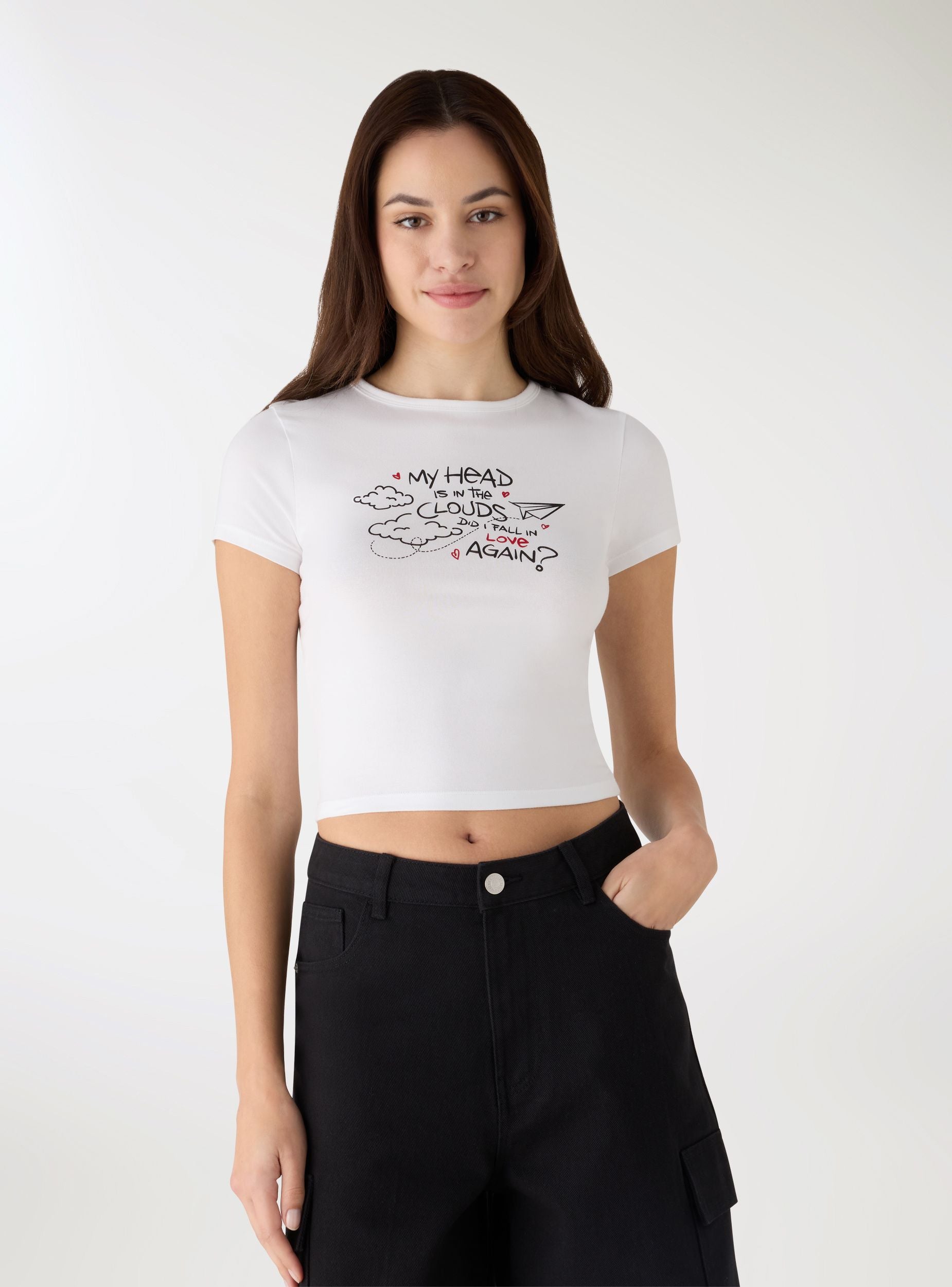 Solid colour women's crop-fit T-shirt. Features a crew neck and short sleeves, embellished with writing on the front alongside graphic elements. Perfect for casual and urban looks, it pairs well with high-waisted jeans, denim skirts, or shorts for leisure time. The simple design enhances the silhouette and makes it easy to create layered outfits with cardigans or light jackets.Details