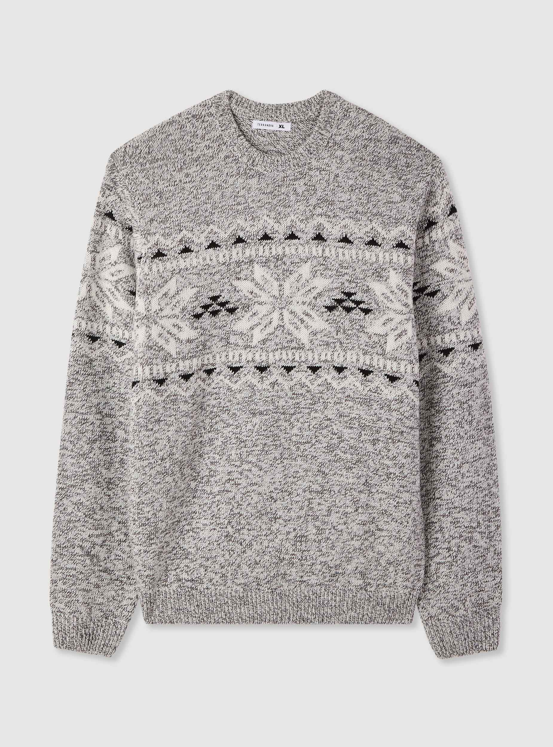 Men's sweater with a mountain pattern, ideal for winter and casual days. Long-sleeved model with a crew neck and ribbed finishes on the collar, cuffs, and hem for a comfortable fit. The design features a central band with a jacquard pattern and a melange dye effect. Perfect with jeans and boots, it suits outdoor looks or leisure time.