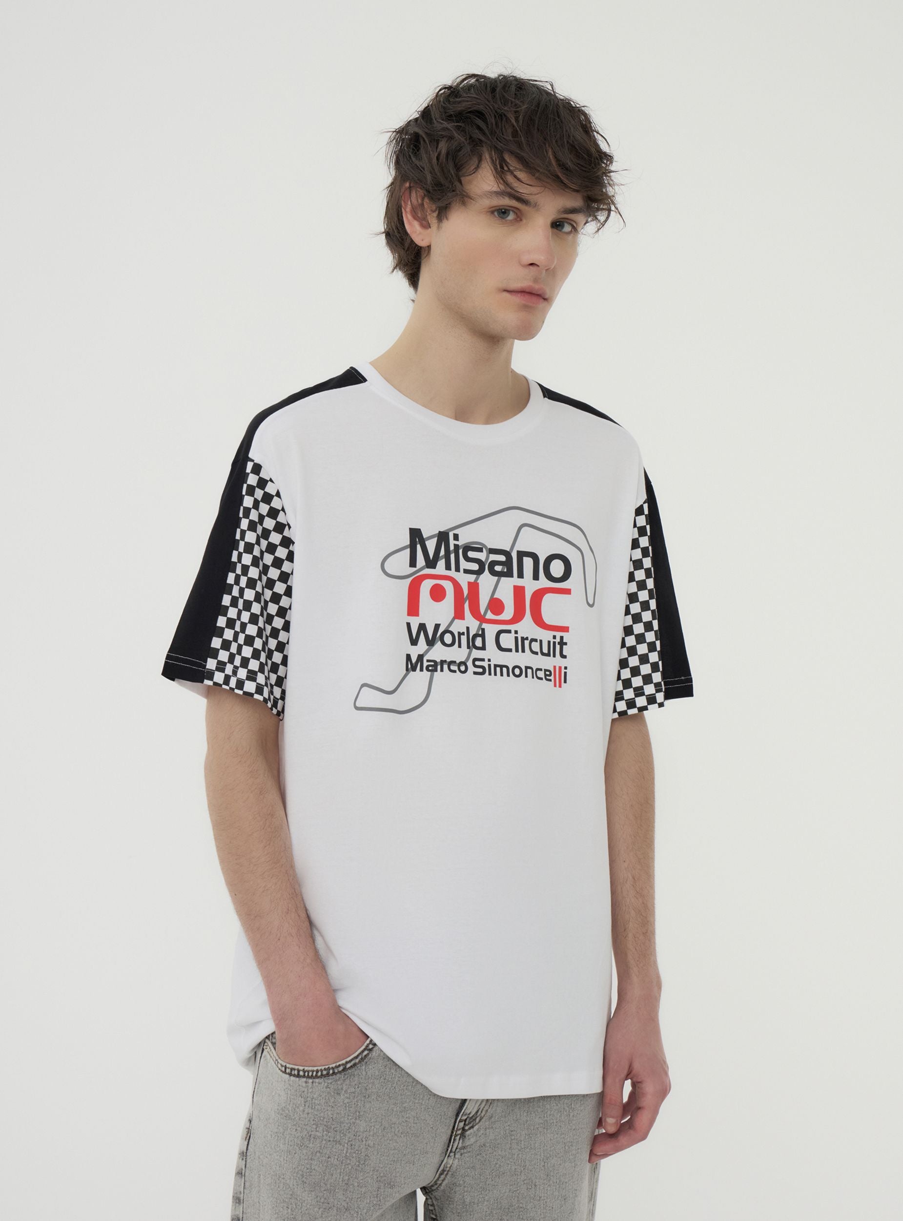 Men's cotton T-shirt with short sleeves and a crew neck. The design features a print dedicated to the Misano World Circuit with checkered details on the sleeves. Perfect for sporting events, leisure time, or dynamic looks. It pairs easily with jeans, joggers, or shorts for a bold and characterful outfit.Details
