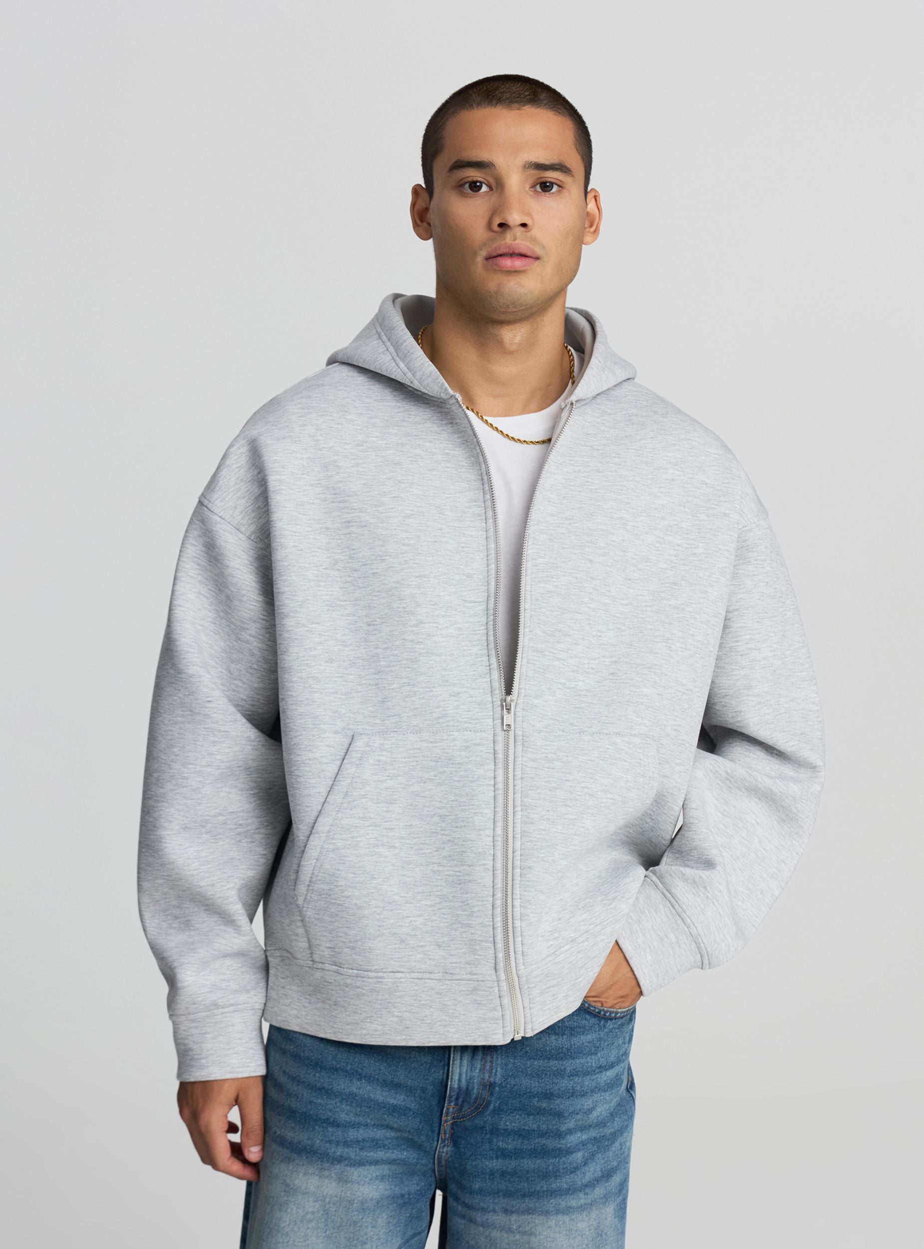 Men's solid colour neoprene sweatshirt with hood and zip, ideal for a casual and comfortable look. Equipped with front pockets for practicality and cuffs for an optimal fit. Perfect to pair with jeans or sports trousers, this sweatshirt is suitable for leisure or outdoor activities. The simple and versatile design makes it an essential item in the wardrobe.Details