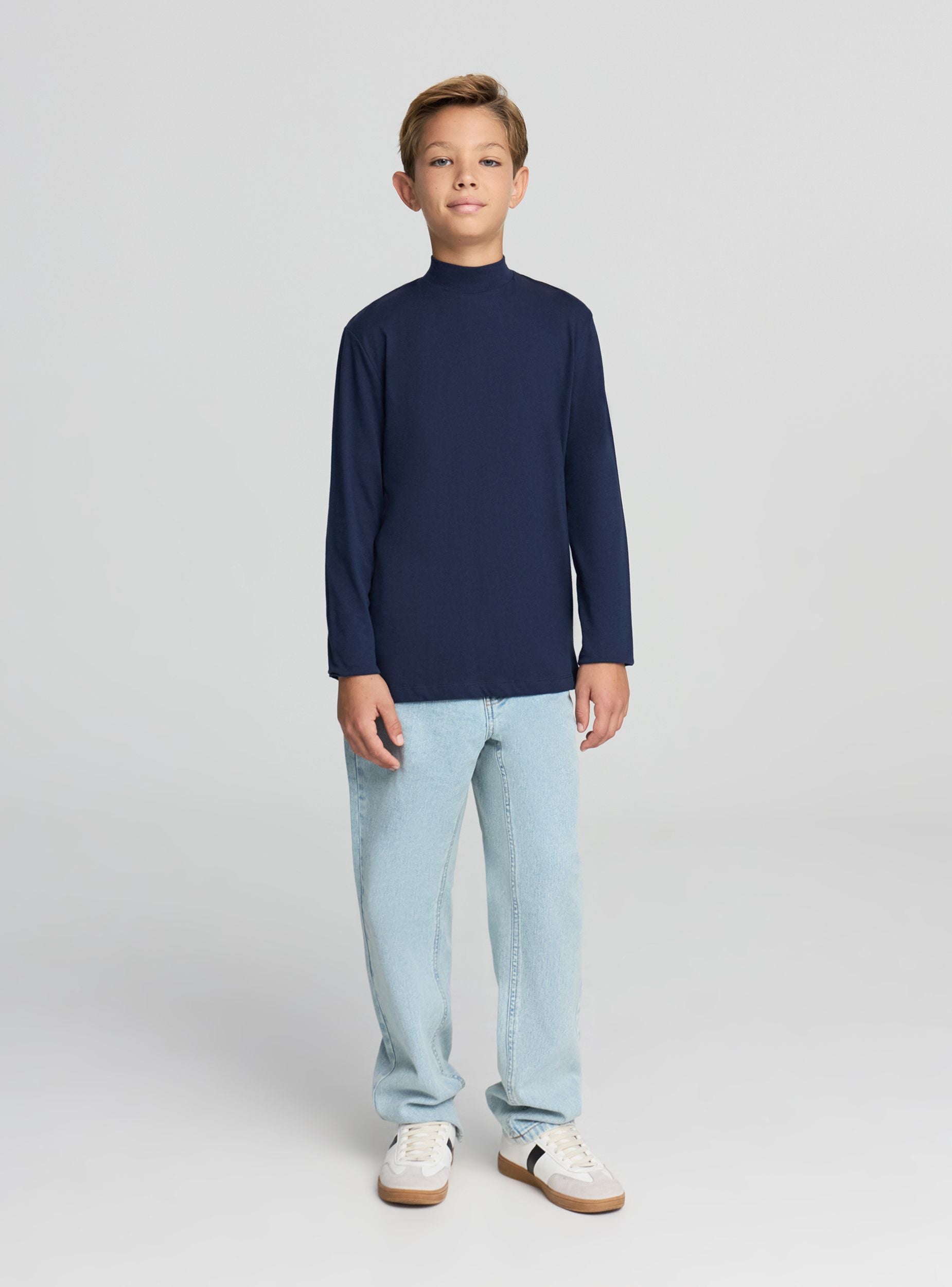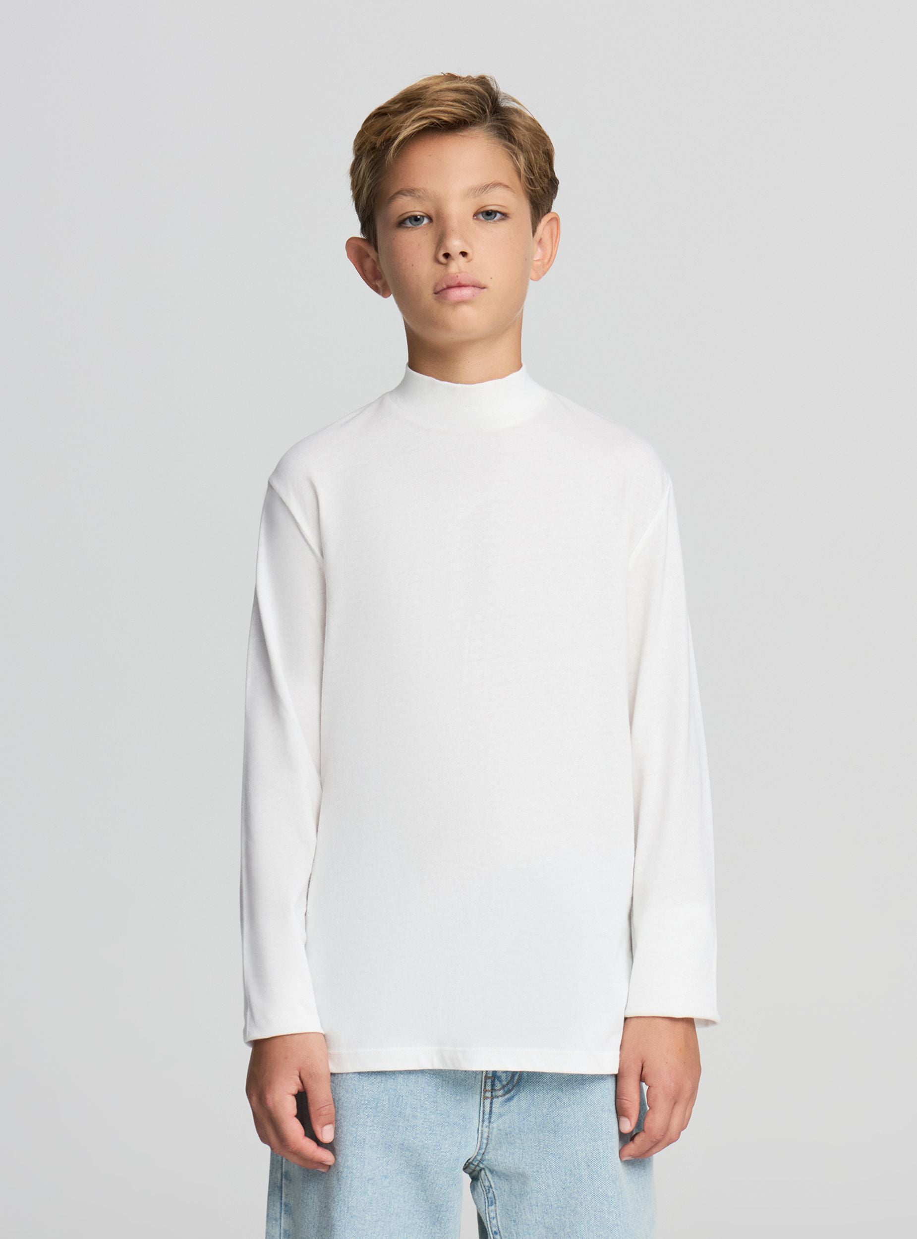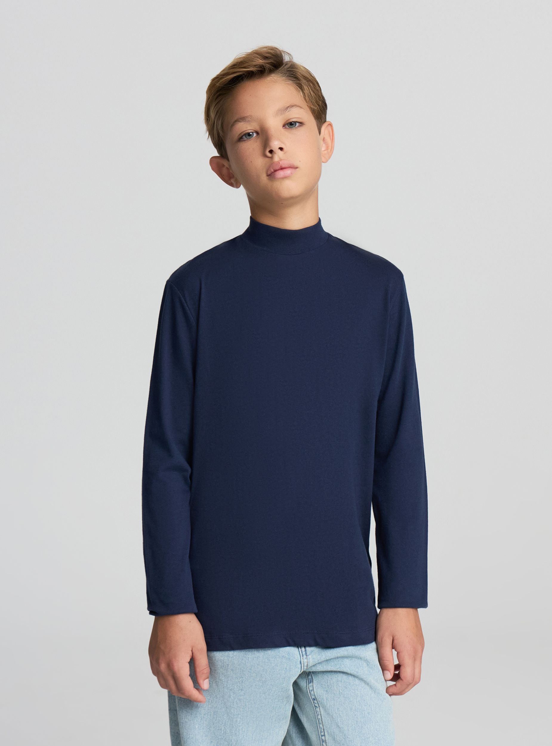 Long-sleeved children's t-shirt, offered in a pack of three with a solid colour design. The model features a turtle neck that provides extra protection on cool days, ideal for wearing alone or as a layer under sweatshirts and jumpers. Regular fit, without prints or additional details, perfect for school, leisure time, and daily activities.