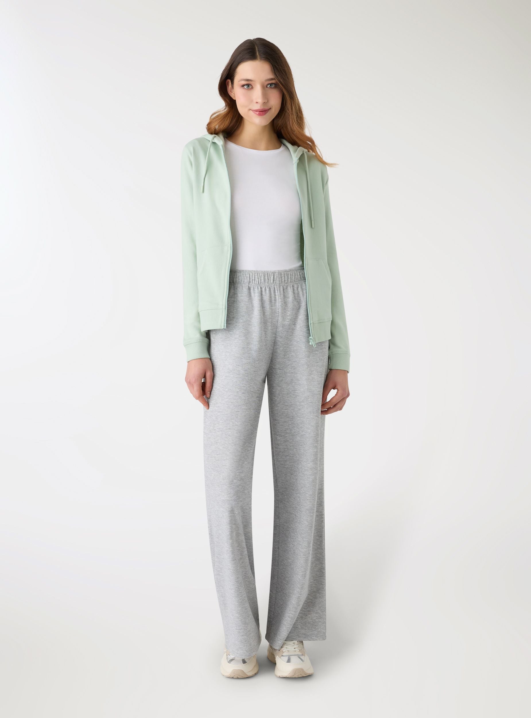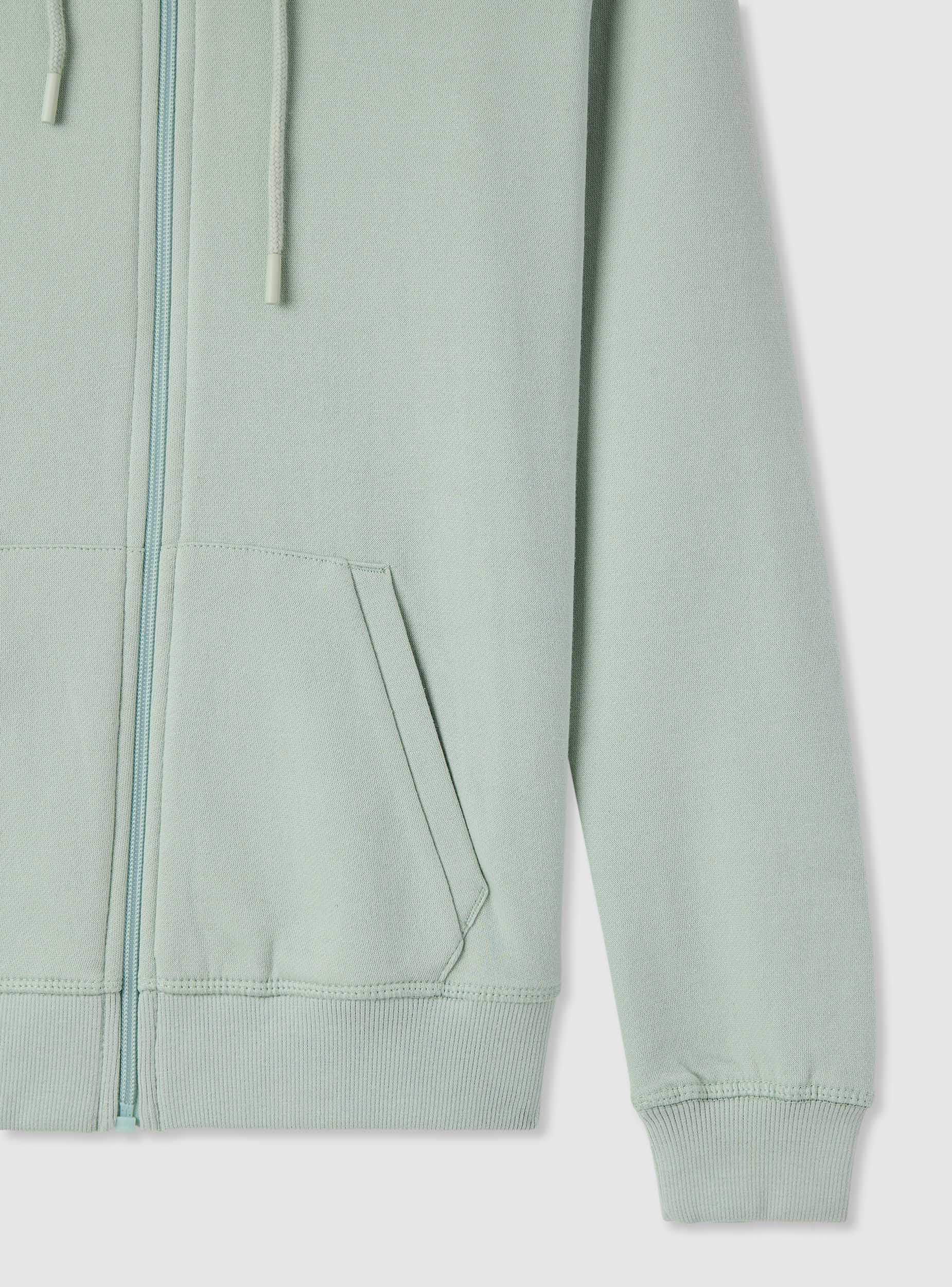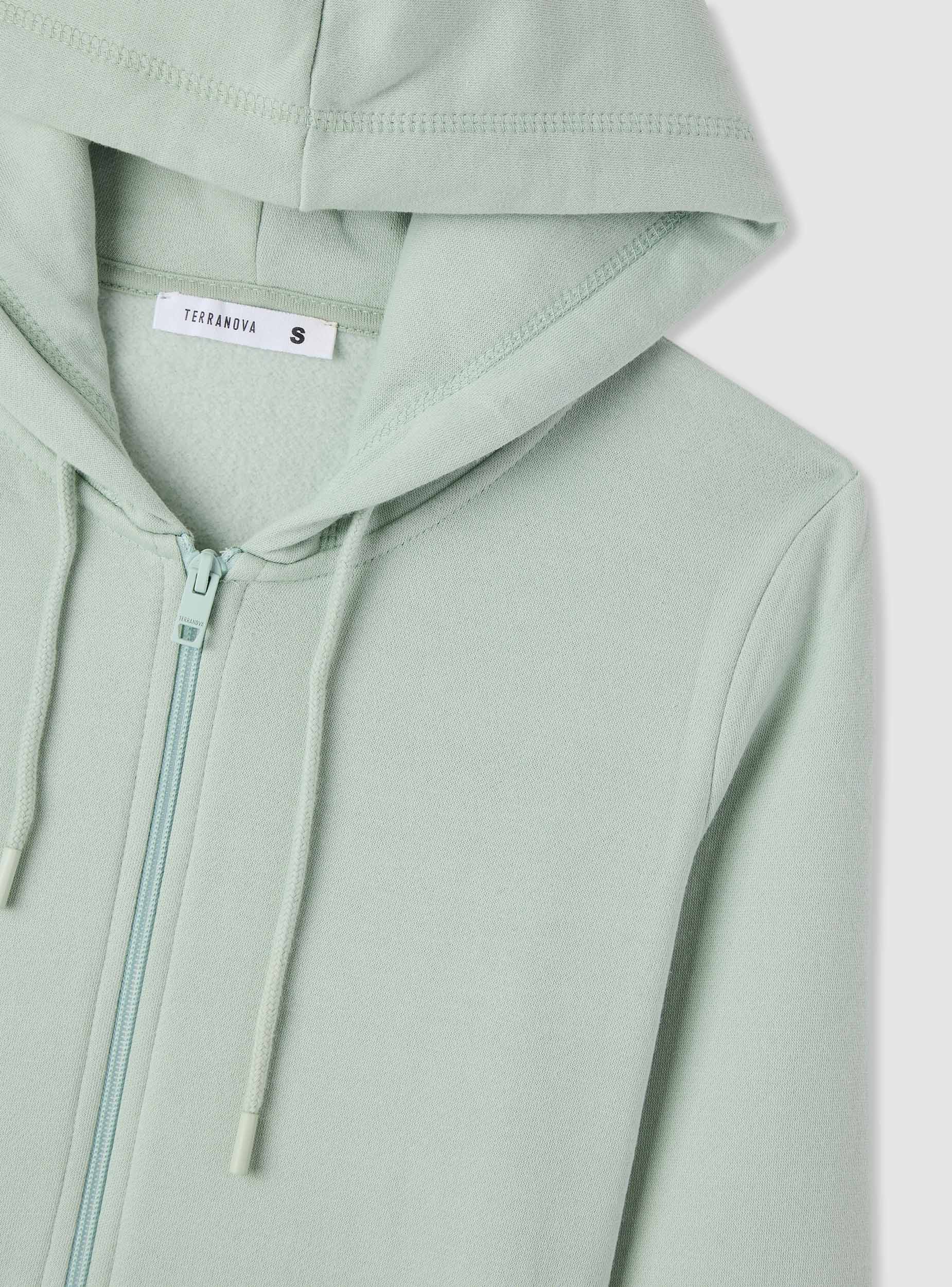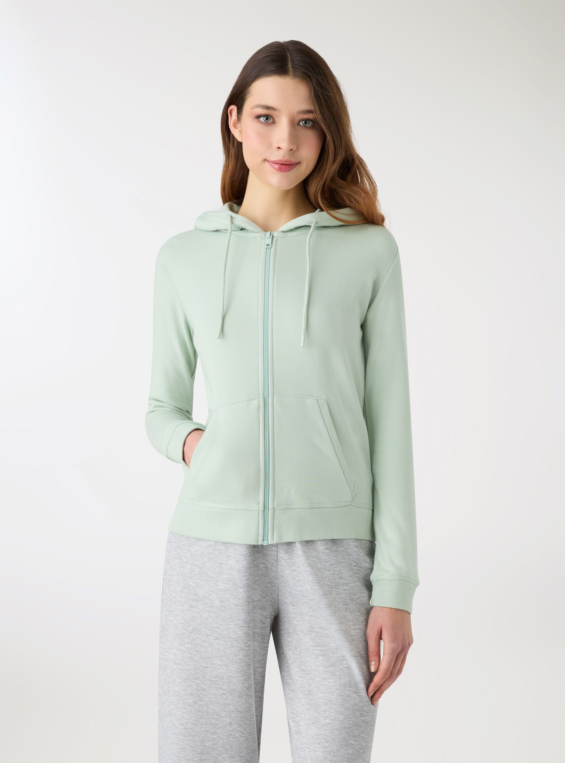 Women's hoodie with front zip, plain colour. Features long sleeves and ribbed cuffs, ideal for leisure time or to complete casual looks with jeans and sneakers. It has kangaroo pockets at the front and adjustable drawstrings on the hood. Regular fit. Lightweight fabric.Details
