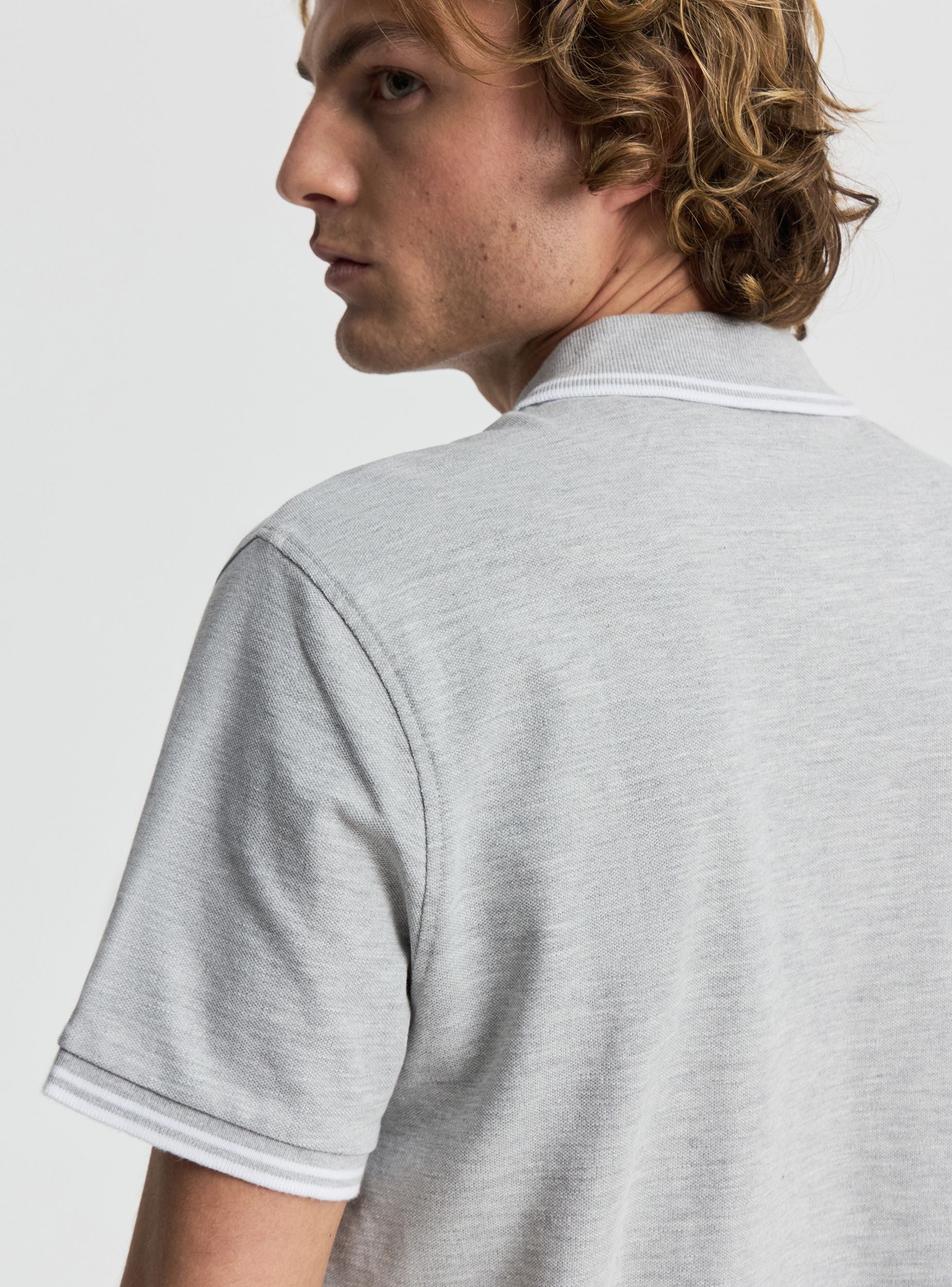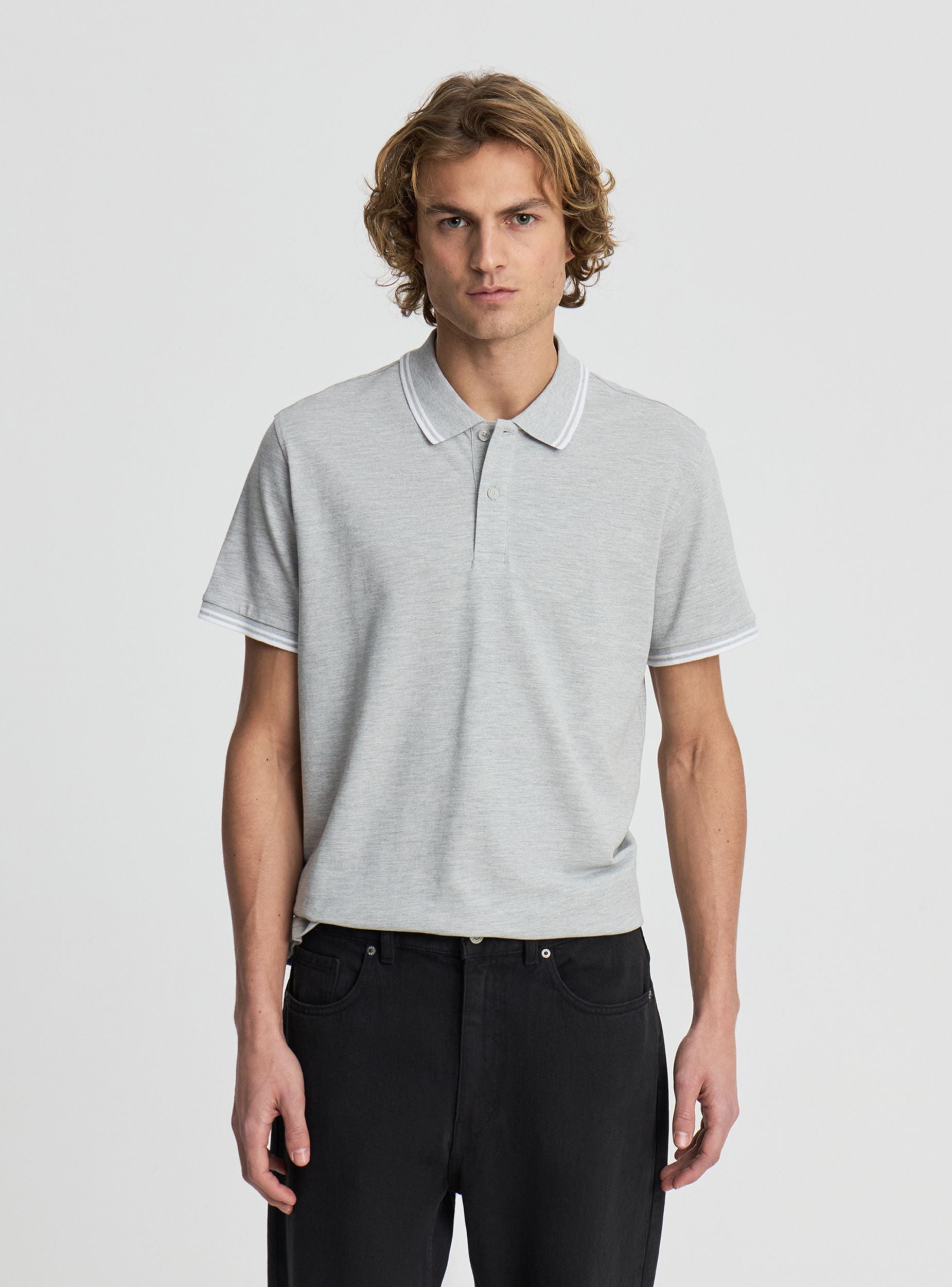 Men's t-shirt with a polo cut and solid colour. Classic collar with a two-button placket, short sleeves, and striped trims on the collar and sleeve edges that add a sporty touch. Ideal for leisure time or polished urban looks, it pairs well with jeans or chinos and sneakers. Regular fit, essential and practical design for everyday use.Details