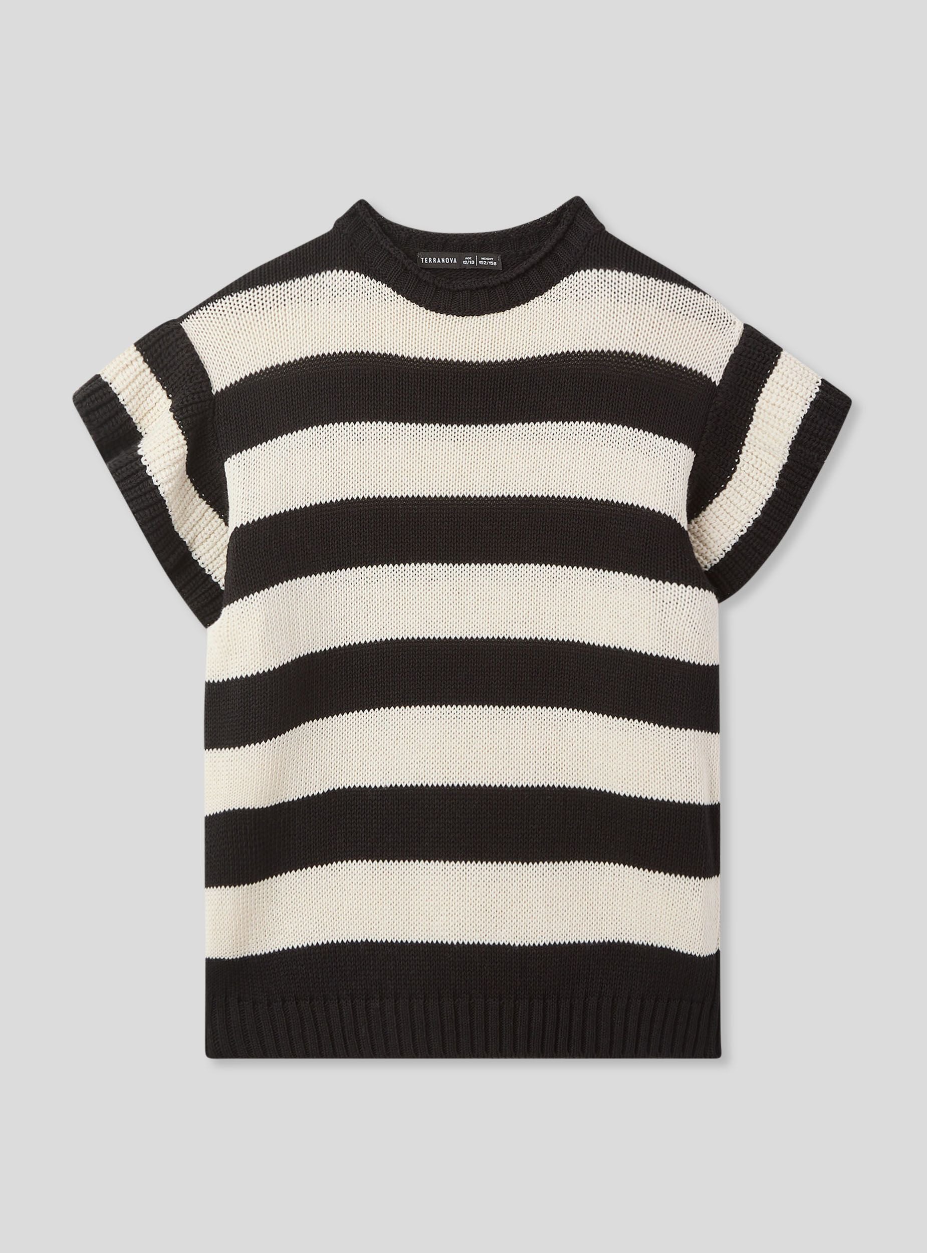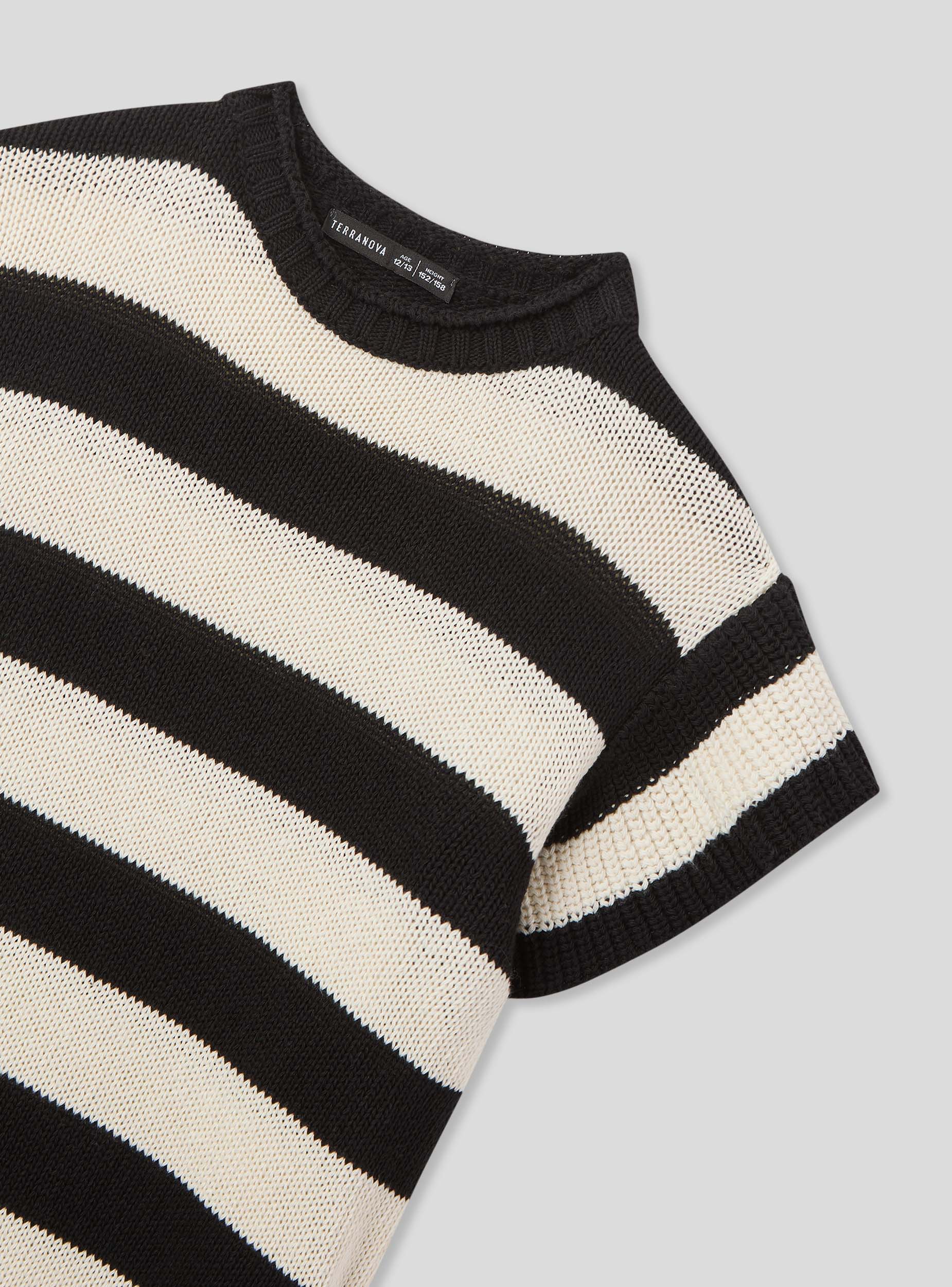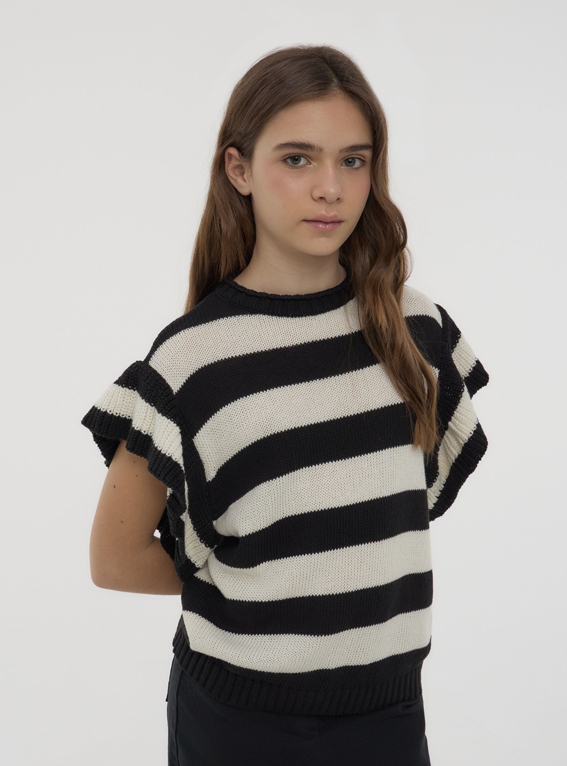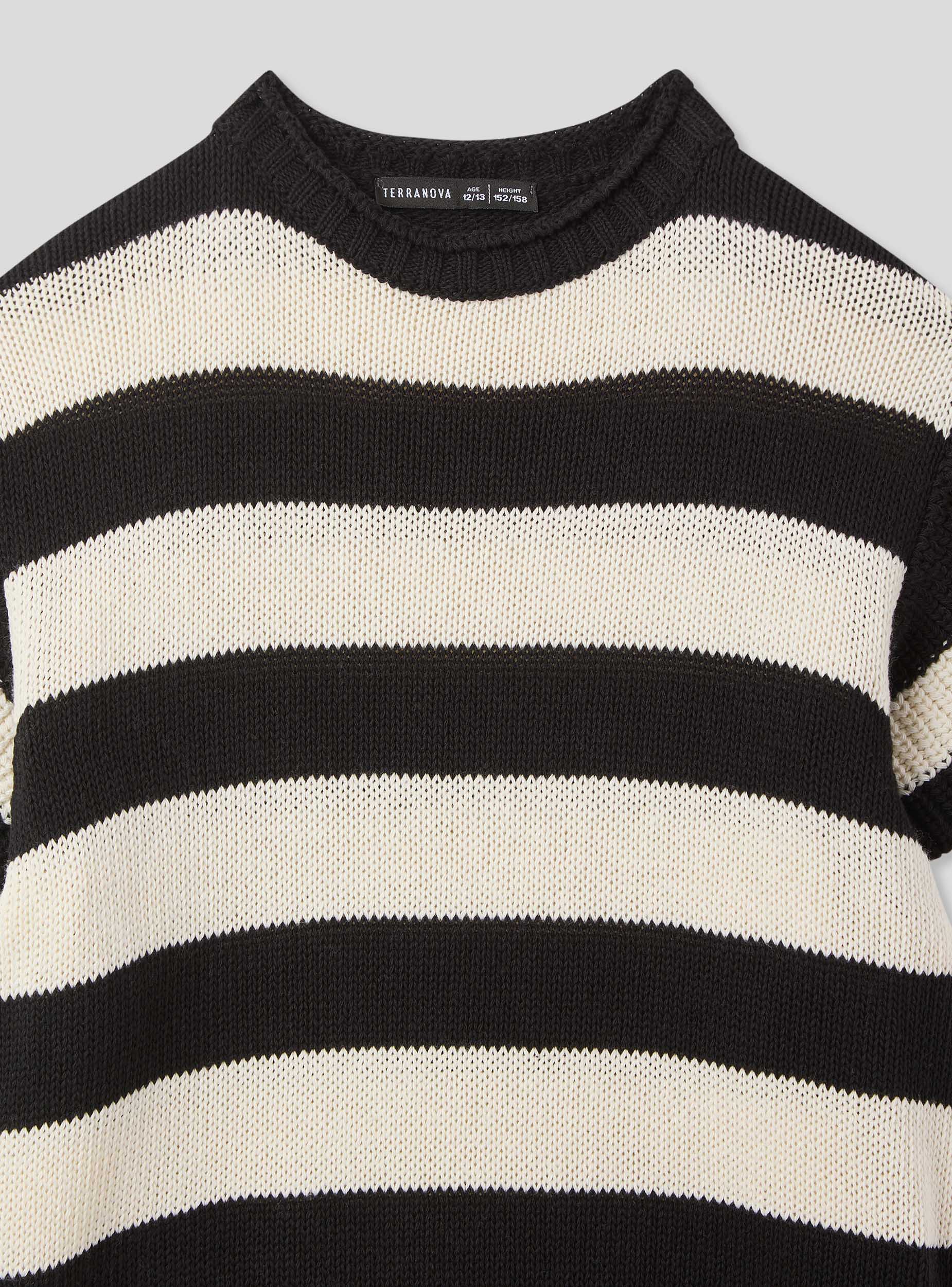 Girl's sweater ideal for a casual and comfortable look, perfect for leisure time or an informal outfit. Characterised by a regular fit, it features a striped design with short sleeves and a round neck. A versatile choice for those seeking comfort and style on any occasion.Details