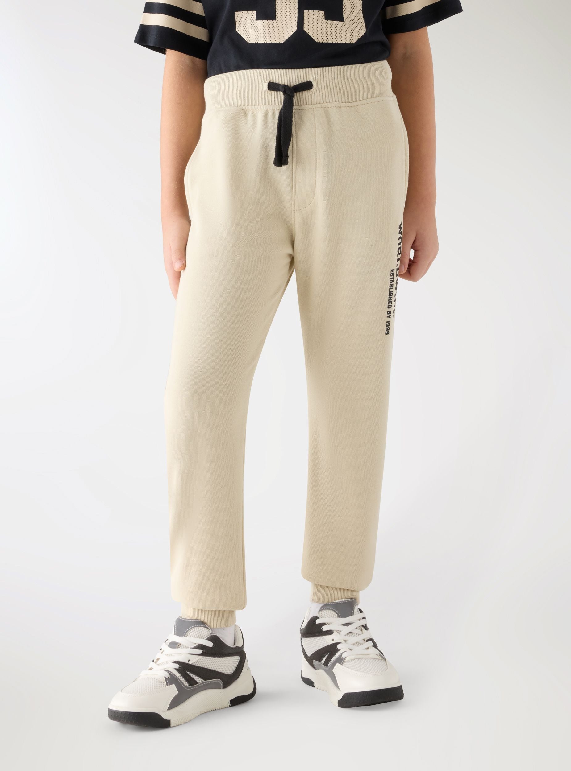 Plain-colour children's jogging trousers with side print. Long model with ankle cuffs and drawstring waist, ideal for school and leisure. Side pockets for practicality, regular fit and straight leg. Easy to pair with a t-shirt and sweatshirt for a sporty and casual look. Lightweight fabric.Details