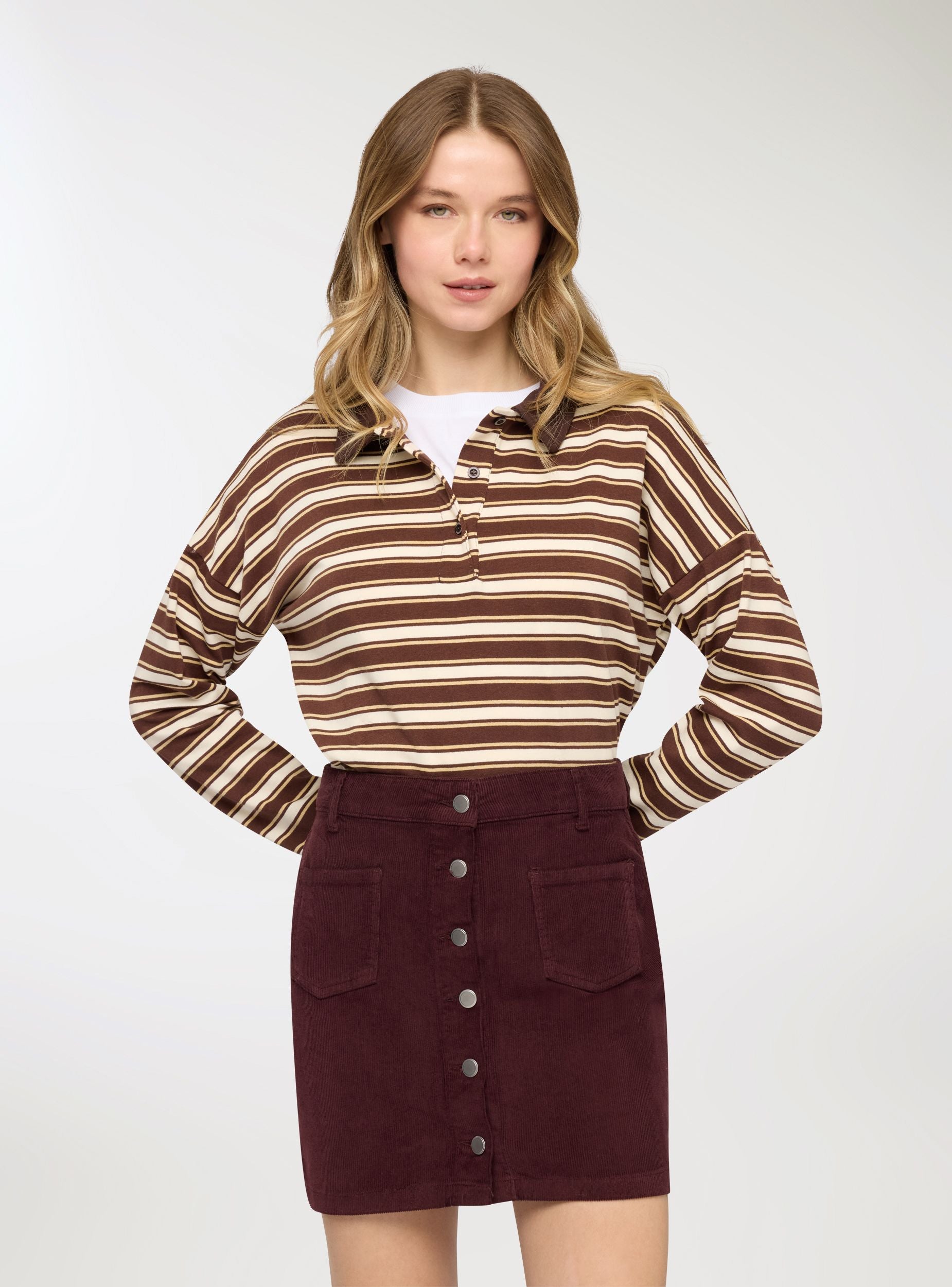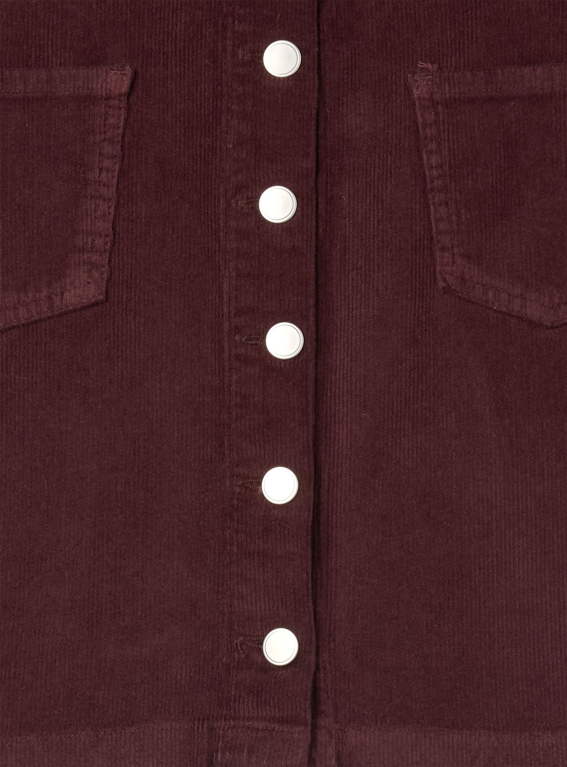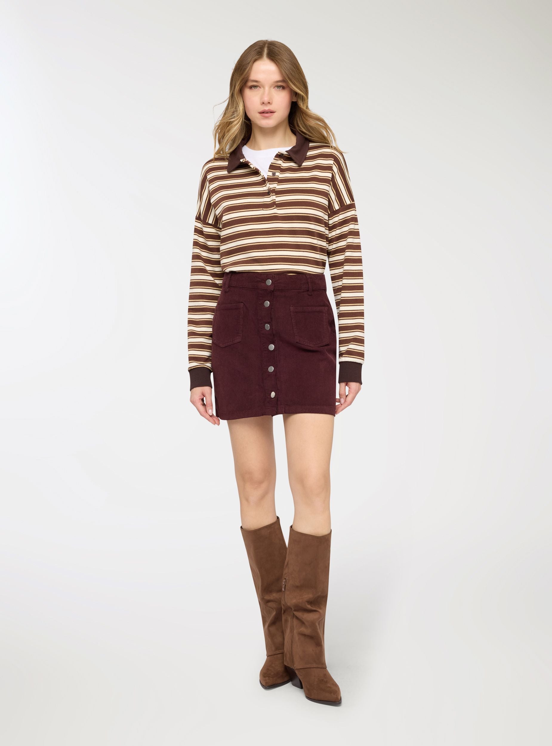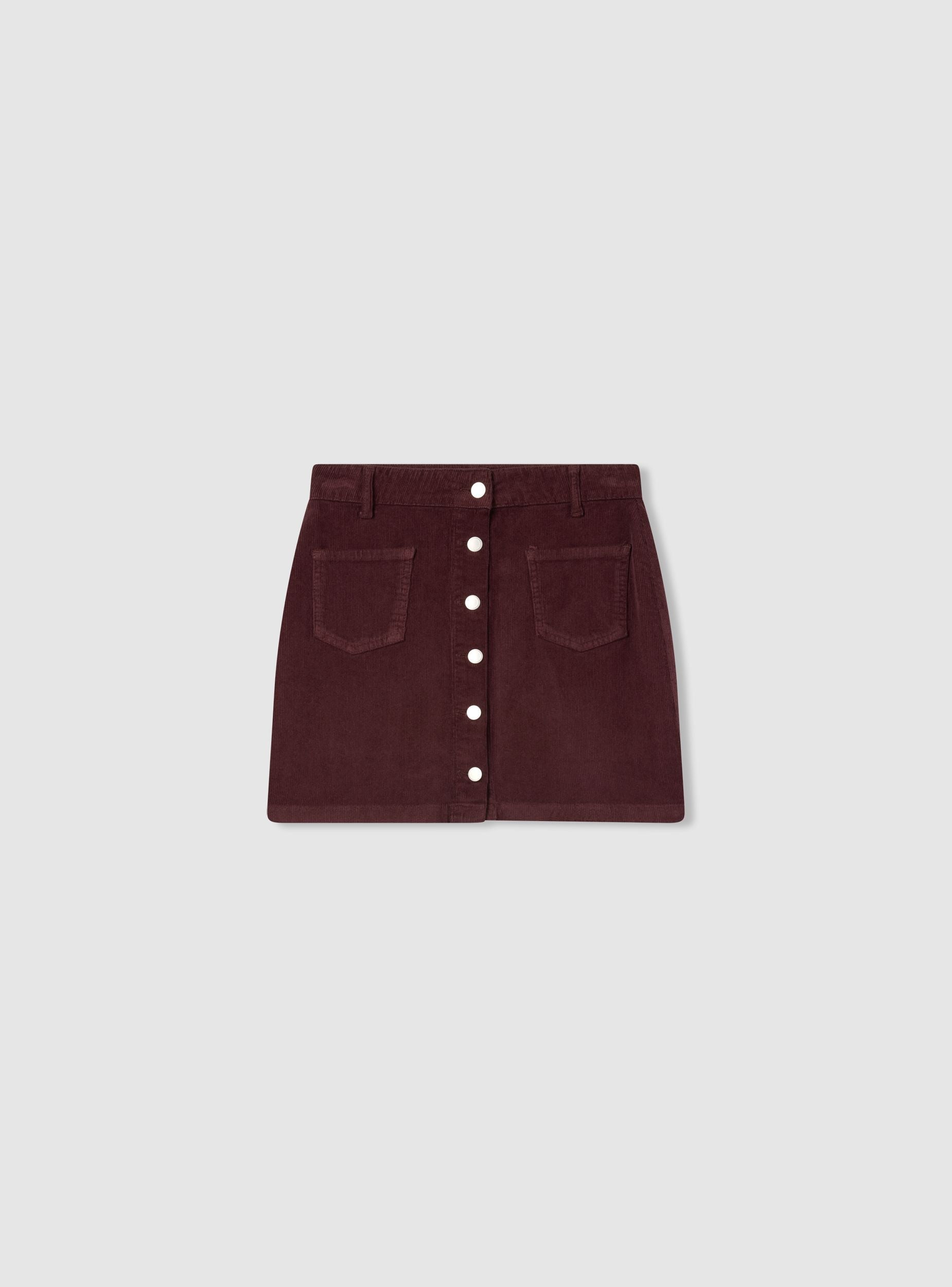 Women's solid colour skirt, mini style with a straight cut. Front closure with buttons and belt loops at the waist, ideal with tucked-in shirts or soft jumpers. Two patch pockets on the front add practicality and character. Perfect for casual looks with combat boots or ankle boots, it also suits trendy outfits with tall boots and a long-sleeve top.