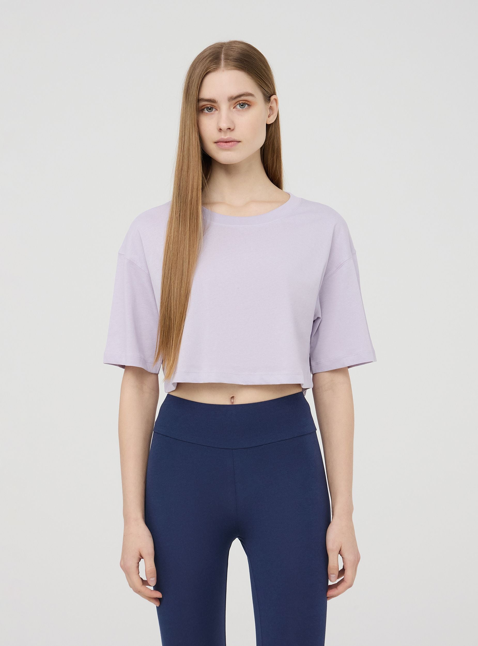 Women's plain crop top with a loose fit. The short style and wide sleeves give it a modern and casual look, perfect for creating summer outfits and pairing with high-waisted trousers or skirts. The simplicity of the design makes it versatile for various occasions.