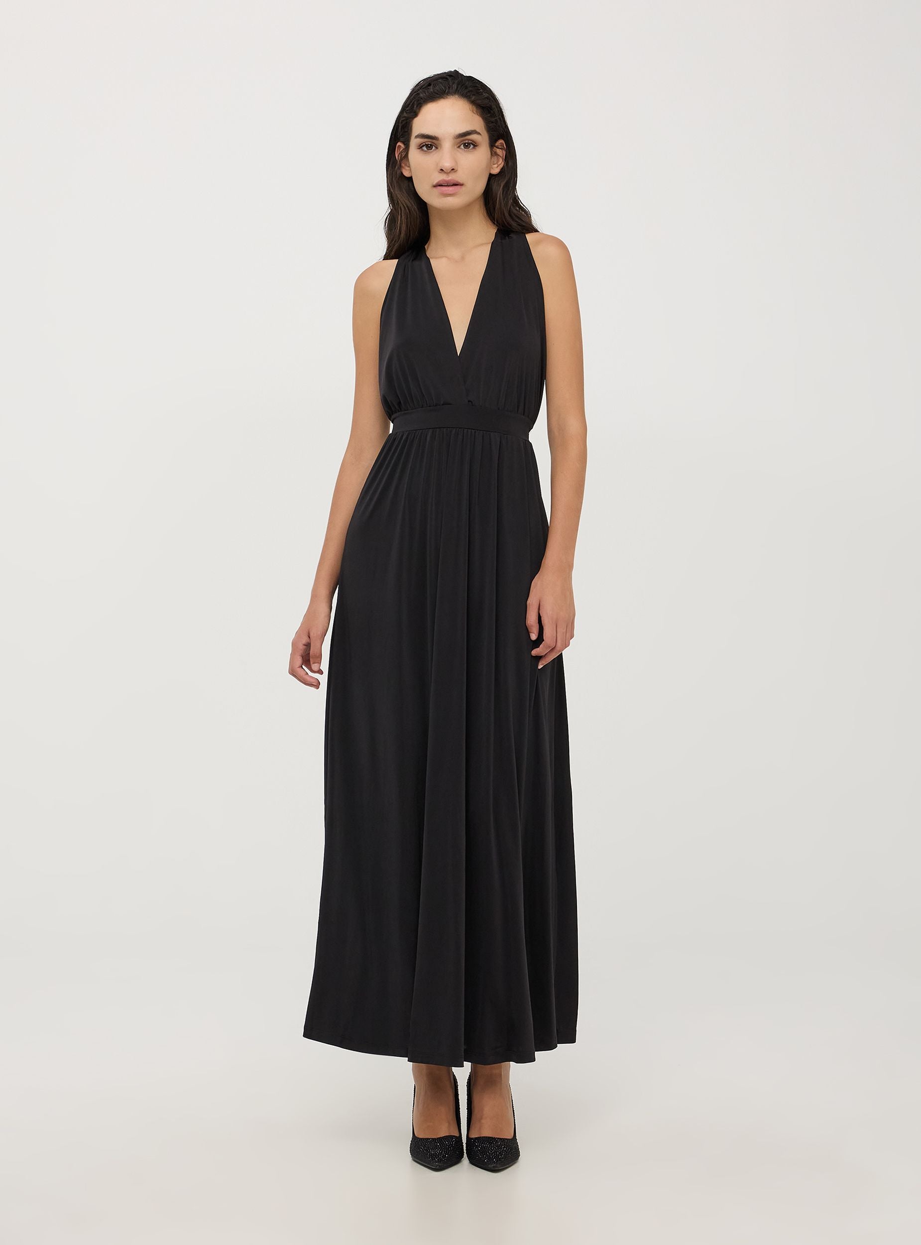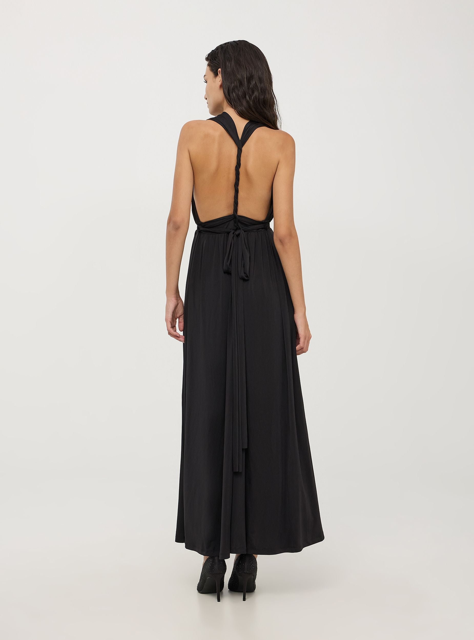 Vestido largo de mujer con escote profundo en V y cinturón en la cintura para definir la silueta. El diseño presenta una trenza decorativa en la parte posterior, añadiendo un detalle único y sofisticado. Ideal para ocasiones especiales y noches elegantes, ofrece un look femenino y refinado. La falda fluida aporta movimiento y ligereza.Detalles