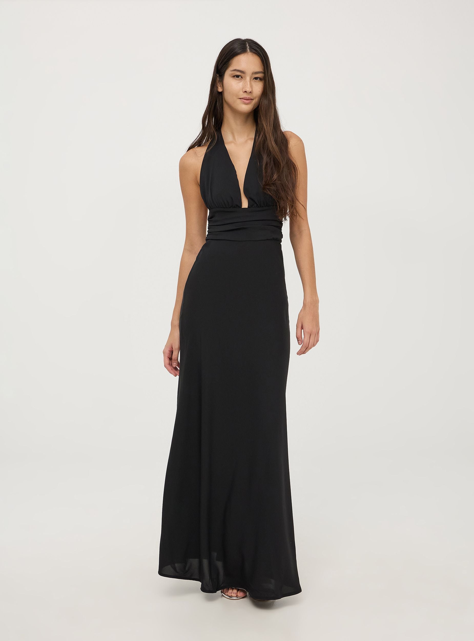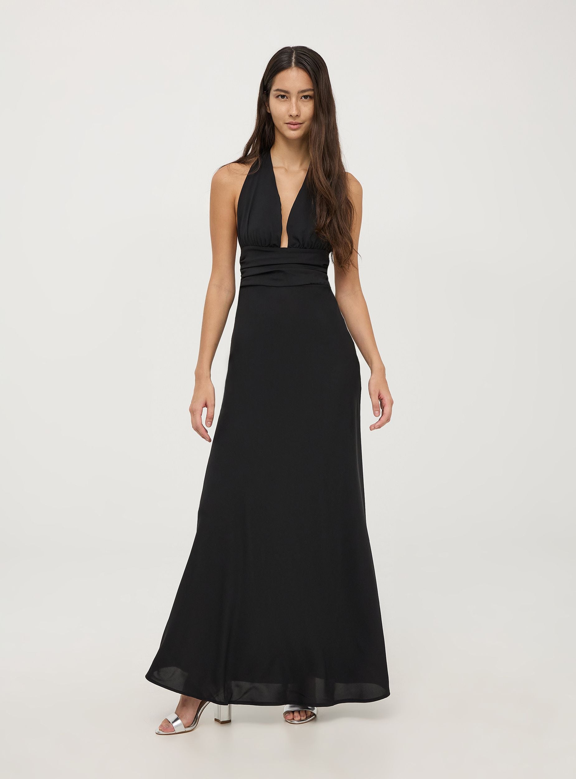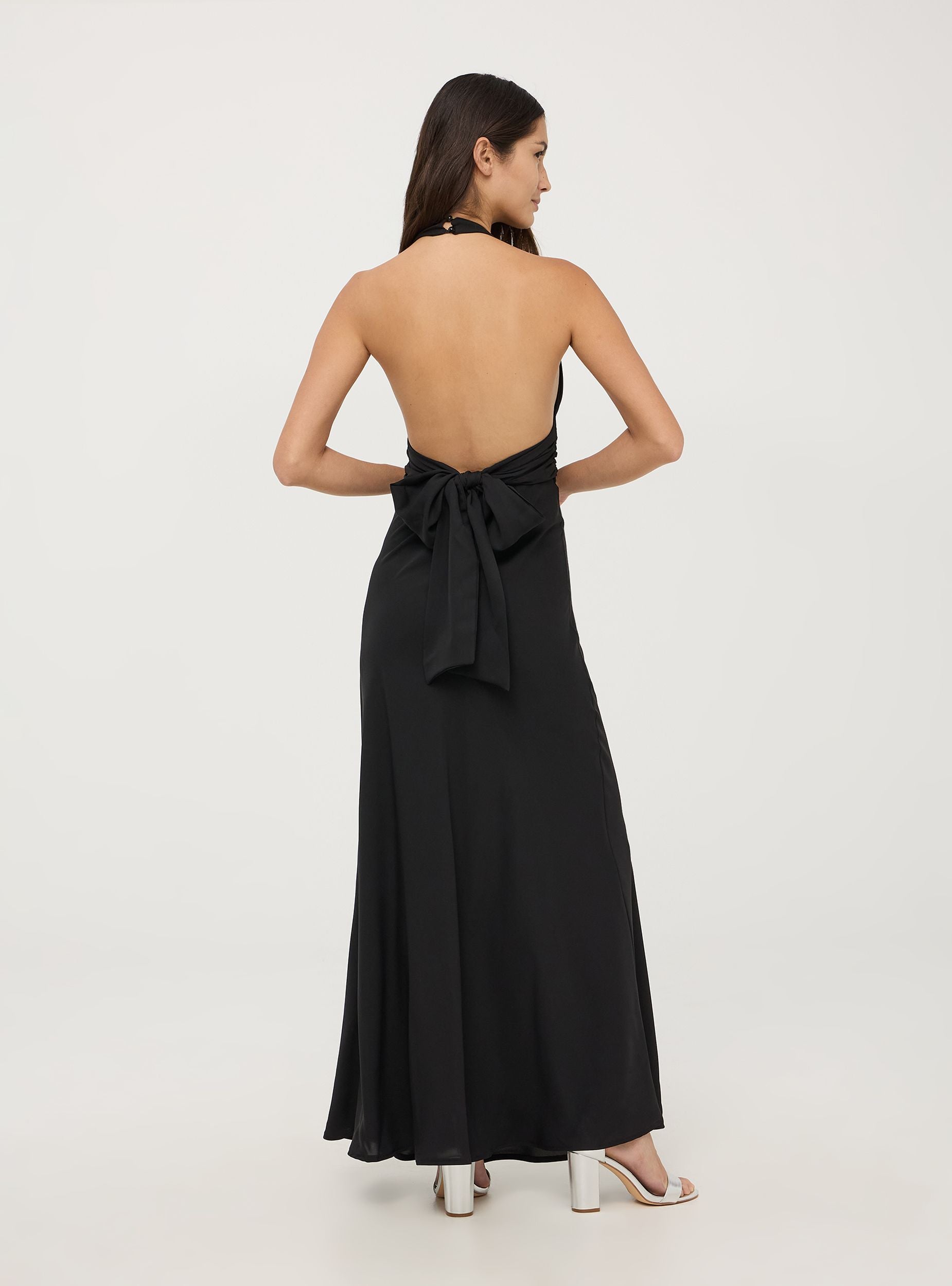 Vestido largo de mujer con atadura detrás del cuello y detalle de lazo en la espalda. La silueta ceñida en la cintura se ensancha hacia el fondo, aportando elegancia y fluidez a la prenda. Perfecto para noches elegantes y ocasiones especiales.Detalles