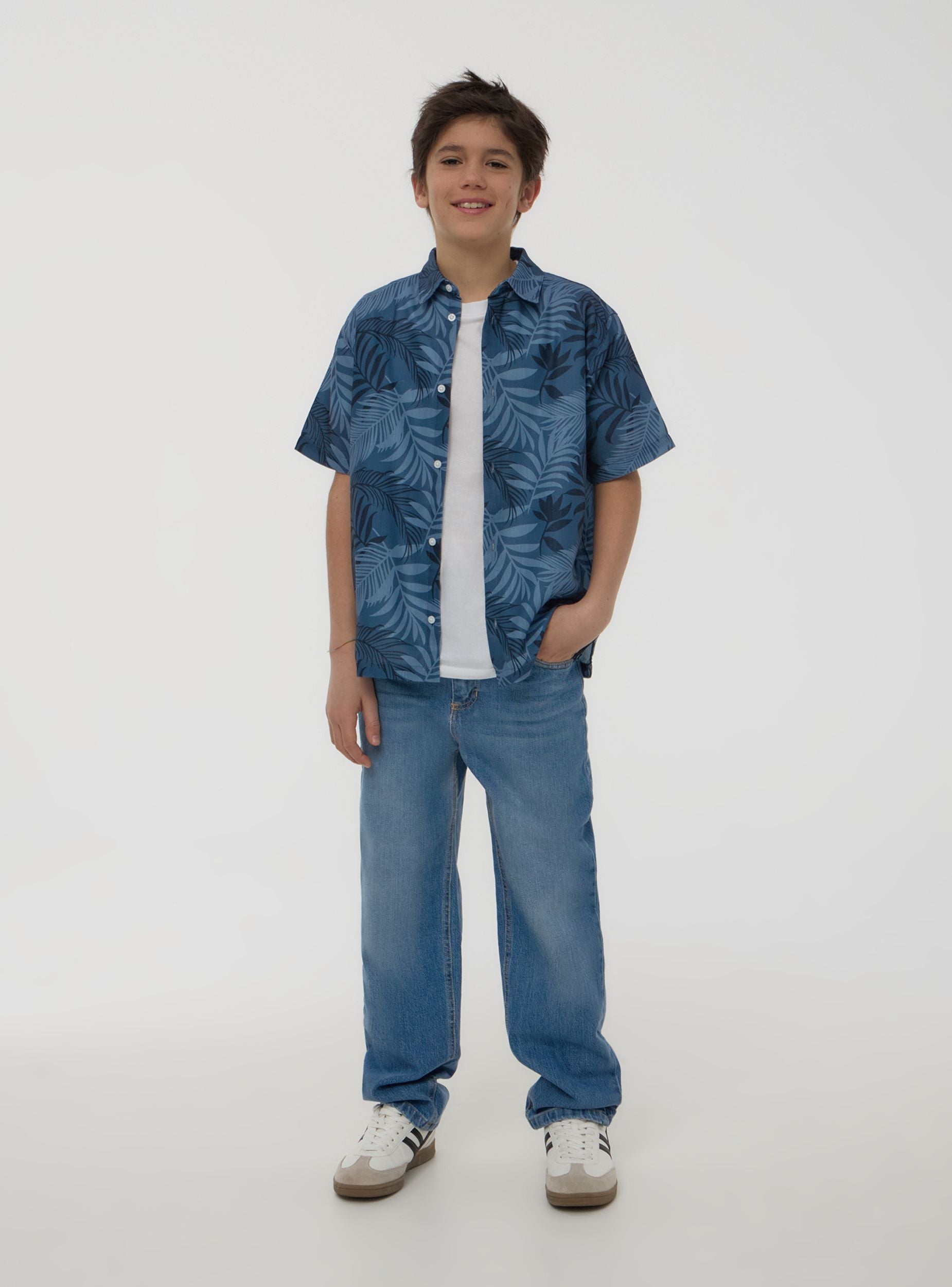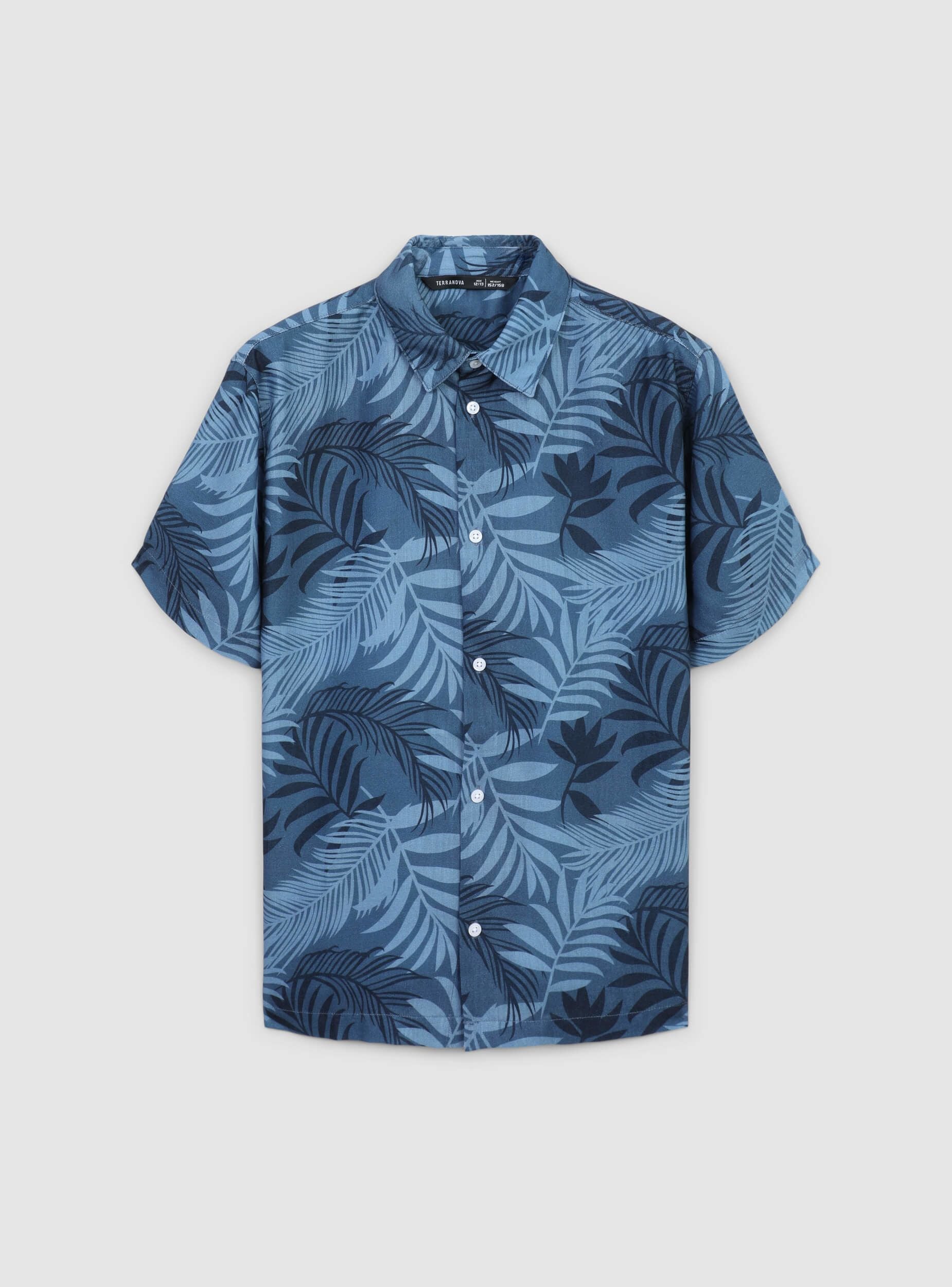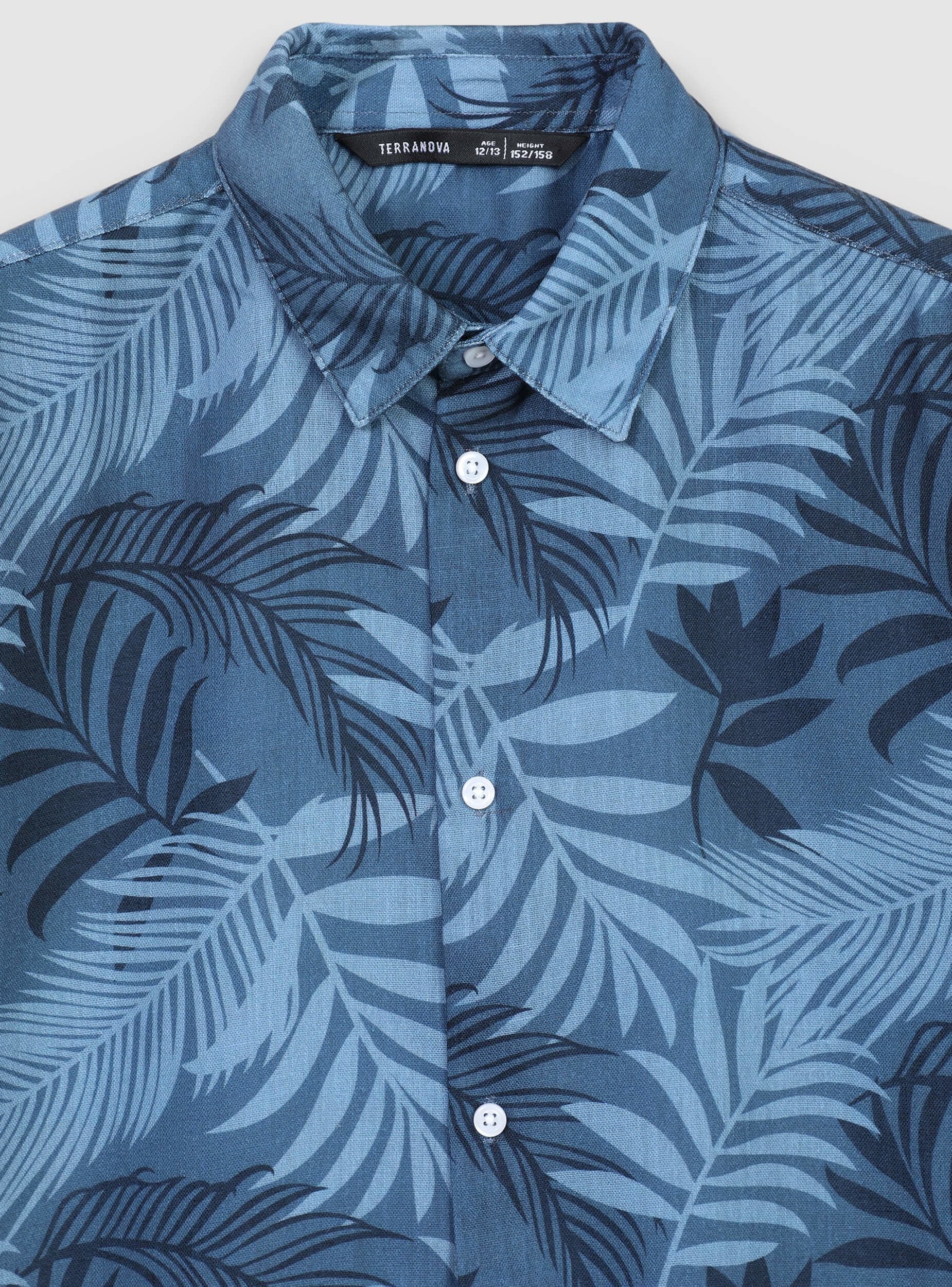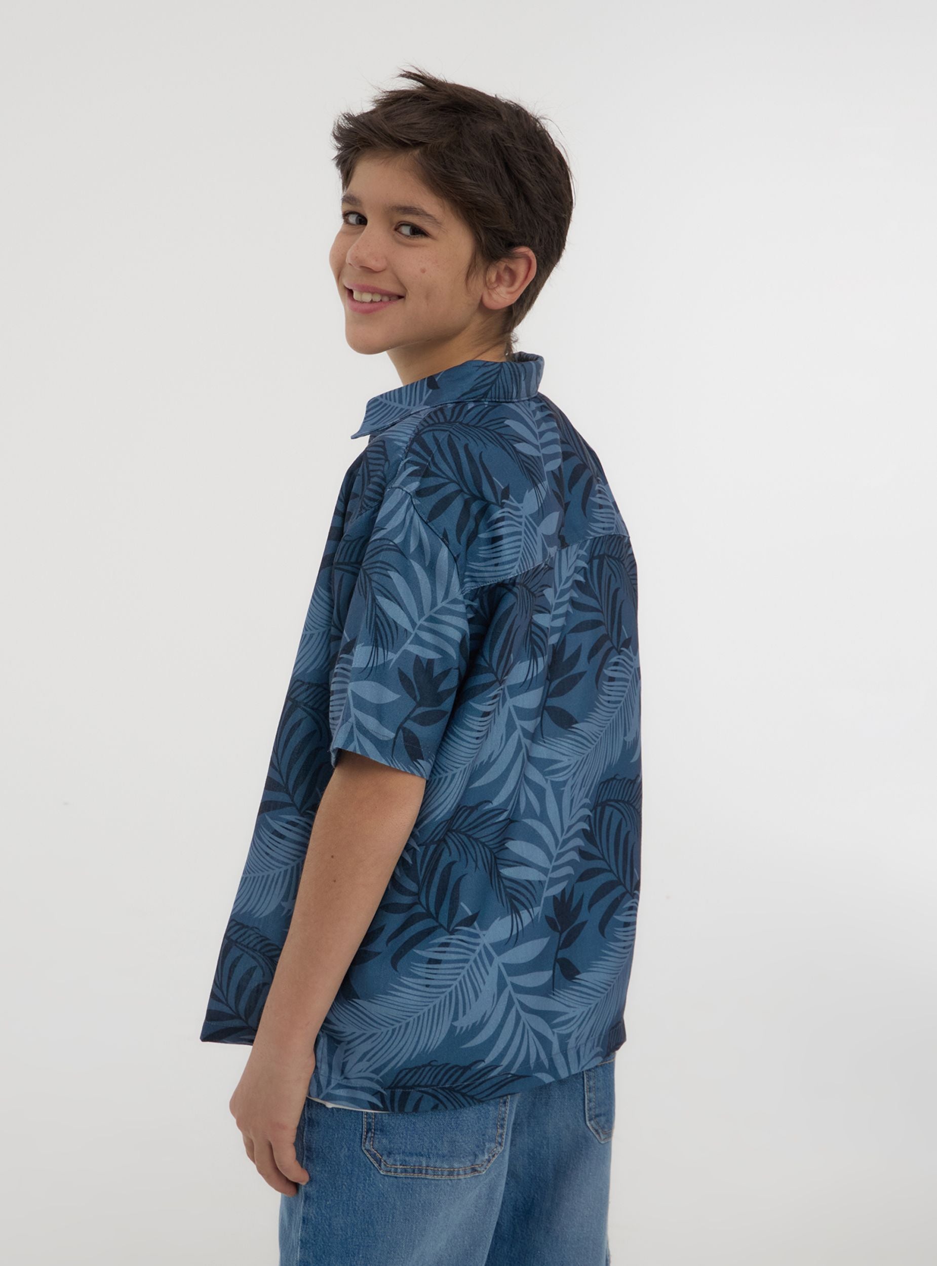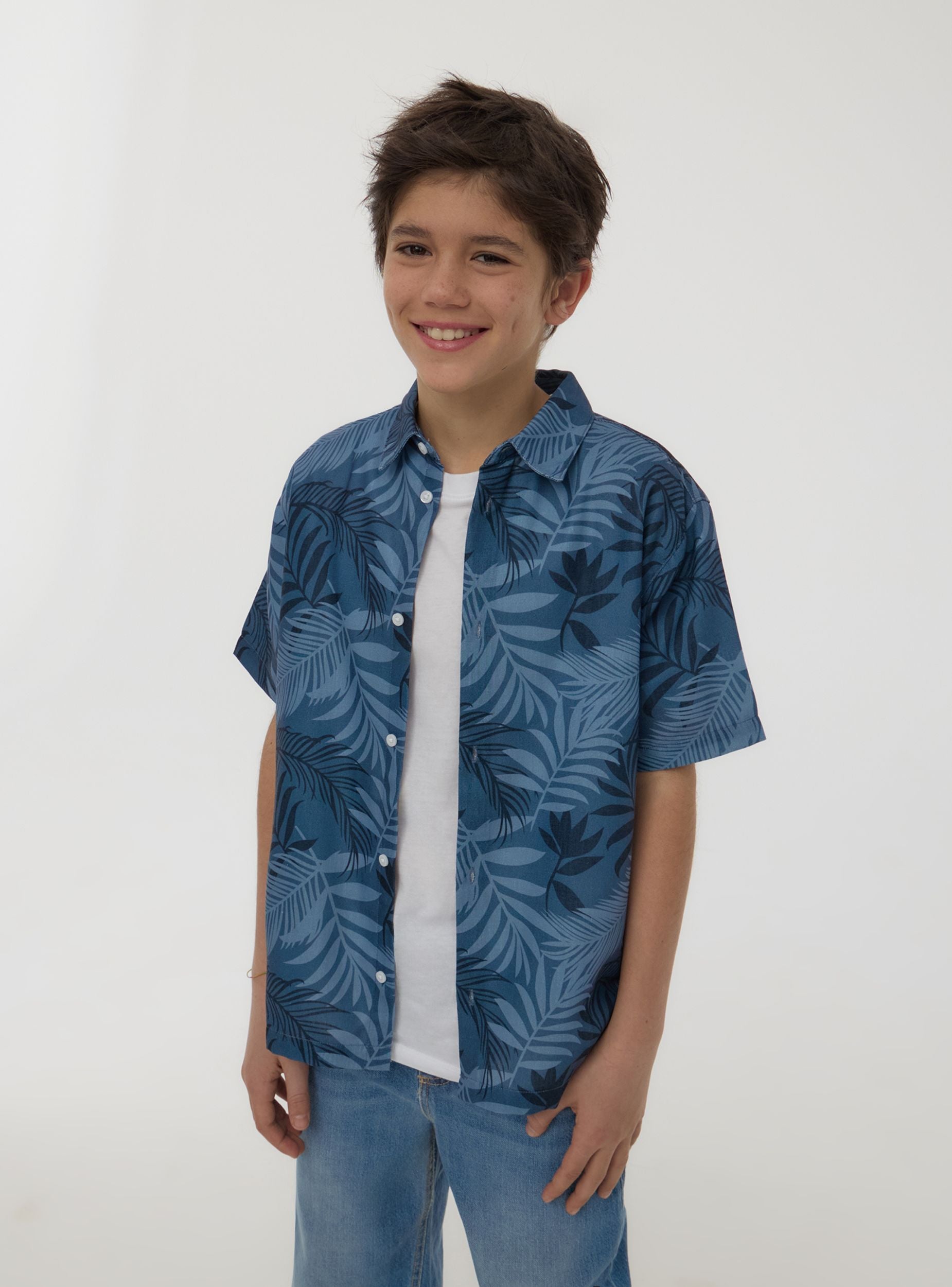 Camisa de niño con estampado de hojas, ideal para un look casual. Perfecta para días de verano o ocasiones informales, se combina fácilmente con pantalones cortos o vaqueros para un conjunto cómodo y a la moda. El diseño con cuello clásico y mangas cortas ofrece practicidad y estilo, convirtiéndola en una prenda versátil para el armario de los más pequeños.Detalles