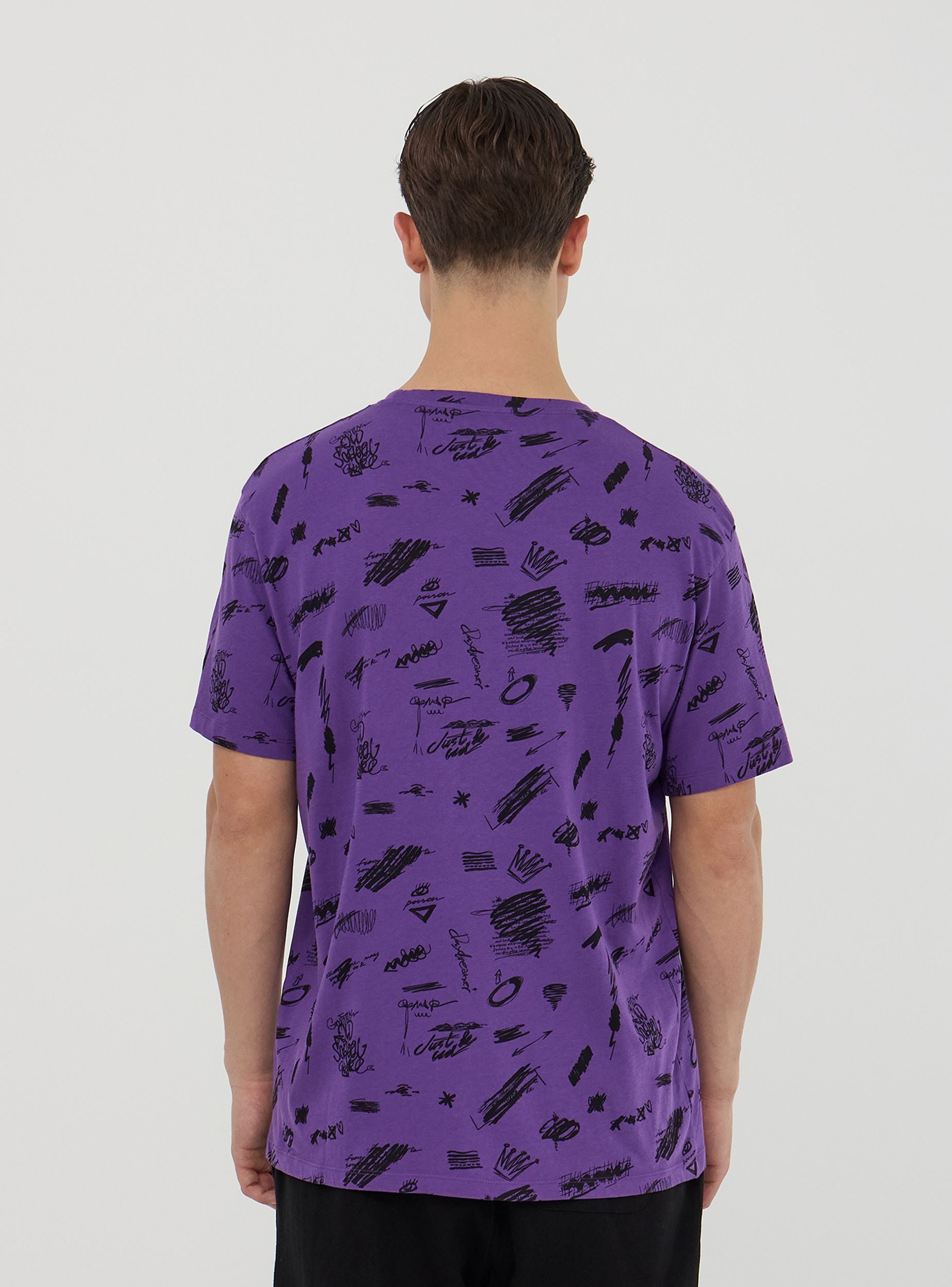 Camiseta de hombre de estilo urbano y moderno, caracterizada por una impresión allover con temática de graffiti que ofrece un aspecto original y creativo. Las mangas cortas y el cuello redondo garantizan comodidad y versatilidad, haciéndola perfecta para combinar con jeans o pantalones cargo. Ideal para ocasiones informales como salidas por la ciudad, eventos casuales o momentos de ocio con amigos.Detalles