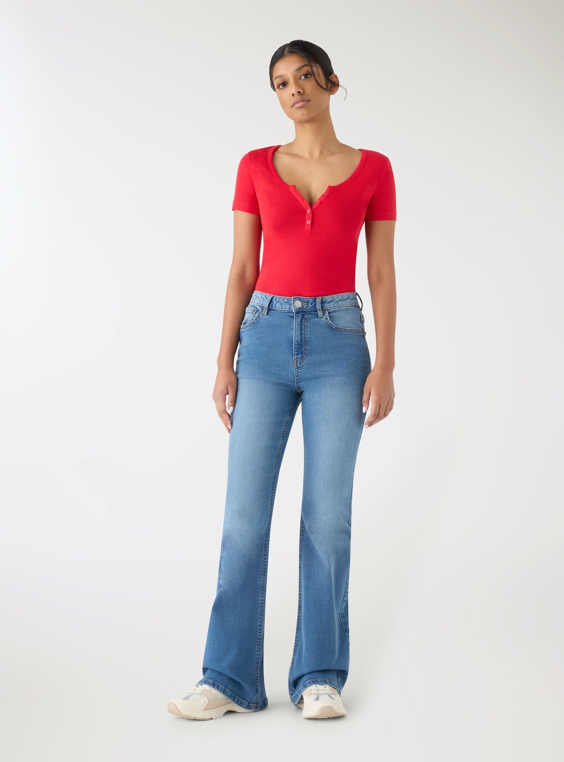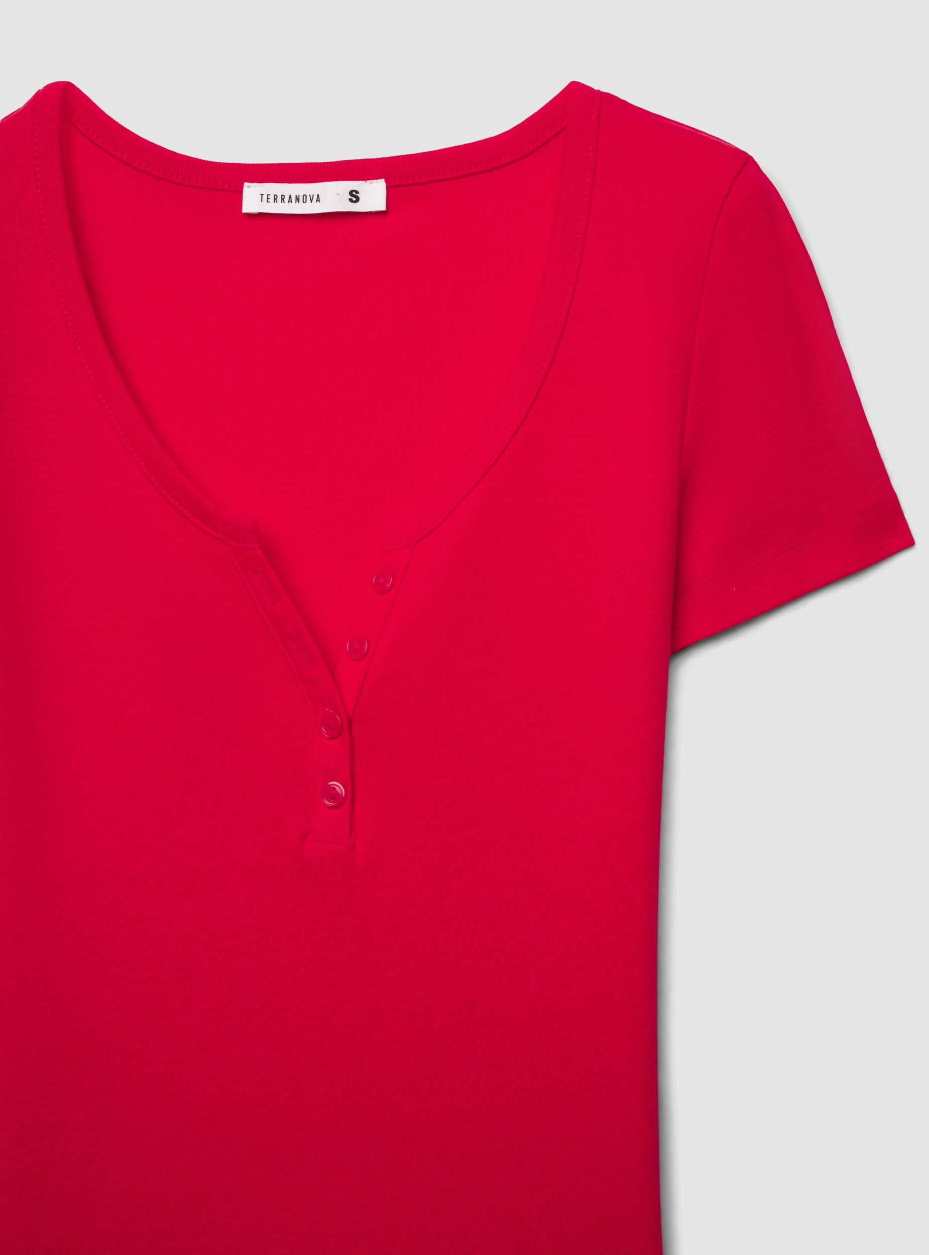 Camiseta de mujer lisa con escote serafino profundo y abotonadura corta de cuatro botones. Mangas cortas y corte ajustado que realza la figura, perfecta para llevar bajo chaquetas y cárdigans o combinada con vaqueros y faldas para el tiempo libre. Versátil para la oficina informal o las salidas diarias, se pone con facilidad gracias a su diseño esencial y femenino.Detalles