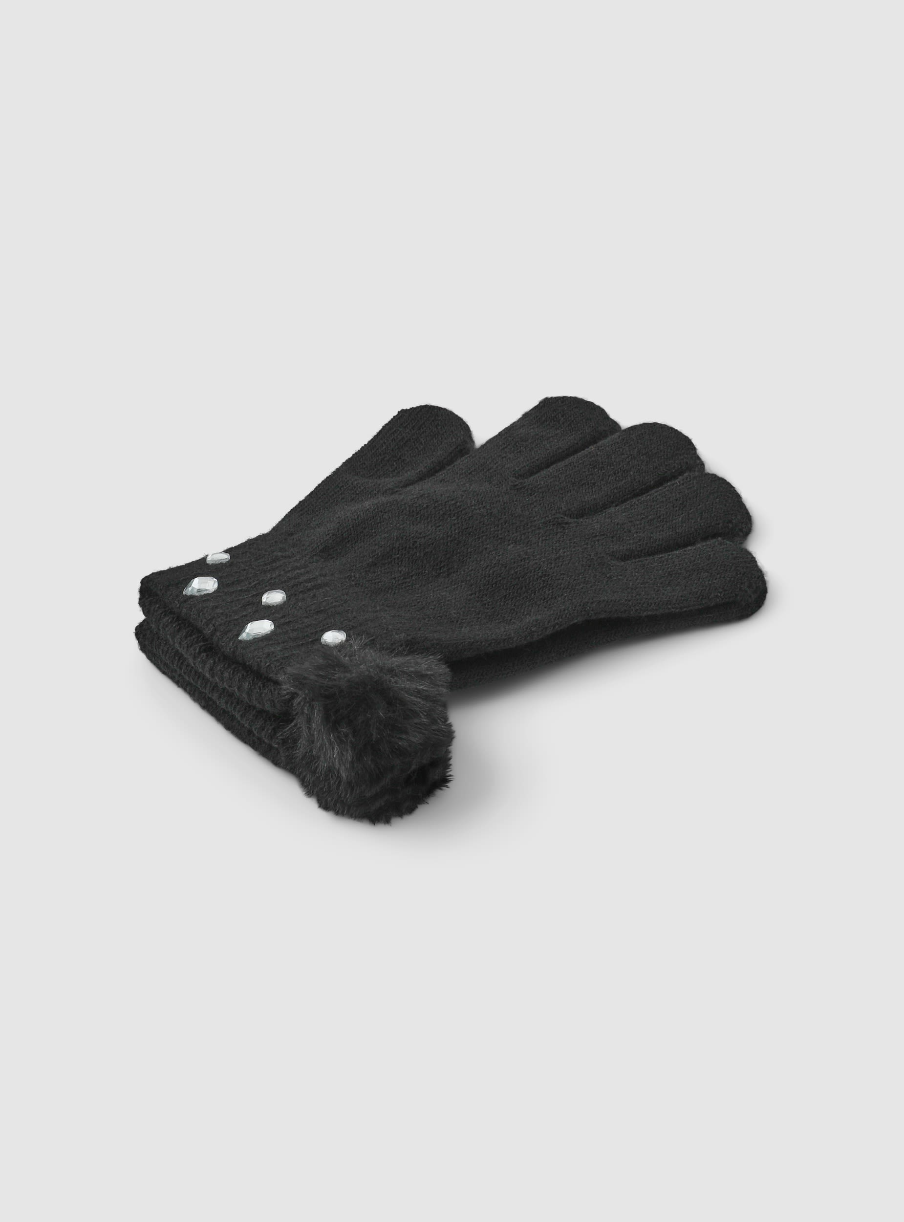 Guantes para niña ideales para proteger las manos del frío con estilo. Presentan un diseño con pompones decorativos y aplicaciones brillantes en el puño, añadiendo un toque de elegancia. Perfectos para completar conjuntos invernales informales o para ocasiones especiales. El ajuste cómodo y el material suave garantizan confort durante su uso.Detalles