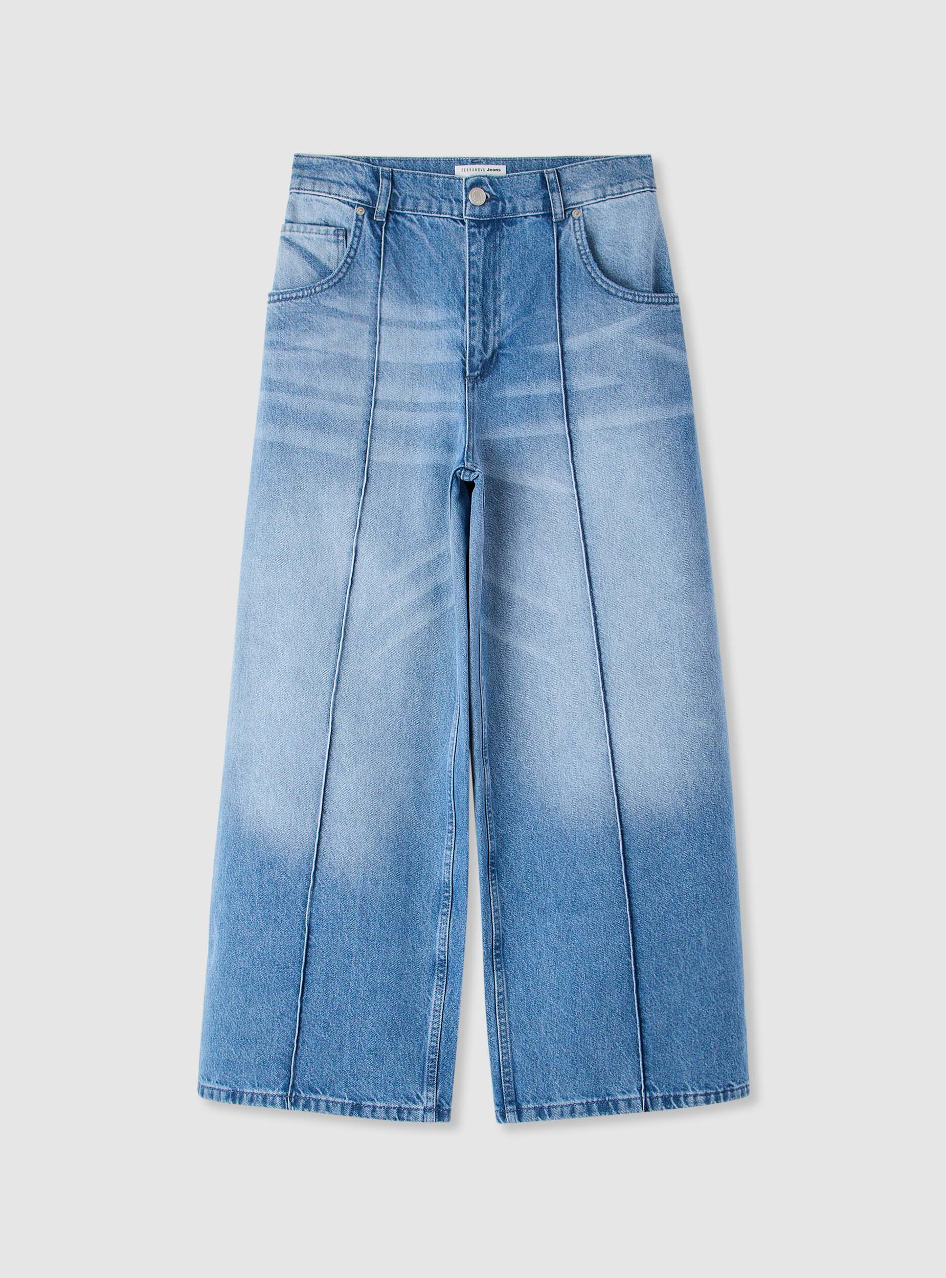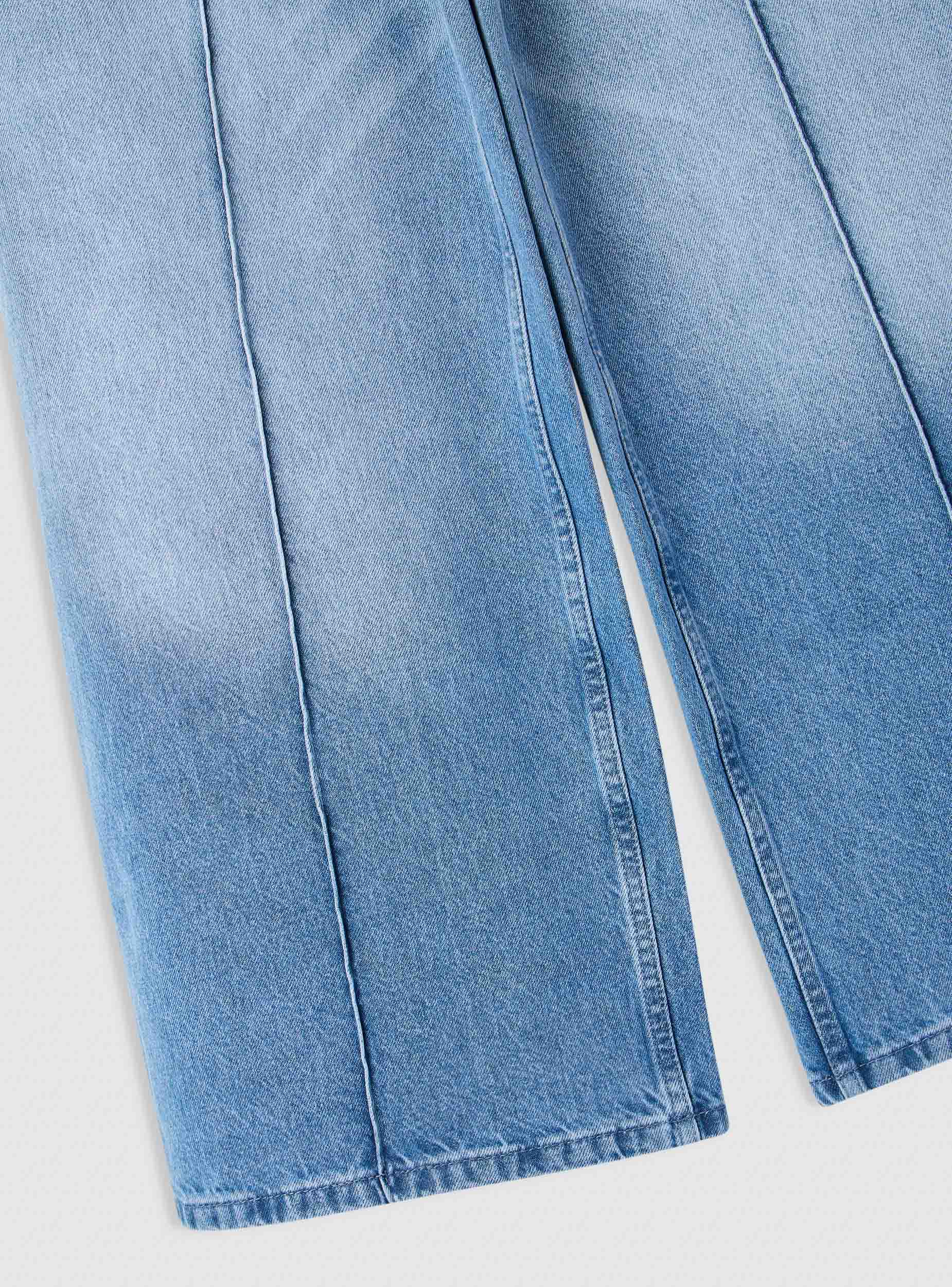 Vaqueros de mujer de pierna ancha en color liso, realzados con una costura frontal que recorre toda la pierna, aportando un toque sartorial y contemporáneo. La cintura media y el corte amplio garantizan comodidad y soltura en todo momento. Equipados con bolsillos delanteros y traseros, con cierre de botón. Perfectos para combinar con tops cortos, camisas oversize o blazers para looks versátiles, ideales tanto para el tiempo libre como para salidas casuales.Detalles