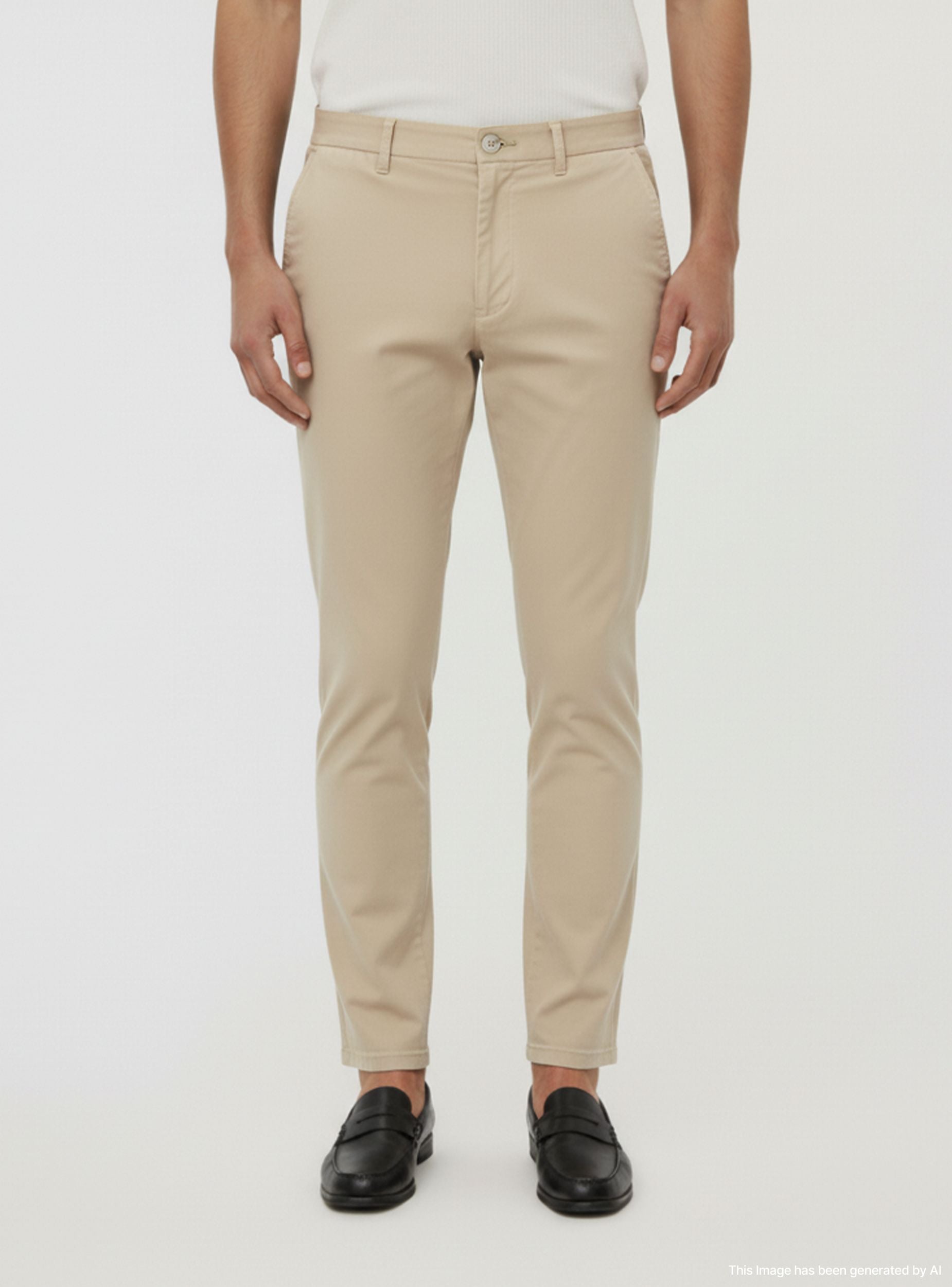 Pantalones chinos de hombre con un diseño moderno, caracterizados por una línea ajustada que realza la figura. El color sólido proporciona un aspecto versátil, ideal para cualquier ocasión, mientras que los prácticos bolsillos laterales y traseros añaden funcionalidad. La cintura regular con cierre frontal garantiza comodidad y ajuste, haciendo de estos pantalones una elección perfecta para un look cuidado y contemporáneo.Detalles