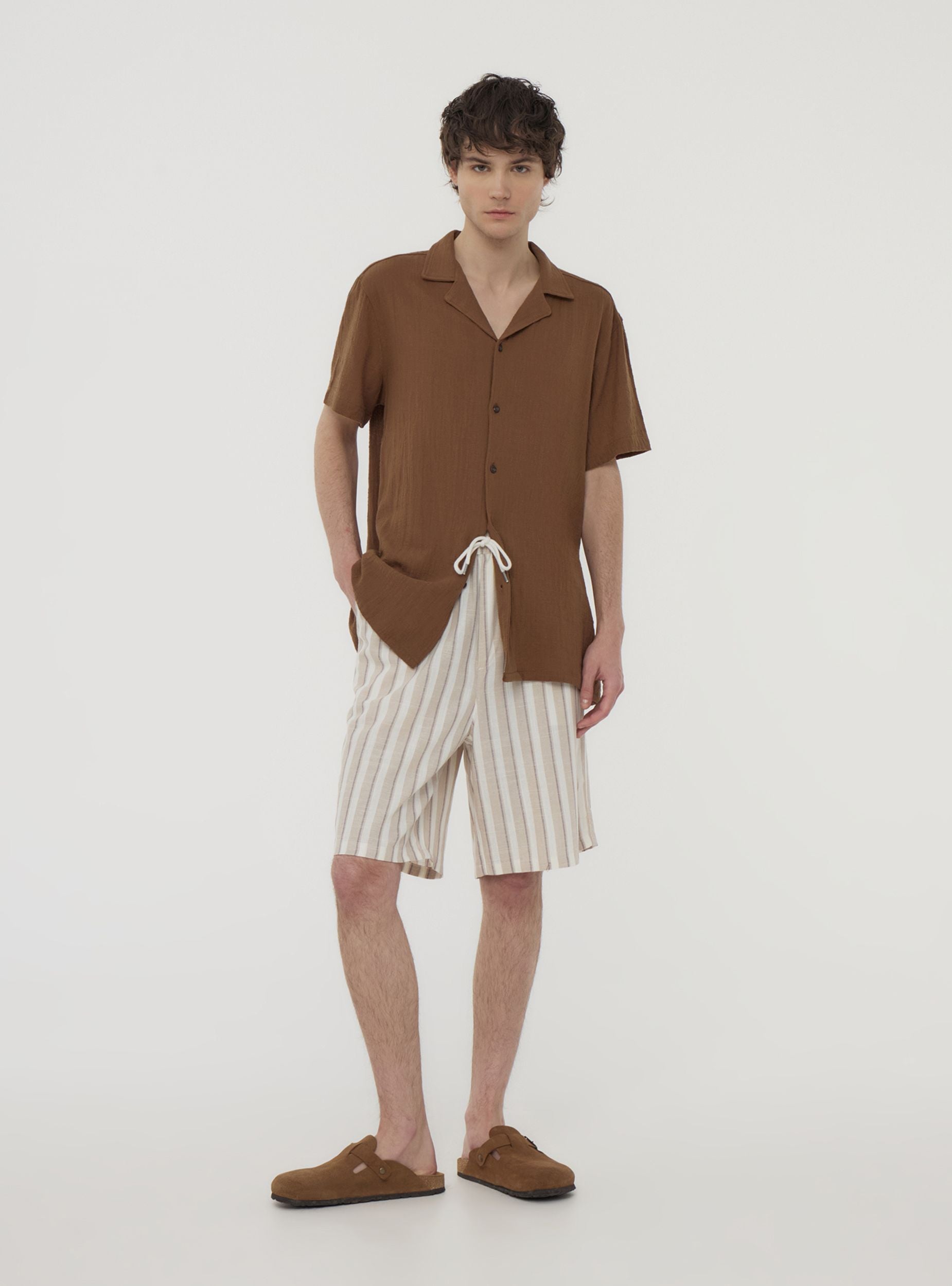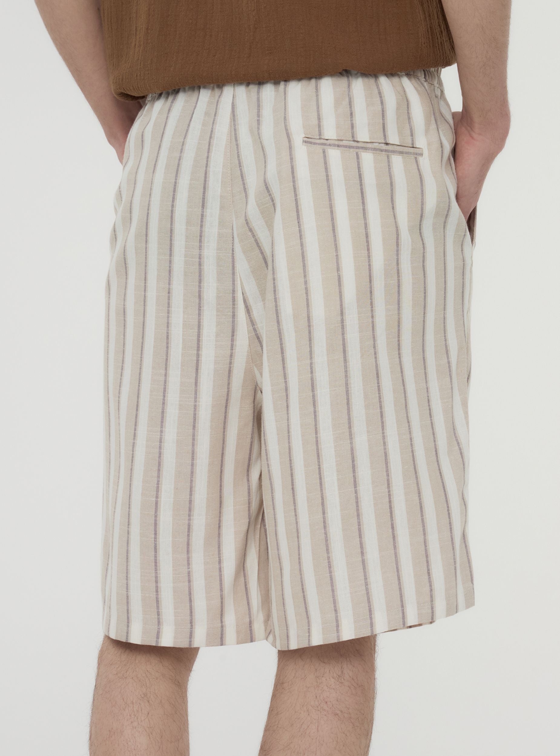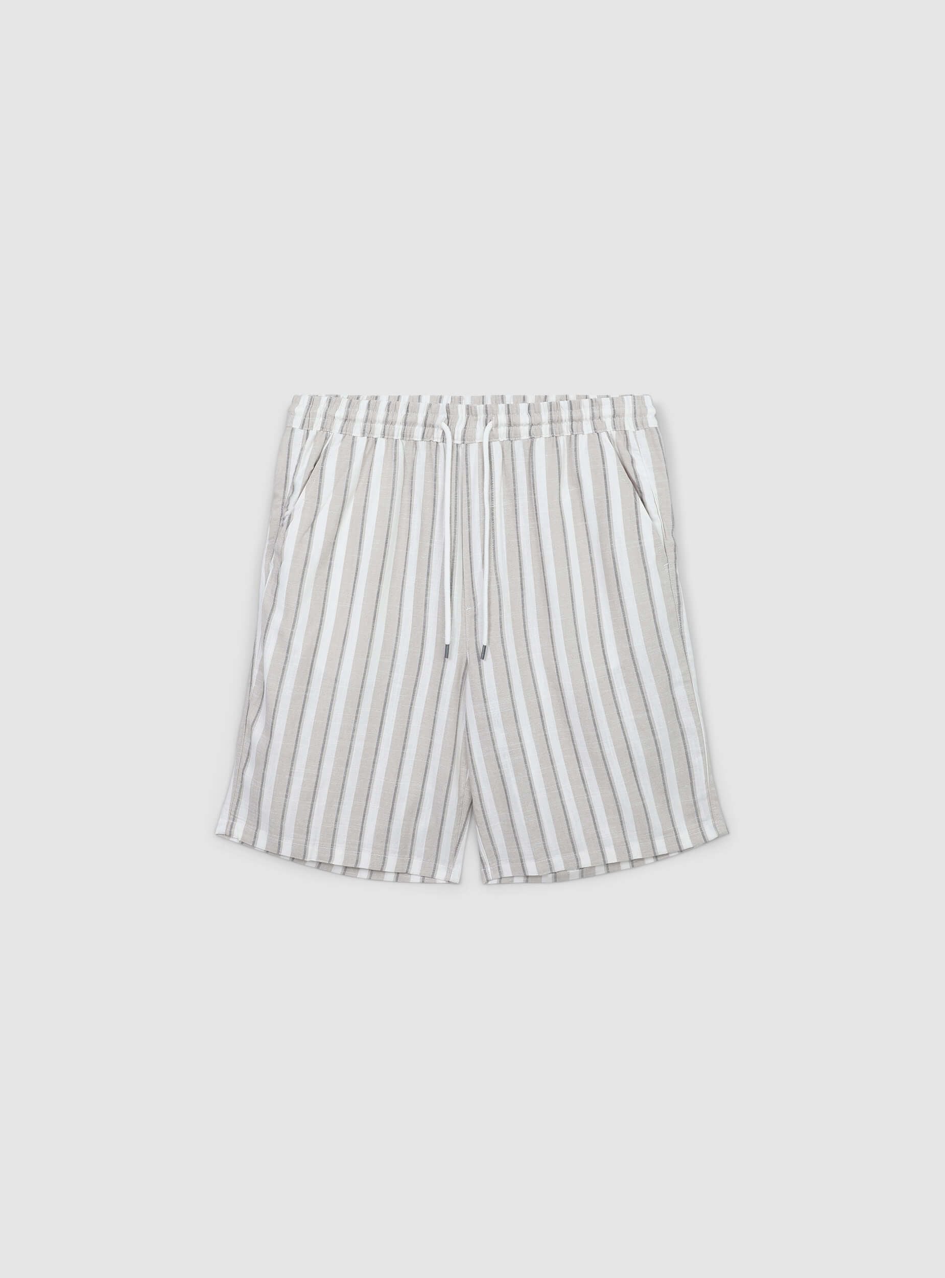 'Pantalones cortos para hombre realizados en tejido de mezcla de lino, son ideales para un look casual y relajado, y perfectos para el tiempo libre o los días de verano. Caracterizados por un ajuste regular, presentan un diseño con rayas desfasadas y un cierre con cordón. Equipados con bolsillos laterales y cintura elástica, ofrecen comodidad y estilo para cada ocasión informal.'Detalles