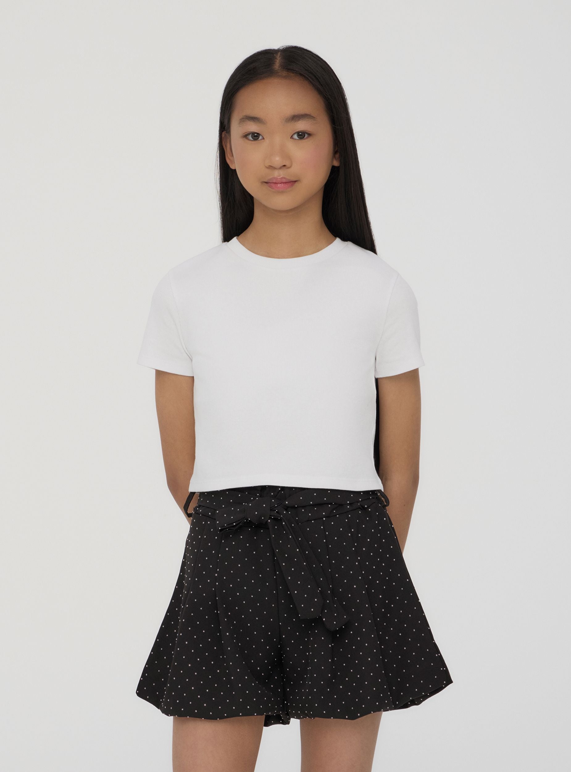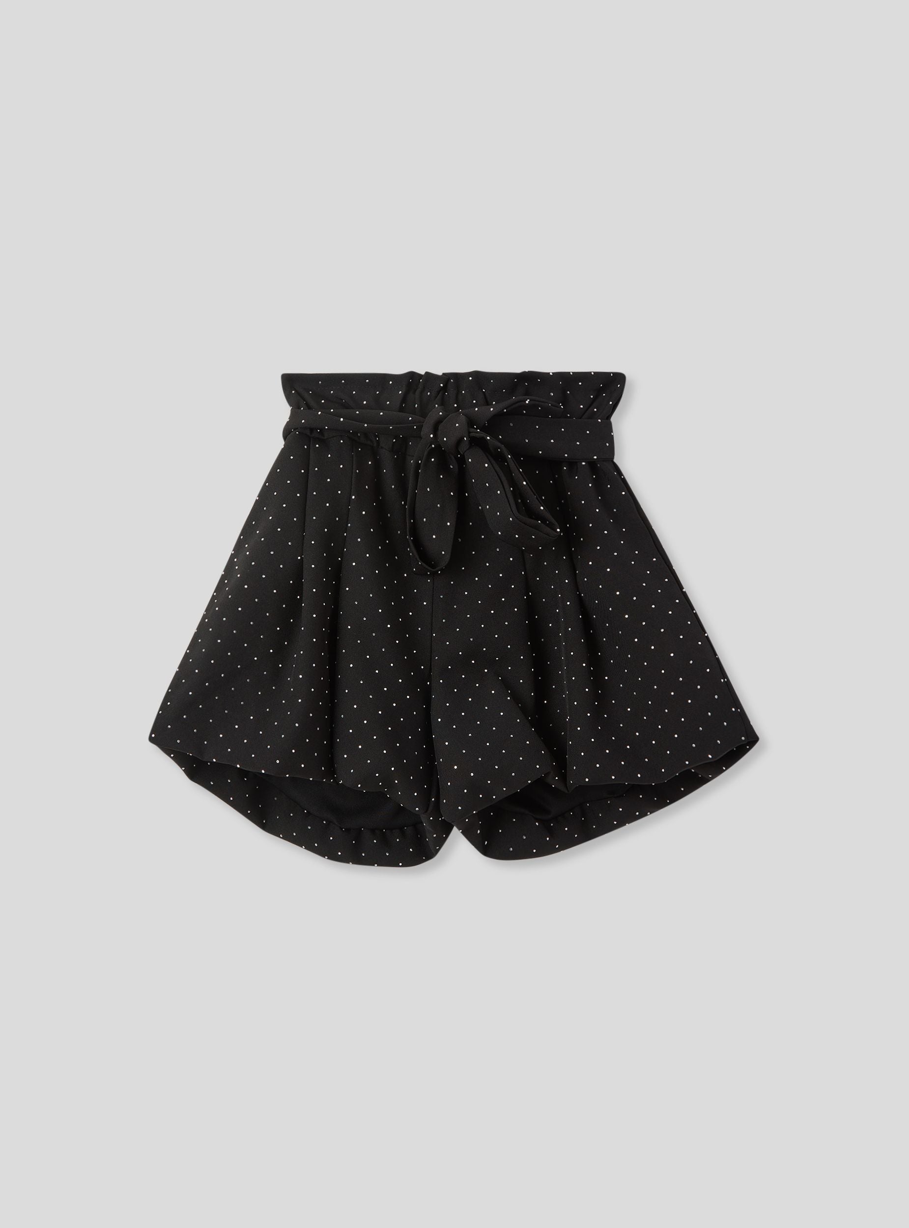 'Pantalones cortos para niña ideales para un look moderno y a la moda, perfectos para el tiempo libre o para ocasiones informales. Caracterizados por un cinturón en la cintura que se cierra como un lazo decorativo y detalles de strass, ofrecen un ajuste regular y un diseño versátil. Una prenda práctica y estilosa para completar el armario de las más pequeñas.'Detalles